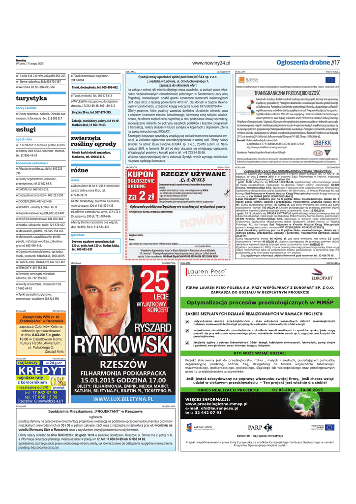 Nowiny Wtorek, 17 lutego 2015 Ogłoszenia drobne //17 www.nowiny24.pl REKLAMA A ! ! Ania 538-740-999, Julia 889-855-263 A Tynki cementowo-wapienne, A ! Nowa rudowłosa B.5; 608 730 367 694350004 A Weronika 30, tel. 888-283-566 Tynki, docieplenia, tel. 605-205-662. A Tynki, wylewki; Tel. 660 972 818 turystyka A WYLEWKA maszynowo, docieplanie stropów, 17/242-80-48; 607-160-013 obozy i kolonie A Obozy sportowe. Kolonie. Ośrodki nad morzem. Informacje - tel. 512 092 317 Zwyżka 20 m, tel. 507-174-375. Żaluzje, moskitiery, rolety. Od 19 zł! Markus-Texi, 17 854-79-63. usługi agd rtv foto A ! ! 17/8626237 naprawa pralek, kuchni A Anteny DVB-T/SAT, sprzedaż- montaż, tel. 17/856-43-19 zwierzęta rośliny ogrody Młode kurki nioski sprzedam, Markowa, tel. 609811417. budowlano-remontowe A Adaptacje poddaszy, płytki, 602 223 390 różne A Bramy segmentowe, rolowane, przemysłowe, tel.17 862 64 81 lamus A DACHY, tel. 663-563-635. bardzo dobry, cena 95 zł, tel. 17/740-20-70 A DOCIEPLENIA- 607 453 466 A Fotel rozkładany, pojemnik na pościel, A Koparko-ładowarką JCB, 602-523-487 A KOSTKA kompleksowo, 601-836-446 A Kostka- układanie, tanio; 727-570-667 Syndyk masy upadłości spółki pod firmą KOBAX sp. z o.o. z siedzibą w Lublinie, ul. Smoluchowskiego 7, zaprasza do składania ofert na zakup z wolnej ręki mienia objętego masą upadłości, w postaci prawa własności niezabudowanych nieruchomości położonych w Sandomierzu przy ulicy Pogodnej, stanowiących działki gruntu oznaczone numerami ewidencyjnymi 36/1 oraz 37/3, o łącznej powierzchni 4810 m2, dla których w Sądzie Rejonowym w Sandomierzu urządzono księgę wieczystą numer KII S/00021844/4. Oferty pisemne, które powinny zawierać dokładne określenie oferenta wraz z adresem i numerem telefonu kontaktowego, oferowaną cenę nabycia, oświadczenie, że oferent zapłaci cenę najpóźniej w dniu podpisania umowy sprzedaży, zobowiązanie oferenta do pokrycia wszelkich podatków i kosztów związanych z transakcją, należy składać w biurze syndyka w kopertach z dopiskiem „oferta na zakup nieruchomości KOBAX”. Szczegóły dotyczące sprzedaży znajdują się pod adresem www.kancelaria-empe.pl, w zakładce ogłoszenia sprzedaży/sprzedaż z wolnej ręki. Oferty należy składać na adres: Biuro syndyka KOBAX sp. z o.o., 20-016 Lublin, ul. Narutowicza 55/6, w terminie 30 dni od daty ukazania się niniejszego ogłoszenia. W razie pytań prosimy o kontakt pod nr tel. +48 723 34 45 56. Wyboru najkorzystniejszej oferty dokonuje Syndyk; wybór wymaga zatwierdzenia przez sędziego komisarza. PROMOCJA R014010616J mało używany, 220 zł, 511-524-436 A Lodówko-zamrażarka, wym. 172 x 72 x 65, sprawna, 200 zł, 731-087-616 A Narty Fischer radzieckie bez wiązań, stan idealny, 50 zł, 511-524-436 A Malowanie, gładzie, tel. 515-594-456 A Malowanie, szpachlowanie, płytki, panele, instalacje wod-kan, zabudowy g-k; tel. 605-540-344. A Ogrodzenia kompleksowo, sprzedaż: murki, pustaczki 601836446, 505431875 REKLAMA W014106821A 1SPKFLUKFTUXTQ®ÒGJOBOTPXBOZ[FÊSPEL®X6OJJ&VSPQFKTLJFKXSBNBDI1SPHSBNV8TQ®ÒQSBDZ5SBOTHSBOJD[OFK1PMTLB#JBÒPSVÊ6LSBJOB 53"/4(3"/*$;/"13;&%4*Ù#*03$;0ÇØ #JBÒPTUPDLB'VOEBDKB,T[UBÒDFOJB,BESSFBMJ[VKFPCFDOJFQSPKFLUb3P[X®KUSBOTHSBOJD[OFK XTQ®ÒQSBDZHPTQPEBSD[FK1PESFHJPOVCJBÒPTUPDLPTVXBMTLJFHPJ0CXPEVHSPE[JFâTLJFHP OB#JBÒPSVTJPSB[1PESFHJPOVLSPÊOJFâTLPQS[FNZTLJFHPJ0CXPEV[BLBSQBDLJFHPOB6LSBJOJFl XTQ®ÒGJOBOTPXBOZ[FÊSPEL®X6OJJ&VSPQFKTLJFKXSBNBDI1SPHSBNV8TQ®ÒQSBDZ5SBOTHSBOJD[ OFK1PMTLB#JBÒPSVÊ6LSBJOBXFXTQ®ÒQSBDZ[1BSUOFSFN[#JBÒPSVTJ1BâTUXPXZN 6OJXFSTZUFUFNJN+BOLJ,VQBÒZX(SPEOJFPSB[[1BSUOFSFN[6LSBJOZ'VOEBDKÓ3P[XPKV 8TQ®ÒQSBDZ5SBOTHSBOJD[OFK[6×HPSPEV(Ò®XOZNDFMFNQSPKFLUVKFTUQPQSBXBXTQ®ÒQSBDZKFEOPTUFLTBNPS[ÓEV UFSZUPSJBMOFHPPSB[NBÒZDIJÊSFEOJDIQS[FETJàCJPSTUX[PCT[BSVSFHJPO®XPCKàUZDIQSPKFLUFNQS[ZD[ZOJBKÓDBTJà EPSP[XPKVTQPÒFD[OPHPTQPEBSD[FHP1PESFHJPOVCJBÒPTUPDLPTVXBMTLJFHPJ1PESFHJPOVLSPÊOJFâTLPQS[FNZTLJFHP X1PMTDFPCXPEV[BLBSQBDLJFHPOB6LSBJOJFPSB[PCXPEVHSPE[JFâTLJFHPOB#JBÒPSVTJ1SPKFLUUSXBPEMJTUPQBEB SEPLXJFUOJBS8BSUPÊßEPGJOBOTPXBOJB6&XZOPTJFVSP[Ò Kontakt: #JBÒPTUPDLB'VOEBDKB,T[UBÒDFOJB,BES VM4Q®ÒE[JFMD[B#JBÒZTUPLUFMGBY IUUQXXXQS[FETJFCJPSD[PTDUSBOTHSBOJD[OBQM ,PPSEZOBUPS1SPKFLUV.BHEBMFOB'JDOFSNGJDOFS!CGLLQM /JOJFKT[BQVCMJLBDKB[PTUBÒBTUXPS[POBQS[ZQPNPDZ6OJJ&VSPQFKTLJFK8ZÒÓD[OÓPEQPXJFE[JBMOPÊß[B[BXBSUPÊßOJOJFKT[FKQVCMJLBDKJQPOPTJ #JBÒPTUPDLB'VOEBDKB,T[UBÒDFOJB,BESPSB[X×BEFOTQPT®COJFNP×FCZßPOBQPTUS[FHBOBKBLPPE[XJFSDJFEMFOJFQPHMÓE®X6OJJ&VSPQFKTLJFK REKLAMA Z015000185G OGŁOSZENIE O LICYTACJI OGRANICZONEGO PRAWA RZECZOWEGO Komornik Sądowy przy Sądzie Rejonowym w Krośnie Marcin Marczak (tel. 13 436 76 18) ogłasza, że dnia 3 marca 2015 r. w budynku Sądu Rejonowego w Krośnie, mającego siedzibę przy ul. Sienkiewicza 12, w sali nr 104 · godz. 13.00 odbędzie się DRUGA LICYTACJA spółdzielczego własnościowego prawa do lokalu mieszkalnego, należącego do dłużnika: Robert Czelny, położonego: 38-400 Krosno, Wróblewskiego 8/55, wpisanego w rejestrze lokali własnościowych: Krośnieńska Spółdzielnia Mieszkaniowa (adres Spółdzielni: 38-400 Krosno, ul. Wojska Polskiego 41), dla którego Sąd Rejonowy w Krośnie Wydział Ksiąg Wieczystych prowadzi księgę wieczystą o numerze KW 101464 [NKW: KS1K/00101464/1]. Lokal mieszkalny położony jest na III piętrze bloku wielorodzinnego, składa się z trzech pokoi, kuchni, łazienki i przedpokoju. Powierzchnia użytkowa lokalu: 55,15 m2. Suma oszacowania wynosi 157 500,00 zł, zaś cena wywołania jest równa 2/3 sumy oszacowania i wynosi 105 000,00 zł. Licytant przystępujący do przetargu powinien złożyć rękojmię w wysokości jednej dziesiątej sumy oszacowania, to jest 15 750,00 zł; · godz. 13.15 odbędzie się DRUGA LICYTACJA spółdzielczego własnościowego prawa do lokalu mieszkalnego, należącego do dłużników: Robert Czelny, Monika Czelny, położonego: 38-400 Krosno, Wróblewskiego 8/