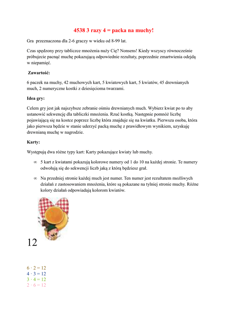4538 3 razy 4 = packa na muchy! Gra przeznaczona dla 2-6 graczy w wieku od 8-99 lat. Czas spędzony przy tabliczce mnożenia nuży Cię? Nonsens! Kiedy wszyscy równocześnie próbujecie pacnąć muchę pokazującą odpowiednie rezultaty, poprzednie zmartwienia odejdą w niepamięć. Zawartość: 6 paczek na muchy, 42 muchowych kart, 5 kwiatowych kart, 5 kwiatów, 45 drewnianych much, 2 numeryczne kostki z dziesięcioma twarzami. Idea gry: Celem gry jest jak najszybsze zebranie ośmiu drewnianych much. Wybierz kwiat po to aby ustanowić sekwencję dla tabliczki mnożenia. Rzuć kostką. Następnie pomnóż liczbę pojawiającą się na kostce poprzez liczbę która znajduje się na kwiatku. Pierwsza osoba, która jako pierwsza będzie w stanie uderzyć packą muchę z prawidłowym wynikiem, uzyskuję drewnianą muchę w nagrodzie. Karty: Występują dwa różne typy kart: Karty pokazujące kwiaty lub muchy. • 5 kart z kwiatami pokazują kolorowe numery od 1 do 10 na każdej stronie. Te numery odwołują się do sekwencji liczb jaką z którą będziesz grał. • Na przedniej stronie każdej much jest numer. Ten numer jest rezultatem możliwych działań z zastosowaniem mnożenia, które są pokazane na tylniej stronie muchy. Różne kolory działań odpowiadają kolorom kwiatów. 12 6· 4· 3· 2· 2 = 12 3 = 12 4 = 12 6 = 12 Przygotowania do gry Przed rozpoczęciem gry, wybierz sekwencję pomiędzy 1 a 10 i połóż odpowiedni numer kwiatu odkryty na stole. Następnie wybierz 10 much pokazujących na ich odwrocie mnożenie tego samego koloru co kwiat. Muchy rozłóż w przypadkowym ułożeniu w pobliżu kwiatu. Każdy zawodnik bierze packę na muchy. Pozostałe rzeczy, które nie będą ci potrzebne odłóż do pudełka. Jak grać Kto potrafi zabzyczeć najbardziej realnie, rozpoczyna grę. Jeśli nie potraficie wytypować takiej osoby wówczas najmłodszy zawodnik rozpoczyna. Wszyscy uczestnicy grają na raz. Pomnóż numer pojawiający się na kostce przez numer znajdujący się na kwiatku i szukaj odpowiedniego wyniku na muchach. Kto znajdzie odpowiednią muchę powinien jak najszybciej ją pacnąć. Jeśli inni zawodnicy uważają, że właściwa much nie była jeszcze trafiona wówczas może kontynuować szukanie. Uwaga: Każdy zawodnik może tylko raz użyć swoje packi w jednej rundzie i muszą ją odłożyć jak tylko dotknęli swojej wybranej muchy. Jak tylko wszyscy gracze wybrali swoje muchy i odłożyli swoje packi na nie, sprawdzacie wyniki. Sprawdzanie: Odwróć wszystkie muchy na których były położone packi. Spójrz na tabliczkę z mnożeniem i szukaj takiego równania które pokazuje numer i kolor kwiatu oraz numer na kostce. • Zawodnik który jako pierwszy położył swoją packę na właściwej musze otrzymuje drewnianą muchę w nagrodę. • Jeśli nikt nie pacnął właściwej muchy, nikt nie otrzymuje nagrody. Po wszystkim, następny gracz rzuca kostką. Wszyscy ponownie biorą swoje packi w dłonie. Rozpoczyna się następna runda. Koniec gry Gra kończy się jak tylko którakolwiek z osób zbierze 8 drewnianych much.