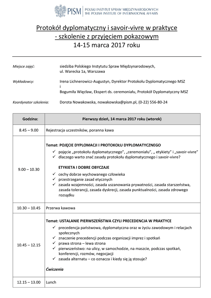 Protokół dyplomatyczny i savoir-vivre w praktyce - szkolenie z przyjęciem pokazowym 14-15 marca 2017 roku Miejsce zajęć: siedziba Polskiego Instytutu Spraw Międzynarodowych, ul. Warecka 1a, Warszawa Wykładowcy: Irena Lichnerowicz-Augustyn, Dyrektor Protokołu Dyplomatycznego MSZ i Bogumiła Więcław, Ekspert ds. ceremoniału, Protokół Dyplomatyczny MSZ Koordynator szkolenia: Dorota Nowakowska, [email protected], (0-22) 556-80-24 Godzina: 8.45 – 9.00 Pierwszy dzień, 14 marca 2017 roku (wtorek) Rejestracja uczestników, poranna kawa Temat: POJĘCIE DYPLOMACJI I PROTOKOŁU DYPLOMATYCZNEGO pojęcie „protokołu dyplomatycznego”, „ceremoniału”, „ etykiety” i „savoir-vivre” dlaczego warto znać zasady protokołu dyplomatycznego i savoir-vivre? ETYKIETA I DOBRE OBYCZAJE 9.00 – 10.30 cechy dobrze wychowanego człowieka przestrzeganie zasad etycznych zasada wzajemności, zasada uszanowania prywatności, zasada starszeństwa, zasada tolerancji, zasada dyskrecji, zasada punktualności, zasada zdrowego rozsądku 10.30 – 10.45 Przerwa kawowa Temat: USTALANIE PIERWSZEŃSTWA CZYLI PRECEDENCJA W PRAKTYCE 10.45 – 12.15 precedencja państwowa, dyplomatyczna oraz w życiu zawodowym i relacjach społecznych znaczenie precedencji podczas organizacji imprez i spotkań prawa strona – lewa strona pierwszeństwo: na ulicy, w samochodzie, na maszcie, podczas spotkań, konferencji, rozmów, negocjacji zasada alternatu – co oznacza i kiedy się ją stosuje? Ćwiczenia 12.15 – 13.00 Lunch Temat: NAWIĄZYWANIE KONTAKTÓW 13.00 – 14.30 pierwsze wrażenie pozdrawianie powitanie i pożegnania uścisk dłoni, podawanie rąk, całowanie w rękę tzw. powitania „dyplomatyczne” przedstawianie się i przedstawianie innych formy kurtuazyjne w rozmowie i tytułowanie jak być ciekawym rozmówcą, co warto wiedzieć o tzw. „small talk” sztuka aktywnego słuchania CODZIENNY SAVOIR-VIVRE 14.30 – 14.45 telefoniczny savoir-vivre korespondencja elektroniczna tzw. netykieta mowa ciała – rzeczy, które warto wiedzieć sytuacje niezręczne i faux pas - jak się zachować? Przerwa kawowa Temat: UBIÓR 14.45 – 16.15 ogólne zasady ubierania się – co oznacza „być dobrze ubranym” strój do pracy – co oznacza pojęcie „dress code”? czy pracodawca może wymagać od pracowników określonego stroju? strój w podróży służbowej okazja a ubiór (przyjęcia służbowe, spotkania towarzyskie, uroczystości rodzinne i inne) ubiór niestosowny – podstawowe uchybienia pań i panów Godzina: 8.45 – 9.00 Drugi dzień, 15 marca 2017 roku (środa) Poranna kawa Temat: KORESPONDENCJA – CO POWINNISMY WIEDZIEĆ 9.00 – 10.30 podstawowe zasady korespondencji zasadnicze części listu oficjalnego, służbowego i prywatnego cechy stylu urzędowego tytulatura a tytułomania zasady redagowania pism Ćwiczenia 10.30 – 10.45 Przerwa kawowa Temat: WIZYTY SŁUŻBOWE I DELEGACJE – ORGANIZACJA I OBSŁUGA ELEMENTY MIĘDZYNARODOWEGO SAVOIR – VIVRE 10.45 – 12.15 rodzaje wizyt: państwowe, oficjalne i robocze, resortowe, biznesowe i inne przygotowanie i realizacja programu: redakcja, podział obowiązków i koordynacja działań, zarządzanie czasem „infrastruktura” – finanse, transport i zakwaterowanie, tłumacze elementy zasadnicze: rozmowy i negocjacje, wizyty i spotkania, sporządzanie i podpisywanie umów, konferencje prasowe i wywiady, zwiedzanie firmy, przyjęcia i posiłki elementy dodatkowe: program prywatny, kulturalno-rozrywkowy, współmałżonkowie kwiaty i upominki (czym się kierować przy wyborze) różnice kulturowe: mowa ciała- największe rozbieżności (gest, dystans interpersonalny, powitania, kontakt fizyczny i wzrokowy), punktualność, tempo negocjacji, religia (ubiór, modlitwa), kulinaria (różnice, diety), podejście do kobiet, hierarchia Ćwiczenia 12.15 – 12.30 Przerwa kawowa Temat: BILETY WIZYTOWE rodzaje i funkcje zasady używania wizytówek korespondencja za pomocą wizytówek wizytówki przy kwiatach i upominkach 12.30 – 14.00 SPOTKANIA I PRZYJĘCIA – ORGANIZACJA I UCZESTNICZENIE formy przyjęć i ich rola zaproszenia – redagowanie i odczytywanie Ćwiczenia 14.00 – 14.30 Przerwa 14.30 – 16.00 PRZYJĘCIE POKAZOWE I ROZDANIE DYPLOMÓW