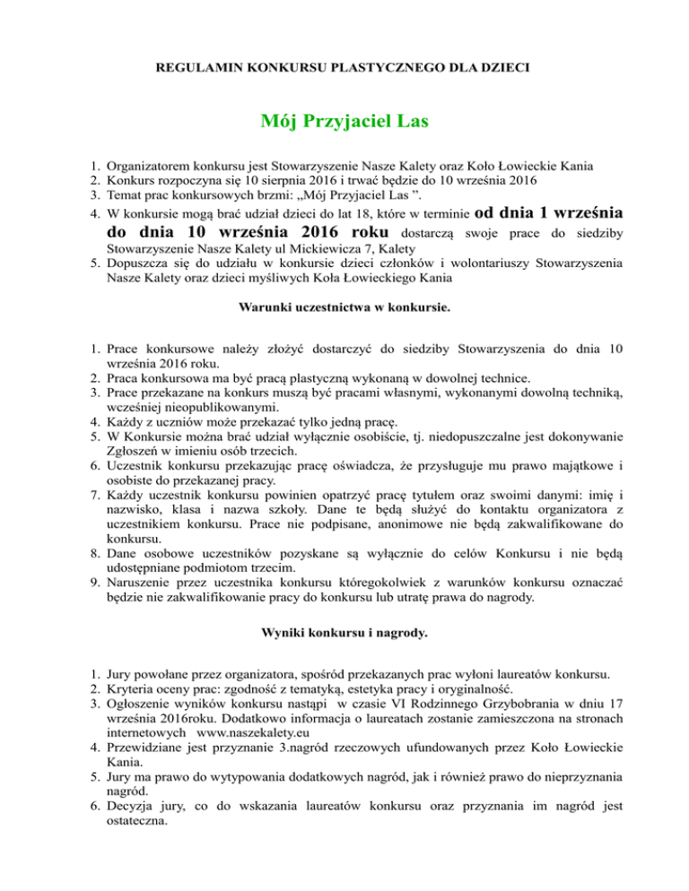 REGULAMIN KONKURSU PLASTYCZNEGO DLA DZIECI Mój Przyjaciel Las 1. 2. 3. 4. Organizatorem konkursu jest Stowarzyszenie Nasze Kalety oraz Koło Łowieckie Kania Konkurs rozpoczyna się 10 sierpnia 2016 i trwać będzie do 10 września 2016 Temat prac konkursowych brzmi: „Mój Przyjaciel Las ”. W konkursie mogą brać udział dzieci do lat 18, które w terminie od dnia 1 września do dnia 10 września 2016 roku dostarczą swoje prace do siedziby Stowarzyszenie Nasze Kalety ul Mickiewicza 7, Kalety 5. Dopuszcza się do udziału w konkursie dzieci członków i wolontariuszy Stowarzyszenia Nasze Kalety oraz dzieci myśliwych Koła Łowieckiego Kania Warunki uczestnictwa w konkursie. 1. Prace konkursowe należy złożyć dostarczyć do siedziby Stowarzyszenia do dnia 10 września 2016 roku. 2. Praca konkursowa ma być pracą plastyczną wykonaną w dowolnej technice. 3. Prace przekazane na konkurs muszą być pracami własnymi, wykonanymi dowolną techniką, wcześniej nieopublikowanymi. 4. Każdy z uczniów może przekazać tylko jedną pracę. 5. W Konkursie można brać udział wyłącznie osobiście, tj. niedopuszczalne jest dokonywanie Zgłoszeń w imieniu osób trzecich. 6. Uczestnik konkursu przekazując pracę oświadcza, że przysługuje mu prawo majątkowe i osobiste do przekazanej pracy. 7. Każdy uczestnik konkursu powinien opatrzyć pracę tytułem oraz swoimi danymi: imię i nazwisko, klasa i nazwa szkoły. Dane te będą służyć do kontaktu organizatora z uczestnikiem konkursu. Prace nie podpisane, anonimowe nie będą zakwalifikowane do konkursu. 8. Dane osobowe uczestników pozyskane są wyłącznie do celów Konkursu i nie będą udostępniane podmiotom trzecim. 9. Naruszenie przez uczestnika konkursu któregokolwiek z warunków konkursu oznaczać będzie nie zakwalifikowanie pracy do konkursu lub utratę prawa do nagrody. Wyniki konkursu i nagrody. 1. Jury powołane przez organizatora, spośród przekazanych prac wyłoni laureatów konkursu. 2. Kryteria oceny prac: zgodność z tematyką, estetyka pracy i oryginalność. 3. Ogłoszenie wyników konkursu nastąpi w czasie VI Rodzinnego Grzybobrania w dniu 17 września 2016roku. Dodatkowo informacja o laureatach zostanie zamieszczona na stronach internetowych www.naszekalety.eu 4. Przewidziane jest przyznanie 3.nagród rzeczowych ufundowanych przez Koło Łowieckie Kania. 5. Jury ma prawo do wytypowania dodatkowych nagród, jak i również prawo do nieprzyznania nagród. 6. Decyzja jury, co do wskazania laureatów konkursu oraz przyznania im nagród jest ostateczna. 7. Nagrody rzeczowe nie podlegają zamianie na inne nagrody rzeczowe, ani na ich równowartość pieniężną. Postanowienia końcowe. 1. Przekazując pracę na konkurs, uczestnik zgadza się na ekspozycję pracy, oraz na opublikowanie fotografii prac na stronach internetowych i innych publikacjach związanych z konkursem i VI Rodzinnym Grzybobranie. 2. Autorzy zgadzają się na publikowanie zwycięskich prac na wszelkich polach eksploatacji. 3. Biorąc udział w konkursie, uczestnik akceptuje jego regulamin. 4. Regulamin niniejszego konkursu będzie dostępny na stronie www.naszekalety.eu 5. Przekazując pracę na konkurs, uczestnik potwierdza, że wyraża zgodę na zasady zawarte w niniejszym regulaminie. 6. Organizator zastrzega sobie prawo do: a) zmiany postanowień niniejszego regulaminu w przypadku zmian przepisów prawnych lub innych istotnych zdarzeń mających wpływ na organizowanie Konkursu. b) odstąpienia od organizowania konkursu bez podania przyczyny, c) nierozstrzygnięcia konkursu w przypadku zbyt małej ilości przekazanych prac, d) rozstrzygania w kwestiach nieuregulowanych postanowieniami regulaminu.