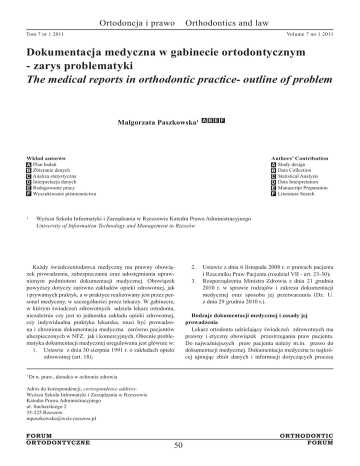 Ortodoncja i prawo Orthodontics and law Tom 7 nr 1 2011 Volume 7 no 1 2011 Dokumentacja medyczna w gabinecie ortodontycznym - zarys problematyki The medical reports in orthodontic practice- outline of problem Małgorzata Paszkowska1 A B E F Wkład autorów – Plan badań A – Zbieranie danych B – Analiza statystyczna C – Interpretacja danych D E– Redagowanie pracy F– Wyszukiwanie piśmiennictwa 1 Authors’ Contribution – Study design A – Data Collection B – Statistical Analysis C – Data Interpretation D E– Manuscript Preparation F– Literature Search Wyższa Szkoła Informatyki i Zarządzania w Rzeszowie Katedra Prawa Administracyjnego University of Information Technology and Management in Rzeszów Każdy świadczeniodawca medyczny ma prawny obowiązek prowadzenia, zabezpieczania oraz udostępniania uprawnionym podmiotom dokumentacji medycznej. Obowiązek powyższy dotyczy zarówno zakładów opieki zdrowotnej, jak i prywatnych praktyk, a w praktyce realizowany jest przez personel medyczny, w szczególności przez lekarzy. W gabinecie, w którym świadczeń zdrowotnych udziela lekarz ortodonta, niezależnie czy jest to jednostka zakładu opieki zdrowotnej, czy indywidualna praktyka lekarska, musi być prowadzona i chroniona dokumentacja medyczna zarówno pacjentów ubezpieczonych w NFZ, jak i komercyjnych. Obecnie problematyka dokumentacji medycznej uregulowana jest głównie w: 1. Ustawie z dnia 30 sierpnia 1991 r. o zakładach opieki zdrowotnej (art. 18); 1 2. Ustawie z dnia 6 listopada 2008 r. o prawach pacjenta i Rzeczniku Praw Pacjenta (rozdział VII - art. 23-30); 3. Rozporządzeniu Ministra Zdrowia z dnia 21 grudnia 2010 r. w sprawie rodzajów i zakresu dokumentacji medycznej oraz sposobu jej przetwarzania (Dz. U. z dnia 29 grudnia 2010 r.). Rodzaje dokumentacji medycznej i zasady jej prowadzenia Lekarz ortodonta udzielający świadczeń zdrowotnych ma prawny i etyczny obowiązek przestrzegania praw pacjenta. Do najważniejszych praw pacjenta należy m.in. prawo do dokumentacji medycznej. Dokumentacja medyczna to najkrócej ujmując zbiór danych i informacji dotyczących procesu Dr n. praw., doradca w ochronie zdrowia Adres do korespondencji, correspondence address: Wyższa Szkoła Informatyki i Zarządzania w Rzeszowie Katedra Prawa Administracyjnego ul. Sucharskiego 2 35-225 Rzeszów [email protected] ForumOrthodontic Ortodontyczneforum 50 Ortodoncja i prawo Orthodontics and law Tom 7 nr 1 2011 Volume 7 no 1 2011 udzielania świadczeń zdrowotnych zawierający oznaczenie świadczeniodawcy i pacjenta. Nowe rozporządzenie z 2010 r. utrzymało klasyczny i dotychczas stosowany podział normatywny dokumentacji medycznej na dokumentację: indywidualną oraz zbiorczą. Dokumentacja indywidualna to dokumentacja odnosząca się do poszczególnych pacjentów korzystających ze świadczeń zdrowotnych (w praktyce prowadzona jest dla każdego pacjenta osobno). W ramach dokumentacji indywidualnej wyodrębnia się dokumentację: 1. indywidualną wewnętrzną (np. historia choroby, historia zdrowia i choroby), 2. indywidualną zewnętrzną (np. skierowanie na badanie diagnostyczne lub konsultację, orzeczenie, opinia lekarska). Dokumentacja indywidualna wewnętrzna jest przeznaczona na potrzeby podmiotu udzielającego świadczeń zdrowotnych (np. NZOZ). Natomiast dokumentacja indywidualna zewnętrzna jest przeznaczona na potrzeby pacjenta korzystającego ze świadczeń zdrowotnych udzielanych przez podmiot. W dokumentacji indywidualnej wewnętrznej należy obowiązkowo dokonać wpisu o wydaniu dokumentacji indywidualnej zewnętrznej lub załączyć jej kopie. Dokumentacja zbiorcza to dokumentacja medyczna odnosząca się do ogółu pacjentów lub określonych grup pacjentów korzystających ze świadczeń zdrowotnych (np. księgi przyjęć). Jeśli chodzi o konkretne rodzaje prowadzonej dokumentacji indywidualnej i zbiorczej, to zależą one od rodzaju świadczeniodawcy (np. ZOZ czy indywidualna praktyka) i profilu świadczeń. Przykładowo pracownia protetyki stomatologicznej i ortodoncji musi prowadzić dokumentację: 1. zbiorczą w formie księgi pracowni, 2. indywidualną w formie karty zlecenia. Lekarz ortodonta udzielający świadczeń zdrowotnych w ramach indywidualnej praktyki lekarskiej albo grupowej praktyki lekarskiej prowadzi dokumentację indywidualną, która obejmuje dokumentację: wewnętrzną w formie historii zdrowia i choroby oraz zewnętrzną w formie skierowania do szpitala lub innego podmiotu, skierowania na badania diagnostyczne lub konsultacje, zaświadczenia, orzeczenia lub opinii lekarskiej. Artykuł 18 ustawy o zakładach opieki zdrowotnej obliguje każdy ZOZ (tj. publiczny i niepubliczny) do prowadzenia dokumentacji medycznej swoich pacjentów, czyli osób korzystających ze świadczeń zdrowotnych danego ZOZ-u. Każde świadczenie zdrowotne udzielone przez ZOZ powinno być zatem stosownie opisane w dokumentacji medycznej. Ponadto artykuł 41 ustawy o zawodzie lekarza i lekarza dentysty stanowi, że lekarz ma obowiązek prowadzenia indywidualnej dokumentacji medycznej pacjenta. Zgodnie z artykułem 25 ustawy o prawach pacjenta i Rzeczniku Praw Pacjenta z 2008 r. dokumentacja medyczna musi zawierać co najmniej: 1. oznaczenie pacjenta, pozwalające na ustalenie jego tożsamości: a) nazwisko i imię (imiona), b) datę urodzenia, c) oznaczenie płci, d) adres miejsca zamieszkania, e) numer PESEL, jeżeli został nadany, a w przypadku osób, które nie mają nadanego numeru PESEL - rodzaj i numer dokumentu potwierdzającego tożsamość, • f) w przypadku gdy pacjentem jest osoba małoletnia, całkowicie ubezwłasnowolniona - nazwisko i imię przedstawiciela ustawowego oraz adres jego miejsca zamieszkania; 3. oznaczenie podmiotu udzielającego świadczeń zdrowotnych ze wskazaniem komórki organizacyjnej, w której udzielono świadczeń zdrowotnych; 4. opis stanu zdrowia pacjenta lub udzielonych mu świadczeń zdrowotnych; 5. datę sporządzeni