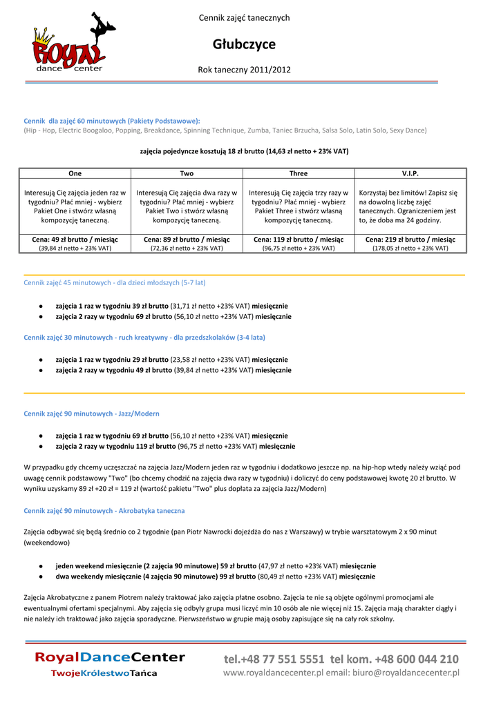 Cennik zajęd tanecznych Głubczyce Rok taneczny 2011/2012 Cennik dla zajęd 60 minutowych (Pakiety Podstawowe): (Hip - Hop, Electric Boogaloo, Popping, Breakdance, Spinning Technique, Zumba, Taniec Brzucha, Salsa Solo, Latin Solo, Sexy Dance) zajęcia pojedyncze kosztują 18 zł brutto (14,63 zł netto + 23% VAT) One Two Three V.I.P. Interesują Cię zajęcia jeden raz w tygodniu? Pład mniej - wybierz Pakiet One i stwórz własną kompozycję taneczną. Interesują Cię zajęcia dwa razy w tygodniu? Pład mniej - wybierz Pakiet Two i stwórz własną kompozycję taneczną. Interesują Cię zajęcia trzy razy w tygodniu? Pład mniej - wybierz Pakiet Three i stwórz własną kompozycję taneczną. Korzystaj bez limitów! Zapisz się na dowolną liczbę zajęd tanecznych. Ograniczeniem jest to, że doba ma 24 godziny. Cena: 49 zł brutto / miesiąc Cena: 89 zł brutto / miesiąc Cena: 119 zł brutto / miesiąc Cena: 219 zł brutto / miesiąc (39,84 zł netto + 23% VAT) (72,36 zł netto + 23% VAT) (96,75 zł netto + 23% VAT) (178,05 zł netto + 23% VAT) Cennik zajęd 45 minutowych - dla dzieci młodszych (5-7 lat) zajęcia 1 raz w tygodniu 39 zł brutto (31,71 zł netto +23% VAT) miesięcznie zajęcia 2 razy w tygodniu 69 zł brutto (56,10 zł netto +23% VAT) miesięcznie Cennik zajęd 30 minutowych - ruch kreatywny - dla przedszkolaków (3-4 lata) zajęcia 1 raz w tygodniu 29 zł brutto (23,58 zł netto +23% VAT) miesięcznie zajęcia 2 razy w tygodniu 49 zł brutto (39,84 zł netto +23% VAT) miesięcznie Cennik zajęd 90 minutowych - Jazz/Modern zajęcia 1 raz w tygodniu 69 zł brutto (56,10 zł netto +23% VAT) miesięcznie zajęcia 2 razy w tygodniu 119 zł brutto (96,75 zł netto +23% VAT) miesięcznie W przypadku gdy chcemy uczęszczad na zajęcia Jazz/Modern jeden raz w tygodniu i dodatkowo jeszcze np. na hip-hop wtedy należy wziąd pod uwagę cennik podstawowy "Two" (bo chcemy chodzid na zajęcia dwa razy w tygodniu) i doliczyd do ceny podstawowej kwotę 20 zł brutto. W wyniku uzyskamy 89 zł +20 zł = 119 zł (wartośd pakietu "Two" plus dopłata za zajęcia Jazz/Modern) Cennik zajęd 90 minutowych - Akrobatyka taneczna Zajęcia odbywad się będą średnio co 2 tygodnie (pan Piotr Nawrocki dojeżdża do nas z Warszawy) w trybie warsztatowym 2 x 90 minut (weekendowo) jeden weekend miesięcznie (2 zajęcia 90 minutowe) 59 zł brutto (47,97 zł netto +23% VAT) miesięcznie dwa weekendy miesięcznie (4 zajęcia 90 minutowe) 99 zł brutto (80,49 zł netto +23% VAT) miesięcznie Zajęcia Akrobatyczne z panem Piotrem należy traktowad jako zajęcia płatne osobno. Zajęcia te nie są objęte ogólnymi promocjami ale ewentualnymi ofertami specjalnymi. Aby zajęcia się odbyły grupa musi liczyd min 10 osób ale nie więcej niż 15. Zajęcia mają charakter ciągły i nie należy ich traktowad jako zajęcia sporadyczne. Pierwszeostwo w grupie mają osoby zapisujące się na cały rok szkolny. Cennik zajęd tanecznych Głubczyce Rok taneczny 2011/2012 Cennik dla zajęd 120 minutowych Salsa & Rueda de Casino - zajęcia w parach prowadzone przez dwóch instruktorów. Cena za 1 miesiąc (4 kolejne zajęcia) Karnet 3 miesięczny (12 kolejnych zajęd) Cena za pojedyncze wejście Cena podstawowa 109 zł brutto (88,62 zł netto + 23% VAT) 289 zł brutto (234,96 zł netto + 23% VAT) 30 zł brutto (24,39 zł netto + 23% VAT) Posiadacz Pakietu One, Two lub Three 89 zł brutto (72,36 zł netto + 23% VAT) 249 zł brutto (202,44 zł netto + 23% VAT) 25 zł brutto (20,32 zł netto + 23% VAT) Taniec sportowy Jeśli reprezentujesz RDC na zawodach krajowych lub międzynarodowych otrzymujesz statut Tancerza Royal. Poniższy cennik został przygotowany specjalnie dla Ciebie. Royal One Interesują Cię zajęcia jeden raz w tygodniu? Pład mniej - wybierz Pakiet One i stwórz własną kompozycję taneczną. Cena: 49 zł brutto / miesiąc Royal Two Interesują Cię zajęcia dwa razy w tygodniu? Pład mniej - wybierz Pakiet Two i stwórz własną kompozycję taneczną. Cena: 79 zł brutto / miesiąc Royal Three Interesują Cię zajęcia trzy razy w tygodniu? Pład mniej - wybierz Pakiet Three i stwórz własną kompozycję taneczną. Cena: 109 zł brutto / miesiąc (39,84 zł netto + 23% VAT) (64,23 zł netto + 23% VAT) (88,62 zł netto + 23% VAT) Royal V.I.P. Korzystaj bez limitów! Zapisz się na dowolną liczbę zajęd tanecznych. Ograniczeniem jest to, że doba ma 24 godziny. Cena: 199 zł brutto / miesiąc (161,79 zł netto + 23% VAT) Uwaga! Tancerzy sportowych nie obowiązuje oferta specjalna „Twoja Paczka”. Promocje i oferty specjalne są dostępne na stronie royaldancecenter.pl Zapraszamy Cennik obowiązuje od 12.09.2011 do odwołania