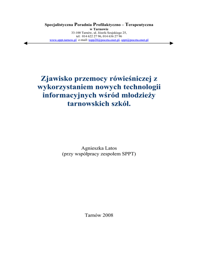 Specjalistyczna Poradnia Profilaktyczno – Terapeutyczna w Tarnowie 33-100 Tarnów, ul. Józefa Szujskiego 25, tel: 014 622 27 96, 014 636 27 96 www.sppt.tarnow.pl e-mail: [email protected], [email protected] Zjawisko przemocy rówieśniczej z wykorzystaniem nowych technologii informacyjnych wśród młodzieży tarnowskich szkół. Agnieszka Latos (przy współpracy zespołem SPPT) Tarnów 2008 - Wstęp Na temat przemocy rówieśniczej powstała ogromna ilość badań, opracowań i analiz psychologicznych, socjologicznych, społecznych. Można nawet czasem odnieść wrażenie przesytu informacjami dotyczącymi tej problematyki Poniższa publikacja poświęcona jest szczególnemu rodzajowi przemocy, dotąd chyba najmniej opisanemu i poznanemu, a mianowicie – cyberprzemocy. Ten rodzaj przemocy wraz z postępującą rewolucją informacyjną, nabiera ostatnio na sile i niestety poszerza swój zakres. Powszechny dostęp do Internetu oraz sieci komórkowych, oprócz ogromnych możliwości, stwarza także okazje do nadużyć. Poniższa publikacja przedstawia zjawisko cyberprzemocy wśród młodzieży uczącej się w Tarnowie. I. Czym jest cyberprzemoc? – zakres badań. Pojęcie to ma kilka swoich definicji, najkrócej możemy powiedzieć, że cyberprzemoc to przemoc z użyciem technologii informacyjnych i komunikacyjnych (w głównej mierze jest to Internet i telefonia komórkowa). Inna nazwa na to zjawisko, która w Polsce jest mniej znana, to cyberbullying (z ang. słowo bullying oznacza znęcanie się, tyranizowanie, szykanowanie. Słowo to zawiera w sobie mocny ładunek emocjonalny). Zazwyczaj oba pojęcia stosuje się względem nieletnich. Cechami charakterystycznymi cyberprzemocy (w porównaniu z innymi rodzajami przemocy) są: trudność w wykryciu sprawcy (anonimowość sprawcy), często ofiara może pozostawać w nieświadomości swojej roli, poza tym w przeciwieństwie do np. przemocy fizycznej w nie jest konieczna przewaga siły- sprawca może bowiem działać z ukrycia, poprzez co formy cyberprzemocy stają się coraz bardziej wyrafinowane. Do najczęściej wyróżnianych form w jakich przejawia się cyberprzemoc należą: Flame - to obraźliwa wiadomość, przesłana na forum internetowym, czacie, zazwyczaj prowokująca do negatywnych reakcji. Osoba wysyłająca taką wiadomość czeka na czyjąś odpowiedź, by wdać się z tą osobę w ostrą wymianę zdań. Często ma to swoje dalsze konsekwencje np. sprawca rozpoczyna potem wysyłanie obraźliwych e-maili dotyczących wyglądu lub charakteru użytkownika. Ten rodzaj cyberprzemocy nie trwa zbyt długo, zazwyczaj kończy się, kiedy ofiara przestaje odpowiadać na maile i zaczepki na forum lub czacie. Zazwyczaj osoby między którymi dochodzi do wymiany zdań nie znają się osobiście. Celowy atak w Internecie lub poprzez komórkę skierowany na konkretną osobę. W takiej sytuacji zazwyczaj sprawca i ofiara znają się osobiście- cyberprzemoc ma wtedy bardzo osobisty charakter (sprawca może znać intymne szczegóły z życia ofiary) przez co bardzo mocno uderza w ofiarę. Cyberprzemoc może być rozszerzeniem przemocy stosowanej w prawdziwym świecie lub odwrotnie. Przykładami takiej przemocy mogą być: smsy lub mmsy rozsyłane po znajomych z obraźliwymi treściami na temat ofiary, umieszczanie obraźliwych zdjęć lub filmików (bez zgody ofiary, najczęściej bez wiedzy osoby, której to dotyczy) na portalach społecznościowych typu: grono.pl, nasza-klasa.pl, fotka.pl, portalach na których można umieszczać pliki filmowe lub zdjęcia typu youtube.com, wrzuta.pl. Czasami dręczyciele tworzą nawet specjalne strony internetowe poświęcone swoim ofiarom, na których publikują obraźliwe uwagi, prywatne informacje lub zdjęcia, nie tylko ofiary ale również jej rodziny lub znajomych. 2 Obraźliwe komentarze na blogach i profilach ofiar w portalach społecznościowych (nasza klasa, grono, epuls itp.). Mogą to być przykre komentarze pod wypowiedziami na blogach, nieprzyjemne uwagi pod zdjęciami, obraźliwe wpisy do księgi gości na osobistych stronach www, a także obraźliwe wpisy na szkolnych stronach WWW i forach . Takie komentarze lub wpisy zazwyczaj można łatwo usunąć, jednakże zanim się to zrobi mogą wyrządzić już sporo szkód. Podszywanie się pod kogoś w Internecie. Sprawcy podszywają się pod kogoś na czatach, forum, portalach społecznościowych, komunikatorach typu gg, a nawet na portalach aukcyjnych itd. Zazwyczaj podszycie się pod kogoś nie jest trudne, sprzyja temu anonimowość sieci, a także niefrasobliwe zachowania samych użytkowników np. poprzez automatyczne zapamiętywanie haseł dostępu, pozostawianie otwartych sesji na ogólnie dostępnych komputerach (szkolne pracownie informatyczne, kawiarenki internetowe). II. Badania ankietowe wśród uczniów W maju 2008 roku zostały przeprowadzone ankiety wśród uczniów tarnowskich szkół na temat cyberprzemocy. Ankietę wypełniło 575 uczniów (wśród nich uczniowie mieszkający i uczący się w Tarnowie oraz uczniowie spoza Tarnowa, uczący się w Tarnowie). Szkoły w których były przeprowadzane ankiety były losowo wybierane na każdym poziomie nauczania (podstawowym, gimnazjalnym, ponadgimanzjalnym). W badaniach nacisk został położony na przemoc rówieśniczą z wykorzystaniem nowych technologii informacyjnych. Obejmuje ona min. dręczenie, straszenie, obrażanie przez telefon komórkowy, smsy, emaile, komunikatory typu gg; umieszczanie w Internecie i rozsyłanie obraźliwych i krzywdzących dla innych zdjęć, filmików, informacji Należy pamiętać, że badania poniżej przedstawione dotyczą tylko wycinka problematyki związanej z zagrożeniami jakie płyną z korzystania z nowych technologii informacyjnych. Nie obejmują one takich zjawisk jak: niedozwolone treści w Internecie, zagrożenia płynące z gier komputerowych, zwłaszcza tych online, wykorzystywania dzieci w Internecie itd. 1. Cel badań Celem główny