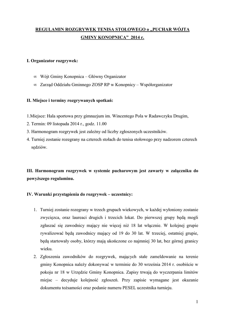 REGULAMIN ROZGRYWEK TENISA STOŁOWEGO o „PUCHAR WÓJTA GMINY KONOPNICA” 2014 r. I. Organizator rozgrywek: • Wójt Gminy Konopnica – Główny Organizator • Zarząd Oddziału Gminnego ZOSP RP w Konopnicy – Współorganizator II. Miejsce i terminy rozgrywanych spotkań: 1.Miejsce: Hala sportowa przy gimnazjum im. Wincentego Pola w Radawczyku Drugim, 2. Termin: 09 listopada 2014 r., godz. 11.00 3. Harmonogram rozgrywek jest zależny od liczby zgłoszonych uczestników. 4. Turniej zostanie rozegrany na czterech stołach do tenisa stołowego przy nadzorem czterech sędziów. III. Harmonogram rozgrywek w systemie pucharowym jest zawarty w załączniku do powyższego regulaminu. IV. Warunki przystąpienia do rozgrywek – uczestnicy: 1. Turniej zostanie rozegrany w trzech grupach wiekowych, w każdej wyłoniony zostanie zwycięzca, oraz laureaci drugich i trzecich lokat. Do pierwszej grupy będą mogli zgłaszać się zawodnicy mający nie więcej niż 18 lat włącznie. W kolejnej grupie rywalizować będą zawodnicy mający od 19 do 30 lat. W trzeciej, ostatniej grupie, będą startowały osoby, którzy mają ukończone co najmniej 30 lat, bez górnej granicy wieku. 2. Zgłoszenia zawodników do rozgrywek, mających stałe zameldowanie na terenie gminy Konopnica należy dokonywać w terminie do 30 września 2014 r. osobiście w pokoju nr 18 w Urzędzie Gminy Konopnica. Zapisy trwają do wyczerpania limitów miejsc – decyduje kolejność zgłoszeń. Przy zapisie wymagane jest okazanie dokumentu tożsamości oraz podanie numeru PESEL uczestnika turnieju. 1 3. W rozgrywkach nie mogą brać udziału osoby nie objęte ubezpieczeniem NW, 6. Każdy uczestnik rozgrywek powinien charakteryzować się dobrym stanem zdrowia, organizator rozgrywek nie ponosi żadnej odpowiedzialności prawnej za wypadki wynikające z udziału w rozgrywkach osób chorych oraz skutki tych wypadków przed, po i w czasie gry, 7. Organizator nie ponosi żadnej odpowiedzialności prawnej i cywilnej, w zakresie poniesionych szkód w mieniu zawodników biorących udział w rozgrywkach, V. Ustalenia organizacyjne: 1. Wszyscy zawodnicy zobowiązani są do przestrzegania niniejszego regulaminu. 2. Organizator jest w pełni odpowiedzialny za następujące przygotowanie do rozgrywek: • udostępnienie hali sportowej, • udostępnienie piłeczek do rozgrywania turnieju tenisa stołowego • zapewnienie obsługi sędziowskiej 3. Organizator zapewnia zawodnikom rozgrywającym turniej szatnię; Organizator zwraca się z prośbą o pozostawienie szatni w stanie należytego porządku, 4. Organizator nie odpowiada za rzeczy pozostawione w szatni. 5. Organizator zastrzega sobie prawo ostatecznej interpretacji wszelkich kwestii spornych. 6. Podczas rozgrywek obowiązuje całkowity zakaz palenia i spożywania alkoholu. 7. W przypadku przekroczenia niniejszego regulaminu, decyzje w sprawie podejmuje Organizator, a uczestnik dostosuje się do decyzji bez prawa odwołania. VI. Obowiązki drużyn i zawodników: 1. Obowiązki uczestnika turnieju: • lista zgłoszeniowa obowiązuje do końca trwania rozgrywek bez możliwości dokonywania zmian, • zawodnicy zobowiązani są do posiadania strojów sportowych oraz obuwia sportowego, tzw. „halówek” oraz rakietki do ping ponga • każdy zawodnik zobowiązany jest do zapoznania się z niniejszym regulaminem i terminarzem rozgrywek. Nieznajomość ich nie będzie traktowana jako wytłumaczenie 2 ich nieprzestrzegania, • każdy z zawodników winien posiadać dokument potwierdzający jego tożsamość i okazać go organizatorowi na każde jego wezwanie oraz okazać przeciwnikowi na jego uzasadnioną prośbę, • 5 minut przed rozpoczęciem spotkania każdy zawodnik zobowiązany jest do sprawdzenia zgodności wpisu do protokołu i podpisania go po zakończeniu spotkania w obecności sędziego, VII. Sędziowie: 1. Każde spotkanie w ramach turnieju sędziować będą sędziowie stołowi. 2. Organizator zapewnia obsługę sędziowską na każde spotkanie – sędzia prowadzi jednoosobowo całe spotkanie i podejmuje ostateczne decyzje w sprawach spornych. 3. Sędzia obsługuje tablicę z punktacją i spisuje uproszczony protokół spotkania. 4. Sędzia spotkania podpisuje po jego zakończeniu protokół z meczu w obecności zawodników. VIII. Weryfikacja: 1. Weryfikacje zawodników przeprowadza organizator, na podstawie protokółów spotkań. 2. Ocena gry o mistrzostwo jest następująca • za każde wygrane zawodnik otrzymuje 3 pkt i tym samym przechodzi do następnej fazy rozgrywek, zawodnik przegrany odpada z turnieju, 3 Harmonogram rozgrywek zostanie ustalony przed zawodami i dostępnym w dzień zawodów dla uczestników turnieju. 4. Spotkanie zostanie zweryfikowane jako walkower, gdy: 3 • zawodnik z własnej winy nie stawi się na spotkanie, lub spóźni się więcej niż 5 minut, • zawodnik dozna kontuzji uniemożliwiającej mu dalszy udział w rozgrywkach, • zawodnik sam zrezygnuje z dalszej gry w spotkaniu i tym samym w całym turnieju. X. Wyróżnienia: 1 Nagrodami i pucharami zostaną uhonorowani zawodnicy, którzy zajmą trzy pierwsze lokaty w klasyfikacji końcowej w każdej z grup. Nagrodą dla trzech zwycięzców będą tablety 1,6 GHz RAM 2048 MB, za zdobycie drugich miejsc przewidziane są odtwarzacze MP4 pamięć 8GB z wyświetlaczem kolorowym LCD 2 cale , natomiast dla osób, które zajmą miejsca trzecie będą to pendrivy 16 GB USB 3.0. XI. Przepisy gry: 1. Spotkania rozgrywane będą zgodnie z przepisami gry w tenisa stołowego zatwierdzonymi przez Polski Związek Tenisa Stołowego, z przedstawionymi w niniejszym regulaminie zmianami i Uzupełnieniami. 2. Mecz jest rozgrywany do dwóch wygranych setów, każdy set do 11 punktów. 3. W trakcie trwania rozgrywek obowiązuje zasada „fair – play”, 4. Protokół meczu musi być wypełniony przed każdym meczem, prawidłowość zapisów potwierdza każdy zawodnik własnym podpisem. Zawodnik spóźniony wię