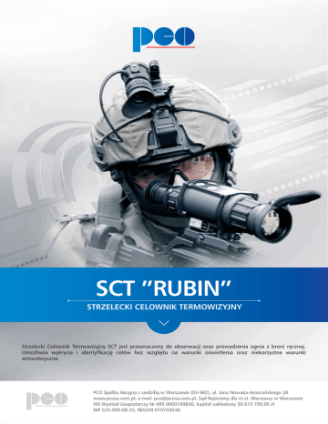 SCT ”RUBIN” STRZELECKI CELOWNIK TERMOWIZYJNY Strzelecki Celownik Termowizyjny SCT jest przeznaczony do obserwacji oraz prowadzenia ognia z broni ręcznej. Umożliwia wykrycie i identyfikację celów bez względu na warunki oświetlenia oraz niekorzystne warunki atmosferyczne. PCO Spółka Akcyjna z siedzibą w Warszawie (03-982), ul. Jana Nowaka-Jeziorańskiego 28 www.pcosa.com.pl, e-mail: [email protected], Sąd Rejonowy dla m.st. Warszawy w Warszawie XIII Wydział Gospodarczy Nr KRS 0000169830, kapitał zakładowy 30 610 790,00 zł NIP 525-000-08-25, REGON 010743638. SCT ”RUBIN” Obraz termowizyjny jest wyświetlany we wbudowanym okularze, który wyłącza się automatycznie po odsunięciu oka przez strzelca. Mechanizm ten eliminuje efekt oświetlania twarzy. Celownik SCT jest dodatkowo wyposażony w zewnętrzny wyświetlacz nahełmowy dający strzelcowi dużą swobodę operowania celownikiem w pewnej odległości od oka (np.: możliwość prowadzenia obserwacji i strzelań „zza węgła”). Celownik posiada funkcję oszczędzania energii. Cechy wyróżniające produkt: • wyrób oferowany jest w komplecie z wyświetlaczem nahełmowym, umożliwiającym prowadzenie obserwacji oraz strzelań „zza węgła”, • celownik SCT może pracować do 12 godzin (praca ciągła), co w widoczny sposób wyróżnia go na tle konkurencji, • daleki zasięg obserwacji – do ok. 2000 m. Nagrody i wyróżnienia: Dane Techniczne • DEFENDER 2009 (przyznany przez Kapitułę podczas MSPO) Zakres spektralny 8÷12 μm Typ detektora niechłodzona matryca mikrobolometryczna 288 x 384 pikseli NETD =< 0,1 °C (w temperaturze otoczenia +25 °C) Pole widzenia 5,5°(V) x 7,5°(H) Elektroniczny zoom 2x Zakres ogniskowania od 3 m do Odległość identyfikacji celu typu osoba 1200 m Wyświetlacz 800 x 600 pikseli Zakres ruchu dioptryjnego - 4 ÷ +2 dpt Czas gotowości do pracy <30s Zasilanie 6,5 V ÷ 10,8 V DC, 300 mA Zalecane źródło zasilania 6 x 1.2V NiCd akumulator (AA) > 940mAh lub dowolne baterie (AA) Wyjście video PAL 768 x 576 pikseli Interfejs danych RS485 Temperatura pracy od -32°C do +44°C Wymiary (Dł.) / (Szer.) /(Wys.) 309mm / 87mm / 111 mm Waga (z bateriami) <1,3 kg WYŚWIETLACZ NAHEŁMOWY: Wymiary (Dł.) /(Szer.) / (Wys.) 92mm / 45mm / 60mm Waga <0,3 kg Zakres ruchu dioptryjnego -4 ÷ +2 dpt Zasilanie z celownika SCT