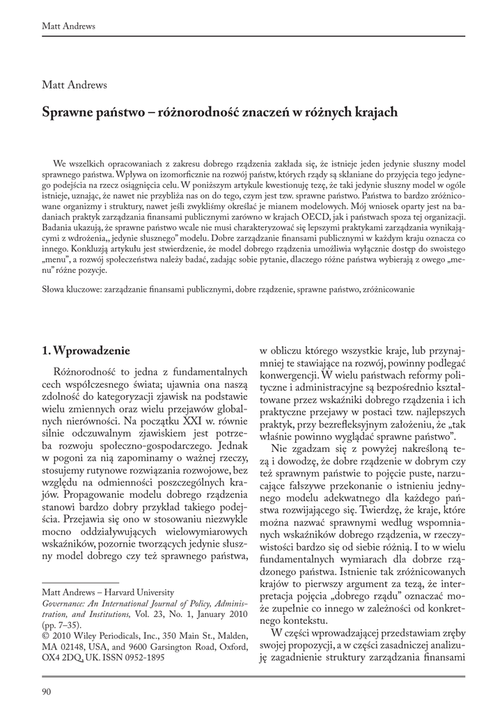 Matt Andrews Matt Andrews Sprawne państwo – różnorodność znaczeń w różnych krajach We wszelkich opracowaniach z zakresu dobrego rządzenia zakłada się, że istnieje jeden jedynie słuszny model sprawnego państwa. Wpływa on izomoricznie na rozwój państw, których rządy są skłaniane do przyjęcia tego jedynego podejścia na rzecz osiągnięcia celu. W poniższym artykule kwestionuję tezę, że taki jedynie słuszny model w ogóle istnieje, uznając, że nawet nie przybliża nas on do tego, czym jest tzw. sprawne państwo. Państwa to bardzo zróżnicowane organizmy i struktury, nawet jeśli zwykliśmy określać je mianem modelowych. Mój wniosek oparty jest na badaniach praktyk zarządzania inansami publicznymi zarówno w krajach OECD, jak i państwach spoza tej organizacji. Badania ukazują, że sprawne państwo wcale nie musi charakteryzować się lepszymi praktykami zarządzania wynikającymi z wdrożenia,, jedynie słusznego” modelu. Dobre zarządzanie inansami publicznymi w każdym kraju oznacza co innego. Konkluzją artykułu jest stwierdzenie, że model dobrego rządzenia umożliwia wyłącznie dostęp do swoistego „menu”, a rozwój społeczeństwa należy badać, zadając sobie pytanie, dlaczego różne państwa wybierają z owego „menu” różne pozycje. Słowa kluczowe: zarządzanie inansami publicznymi, dobre rządzenie, sprawne państwo, zróżnicowanie 1. Wprowadzenie Różnorodność to jedna z fundamentalnych cech współczesnego świata; ujawnia ona naszą zdolność do kategoryzacji zjawisk na podstawie wielu zmiennych oraz wielu przejawów globalnych nierówności. Na początku XXI w. równie silnie odczuwalnym zjawiskiem jest potrzeba rozwoju społeczno-gospodarczego. Jednak w pogoni za nią zapominamy o ważnej rzeczy, stosujemy rutynowe rozwiązania rozwojowe, bez względu na odmienności poszczególnych krajów. Propagowanie modelu dobrego rządzenia stanowi bardzo dobry przykład takiego podejścia. Przejawia się ono w stosowaniu niezwykle mocno oddziaływujących wielowymiarowych wskaźników, pozornie tworzących jedynie słuszny model dobrego czy też sprawnego państwa, Matt Andrews – Harvard University Governance: An International Journal of Policy, Administration, and Institutions, Vol. 23, No. 1, January 2010 (pp. 7–35). © 2010 Wiley Periodicals, Inc., 350 Main St., Malden, MA 02148, USA, and 9600 Garsington Road, Oxford, OX4 2DQ, UK. ISSN 0952-1895 90 w obliczu którego wszystkie kraje, lub przynajmniej te stawiające na rozwój, powinny podlegać konwergencji. W wielu państwach reformy polityczne i administracyjne są bezpośrednio kształtowane przez wskaźniki dobrego rządzenia i ich praktyczne przejawy w postaci tzw. najlepszych praktyk, przy bezreleksyjnym założeniu, że „tak właśnie powinno wyglądać sprawne państwo”. Nie zgadzam się z powyżej nakreśloną tezą i dowodzę, że dobre rządzenie w dobrym czy też sprawnym państwie to pojęcie puste, narzucające fałszywe przekonanie o istnieniu jednynego modelu adekwatnego dla każdego państwa rozwijającego się. Twierdzę, że kraje, które można nazwać sprawnymi według wspomnianych wskaźników dobrego rządzenia, w rzeczywistości bardzo się od siebie różnią. I to w wielu fundamentalnych wymiarach dla dobrze rządzonego państwa. Istnienie tak zróżnicowanych krajów to pierwszy argument za tezą, że interpretacja pojęcia „dobrego rządu” oznaczać może zupełnie co innego w zależności od konkretnego kontekstu. W części wprowadzającej przedstawiam zręby swojej propozycji, a w części zasadniczej analizuję zagadnienie struktury zarządzania inansami Sprawne państwo – różnorodność znaczeń w różnych krajach publicznymi (public inance management – PFM) w wybranych 38 państwach. Struktury PFM to kluczowy element układu rządzenia. Dobre rządzenie odnosi się także do PFM. Analiza danych z ostatniego badania OECD dotyczącego praktyk i procedur budżetowych ukazuje jednak, że państwa, które możemy uznać za dobre lub sprawne: (1) nie odznaczają się cechami charakterystycznymi dla dobrego rządzenia w stopniu wyższym niż pozostałe kraje oraz (2) bardzo różnią się między sobą. Uznaję, że wnioski te stanowią wstępny dowód słuszności mojej propozycji badawczej, i nawołuję do dalszych prac, by lepiej zrozumieć, dlaczego sprawne państwa działają w sposób zróżnicowany, dokonując wyboru pozycji z pewnego „menu”, zamiast traktować je jak składniki koniecznego kompleksowego modelu. Uważam, że odpowiedź na to pytanie będzie miała większe znaczenie dla krajów usiłujących poprawić swoją sprawność niż omawianie modnych w danej chwili modeli dobrego rządzenia. 2. Obserwacje i propozycje na temat sprawnego państwa Koncepcja dobrego rządzenia zyskała na znaczeniu w ubiegłej dekadzie, przyczyniając się do powstania wielu wskaźników i komentarzy dotyczących tego modelu. (Arndt, Oman 2006; Boivard, Loffler 2003; Grindle 2004; Hood, Dixon, Beeston 2008; Knack, Kugler, Manning 2003; Kurtz, Schrank 2007; La Porta et al. 1999; Rotberg, Gisselquist 2008; Rothstein, Teorell 2008). Większość stara się określić, co ma być osią strukturalnej charakterystyki państwa i powiązanych z tym efektów uznanych za istotne dla rozwoju. Światowe wskaźniki rządzenia (he World Governance Indicators – WGI) wprowadzają miernik „sprawność państwa” (np. Kaufmann, Kraay, Mastruzzi 2007; Kaufmann, Kraay, Zoido-Lobaton 1999). Wskaźniki (WGI oraz inne) silnie izomoricznie oddziałują na myślenie o tym, czym jest sprawne państwo (zob. Arndt, Oman, Goldsmith 2007). Rozważania akademickie, spory praktyków oraz propozycje reform uzyskują legitymizację poprzez utożsamienie z mitem zakładającym, że struktury formalne odzwierciedlone w danych wskaźni- kach zapewniają racjonalne środki prowadzące do osiągnięcia pożądanych celów – w tym przypadku do rozwoju (Meyer, Ro