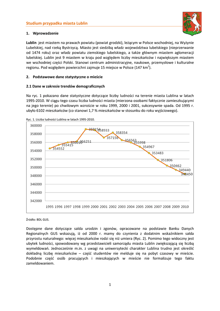 Studium przypadku miasta Lublin 1. Wprowadzenie Lublin jest miastem na prawach powiatu (powiat grodzki), leżącym w Polsce wschodniej, na Wyżynie Lubelskiej, nad rzeką Bystrzycą. Miasto jest siedzibą władz województwa lubelskiego (nieprzerwanie od 1474 roku) oraz władz powiatu ziemskiego lubelskiego, a także głównym miastem aglomeracji lubelskiej. Lublin jest 9 miastem w kraju pod względem liczby mieszkańców i największym miastem we wschodniej części Polski. Stanowi centrum administracyjne, naukowe, przemysłowe i kulturalne regionu. Pod względem powierzchni zajmuje 15 miejsce w Polsce (147 km2). 2. Podstawowe dane statystyczne o mieście 2.1 Dane w zakresie trendów demograficznych Na ryc. 1 pokazano dane statystyczne dotyczące liczby ludności na terenie miasta Lublina w latach 1995-2010. W ciągu tego czasu liczba ludności miasta (mierzona osobami faktycznie zamieszkującymi na jego terenie) po chwilowym wzroście w roku 1999, 2000 i 2001, sukcesywnie spada. Od 1995 r. ubyło 6102 mieszkańców (co stanowi 1,7 % mieszkańców w stosunku do roku wyjściowego). Ryc. 1. Liczba ludności Lublina w latach 1995-2010. Źródło: BDL GUS. Dostępne dane dotyczące salda urodzin i zgonów, opracowane na podstawie Banku Danych Regionalnych GUS wskazują, iż od 2000 r. mamy do czynienia z dodatnim wskaźnikiem salda przyrostu naturalnego: więcej mieszkańców rodzi się niż umiera (Ryc. 2). Pomimo tego widoczny jest ubytek ludności, spowodowany wg przedstawicieli samorządu miasta Lublin zwiększającą się liczbą wymeldowań. Jednocześnie m.in. z uwagi na uniwersytecki charakter Lublina trudno jest określić dokładną liczbę mieszkańców – część studentów nie melduje się na pobyt czasowy w mieście. Podobnie część osób pracujących i mieszkających w mieście nie formalizuje tego faktu zameldowaniem. 1 Ryc. 2 Urodzenia i zgodny w Lublinie w latach 1995-2010 r. Źródło: BDL GUS. W aktualizacji Strategii Rozwoju Lublina zawarta została prognoza liczby mieszkańców miasta (ryc. 3), natomiast brak jest prognozy salda urodzeń i zgonów na najbliższe lata. Według powyższego zestawienia w 2030 roku należy się spodziewać dalszego sukcesywnego spadku liczby mieszkańców do poziomu 297 100 mieszkańców, co stanowiło będzie 16,2% populacji z roku bazowego (1995). Ryc. 3 Prognoza liczby mieszkańców Lublina do 2030 roku w tys. Źródło: Strategią Rozwoju Miasta Lublin, Cześć pierwsza – diagnoza stanu wyjściowego, wrzesień 2008. Odnośnie do migracji, na ryc. 4 przedstawiono saldo migracji wewnątrz wojewódzkiej, czyli ruch ludności między Lublinem a gminami wewnątrz województwa, przede wszystkim gminami ościennymi. 2 Ryc. 4 Saldo migracji wewnątrzwojewódzkiej 1995-2010. Źródło: BDL GUS Od 2000 r. saldo migracji dla Lublina jest ujemne. Co charakterystyczne przy ciągłej tendencji spadkowej zanotowano lata w których wskaźnik ten ulegał wyraźnemu zmniejszeniu. Być może jest to związane z faktem stosunkowo niskiej ceny mieszkań w Lublinie i wzrostem zainteresowania osiedlania się w mieście. Podsumowując, wpływ na ubytek ludności w Lublinie, wobec dodatniego salda przyrostu naturalnego, zasadniczy wpływ mają migracje poza miasto. 2.2 Dane dotyczące atrakcyjności osiedleńczej Przyjęto, iż atrakcyjność osiedleńczą opisać można wskaźnikami dotyczącymi: dostępności do atrakcyjnego zatrudnienia, edukacji, ochrony zdrowia, kultury i rozrywki, sportu i rekreacji, ceny mieszkań, dostępności komunikacyjnej i dostępu do infrastruktury publicznej, a także stanu środowiska naturalnego i ładu społecznego. Dostępność do atrakcyjnego zatrudnienia mierzyć można stopą bezrobocia rejestrowanego. W tej chwili w Lublinie wynosi ono 16 080 osób i stanowi w tej chwili 7 % ludności w wieku produkcyjnym (ryc. 4). Od 2003 r. bezrobocie w Lublinie sukcesywnie spadało, a od 2005r. z powrotem zanotowano jego wzrost. Zjawisko to można tłumaczyć z jednej strony poprawą sytuacji na rynku pracy z uwzględnieniem wahnięcia, spowodowanego kryzysem gospodarczym, trwającym od 2008 r., z drugiej strony zmniejszaniem się liczby mieszkańców, w tym populacji czynnej zawodowo. 3 Ryc. 5 Bezrobocie rejestrowe. U góry: dane w wartościach bezwzględnych. U dołu: odsetek bezrobotnych wśród ludności aktywnej zawodowo. Źródło: BDL GUS. Dostęp do edukacji mierzyć można liczbą szkół wyższych oraz liczbą studentów szkól wyższych na 10 tys. mieszkańców. W Lublinie siedzibę ma 5 uczelni publicznych oraz 9 uczelni niepublicznych. W BDR brak jest w tej chwili danych dotyczących liczby studentów dla miasta Lublina. W tej chwili (rok akademicki 2010/2011) na uczelniach w województwie lubelskim kształci się 84 221 studentów (na 10 000 mieszkańców w województwie przypada 472 studentów i 476 studentów w kraju. Dostęp do opieki zdrowotnej zmierzono liczbę ludności na łóżko w szpitalach ogólnych. Podobnie jak w przypadku dostępu do edukacji BDL GUS nie podaje wartości dla miasta a jedynie dla województwa lubelskiego i wskaźnik ten wynosi 160 osób na 1 łóżko, przy 211 osobach w skali kraju. 4 Atrakcyjność osiedleńczą w sferze kultury i rozrywki określono przy pomocy liczby instytucji muzycznych i teatrów. W Lublinie funkcjonuje 2 teatry dramatyczne, 1 teatr muzyczny oraz 1 teatr lalkowy. W skali województwa instytucje te stanowią ponad 90 % wszystkich instytucji muzycznych i teatrów. Przypada w nich 1241 osób na 1 miejsce na salach teatrów i filharmonii (wobec 525,02 osób w kraju). Lublinianie mają do dyspozycji 64 obiekty sportowo-rekreacyjne, w tym 6 stadionów, 15 boisk i 2 kryte pływalnie (co oznacza średnio 2 obiekty sportowe na 10 tys. mieszkańców). Średnia cena mieszkania na rynku wtórnym wynosi około 5197 zł za metr kwadratowy i średnio dla całego Lublina kupno jednego metra kwadratowego stanowi 190,7 % średniego miesięcznego wynagrodzenia brutto w mieście (2