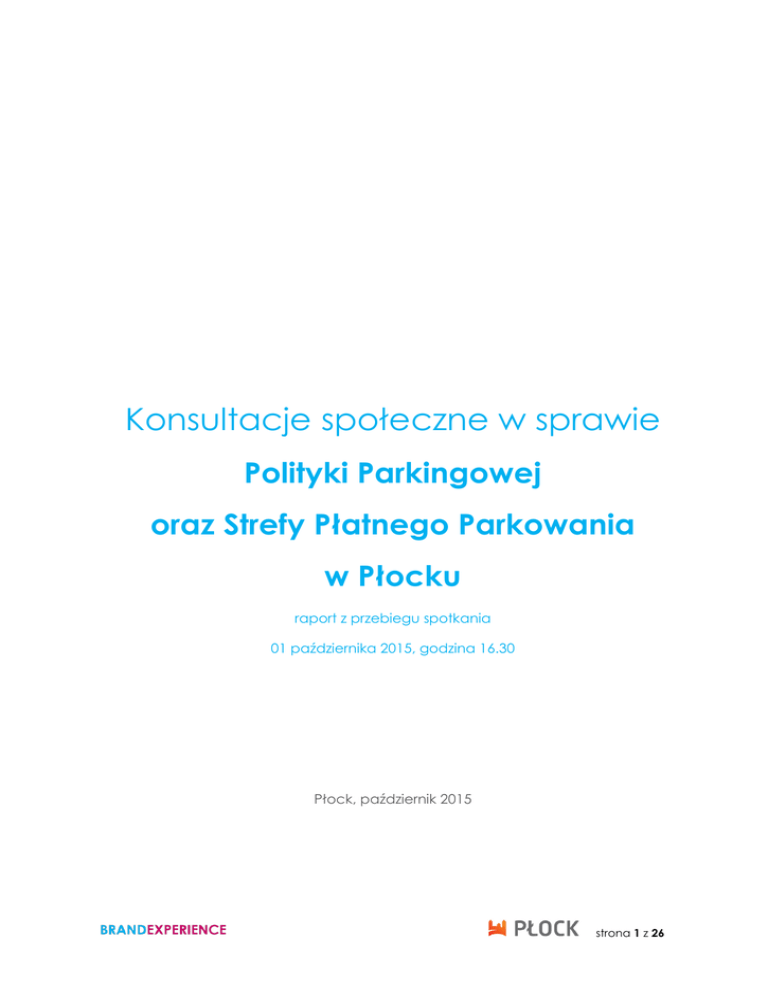 Konsultacje społeczne w sprawie Polityki Parkingowej oraz Strefy Płatnego Parkowania w Płocku raport z przebiegu spotkania 01 października 2015, godzina 16.30 Płock, październik 2015 strona 1 z 26 Dnia 1 października 2015 roku w auli Liceum Ogólnokształcącego im. Marsz. St. Małachowskiego w godzinach 16.30 –20.00, odbyła się debata miejska będą podsumowaniem pierwszego etapu konsultacji społecznych dotyczących dokumentu „Polityki parkingowej” oraz pomysłu wprowadzenia na centrum Połocka Płatnej Strefy Parkowania (dalej SPP) jako jednego z elementów polityki parkingowej. Celem spotkania było: przekazanie informacje na temat zmian w głównych założeniach „Polityki parkingowej” dla miasta Płocka jakie zostały wprowadzone w oparciu o dane z pierwszego etapu konsultacji społecznych trwających od końca czerwca 2015, zebranie opinii i sugestii obywateli co do zmodyfikowanych założeń Polityki parkingowej oraz wstępnej propozycji SPP, wypracowanie wspólnie z interesariuszami optymalnego kształtu SPP oraz zasad korzystania z niej. W spotkaniu udział wzięło 52 przedstawicieli różnych grup interesariuszy, których lista stanowi załącznik do raportu i zawiera dane 44 uczestników (poza wymienionymi udział wzięło jeszcze 8 osób, które nie wpisały się na listę (w tym przedstawiciele UM Płocka). Podczas spotkania reprezentowani byli przedstawiciele następujących grup interesariuszy: mieszkańców oraz osoby pracujące centrum Płocka – 20 osoby, przedsiębiorców -12 osób, NGO – sów - 5 osoba, mediów – 2 media, Rady Miasta - 4 osoba, Innych grup - 3 osoby, Urzędu Miasta – 6 osób, w tym m.in. Prezydent Miasta Andrzej Nowakowski, Z-ca Prezydent Miasta Jacek Terebus, Dyrektor Wydziału Rozwoju i Polityki Gospodarczej Miasta Aneta Pomianowska oraz Kierownik w/w wydziału Piotr Niesłuchowski. W spotkaniu brał także zewnętrzny ekspert ds. polityki parkingowej Pan Jacek Theim z firmy Biuro Inżynierii Transportu z Poznania (dalej BIT). Moderatorem spotkania był Rafał Janowicz przedstawiciel firmy Brand Experience (zewnętrzny ekspert ds. konsultacji). Przebieg spotkania był rejestrowany o czym uczestnicy spotkania zostali powiadomieni. Czas trwania spotkania 3 godziny 32 minut. strona 2 z 26 Przebieg spotkania był następujący: 1. Spotkanie otworzył Prezydent Miasta Pan Andrzej Nowakowski, który przypomniał główne cele prowadzonych konsultacji oraz spotkania. W trakcie swojego wystąpienie wskazał, że: głównym celem konsultacji jest: a. przekazanie wszystkim zainteresowanym informacje na temat: o głównych założeń „Polityki parkingowej” dla miasta Płocka, o wstępnej koncepcji Strefy Płatnego Parkowania (SPP) w Płocku, b. zebranie opinii, wątpliwości i sugestii interesariuszy (mieszkańców, przedsiębiorców, instytucji, NGO-sów, etc.) co do założeń Polityki parkingowej oraz wstępnej propozycji SPP (w tym określenie silnych i słabych stron, pól korekt i poprawy w prezentowanych założeniach), c. wspólne z interesariuszami wypracowanie optymalnego kształtu polityki parkingowej i ewentualnego kształtu SPP (o ile znajdzie ona akceptację mieszkańców). na tym etapie konsultacji ważne jest aby dyskutować czy zapisy „Polityki parkingowej” są zgodne z oczekiwaniami mieszkańców/ przedsiębiorców, temat jest podnoszony po to aby poprawić jakość życia w mieście, władze miasta są otwarte na dyskusję i zależy im aby uczestnicy spotkania wskazywali co wg nich jest dobrym rozwiązaniem, a co nie oraz sugerowali korekty i zmiany, Zarząd miasta rekomenduje wprowadzenie SPP, bowiem widzi w tym jeden z elementów poprawy sytuacji parkingowej oraz jakości życia mieszkańców (różnych ich grup). przedstawicielom Urzędu Miasta zależy na tym, aby Rada Miasta przed podjęciem decyzji poznał opinie mieszkańców i dlatego organizowane są konsultacje, proces konsultacji jest prowadzony różnymi metodami (spotkania konsultacyjne, zbieranie opinii przez internet, ilościowe badania reprezentatywne) aby jak największa liczba osób mogła w nich wziąć udział. d. W tym m.in. ustalenie czy Płoczczanie zaakceptują wprowadzenie strefy jako elementu polityki parkingowej? w sytuacji akceptacji dla SPP ustalenie i wspólne zaprojektowanie z obywatelami m.in.: jak mają wyglądać strefy płatnego parkowania? Mają być tylko na starówce, czy także w centrum? Jak ma funkcjonować SPP? Jak kształtować system opłat w SPP – ile powinna wynosić opłata za parkowanie? Kto będzie musiał ją ponosić?, etc. strona 3 z 26 2. Moderator spotkania: a. przedstawił program spotkania b. zasady obowiązujące podczas spotkania c. oraz przypomniał ramowy plan procesu konsultacji: 3. Następnie głos zabrał Z-ca Prezydent Miasta Pan Jacek Terebus,, który przedstawił prezentację „Polityka Parkingowa Miasta Płocka. Weryfikacja założeń w oparciu o proces konsultacji społecznych” (załącznik nr 2 do raport). 4. Po zakończeniu w/w prezentacji nastąpiła dyskusja z uczestnikami dotycząca dalszej formy spotkania: a. część obecnych stwierdziła, że nie akceptuje zaproponowanej formuły konsultacji (praca w grupach +debata ogólna + praca w grupach+ debata podsumowująca ) i chce ją zamienić na forma wspólnej debaty wszystkich uczestników spotkania na sali plenarnej b. wniosek został poddany głosowaniu - za propozycją zmiany programu była większość obecnych. Dalsza część spotkania była burzliwa i trwała 2 godziny i 40 minut, a uczestnicy spotkania chętnie się wypowiadali. Poniżej prezentujemy zapisz przebiegu tej części spotkania . W transkrypcji „W” oznaczono wypowiedzi uczestników zadających pytania , składających wnioski, a „O” odpowiedzi organizatorów. Niestety w zapisie mogą się pojawić braki danych co do tożsamości osób wypowiadających (bowiem nie wszyscy się przedstawiali) oraz zniekształcenia nazwiska (bowiem nagrania czasami są niew