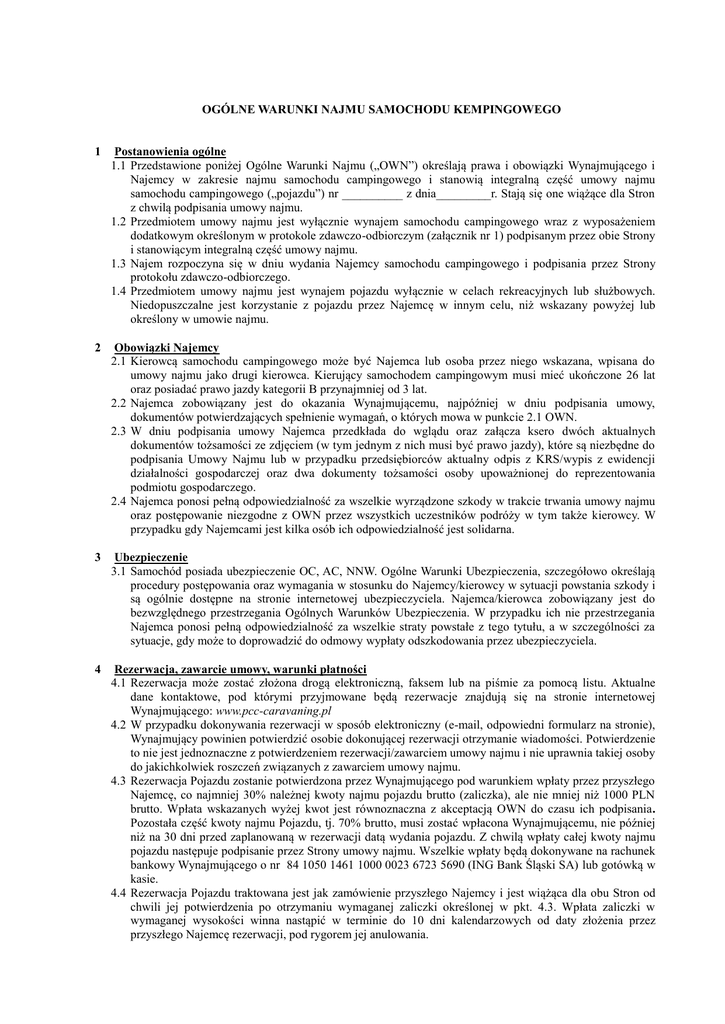 OGÓLNE WARUNKI NAJMU SAMOCHODU KEMPINGOWEGO 1 Postanowienia ogólne 1.1 Przedstawione poniżej Ogólne Warunki Najmu („OWN”) określają prawa i obowiązki Wynajmującego i Najemcy w zakresie najmu samochodu campingowego i stanowią integralną część umowy najmu samochodu campingowego („pojazdu”) nr __________ z dnia_________r. Stają się one wiążące dla Stron z chwilą podpisania umowy najmu. 1.2 Przedmiotem umowy najmu jest wyłącznie wynajem samochodu campingowego wraz z wyposażeniem dodatkowym określonym w protokole zdawczo-odbiorczym (załącznik nr 1) podpisanym przez obie Strony i stanowiącym integralną część umowy najmu. 1.3 Najem rozpoczyna się w dniu wydania Najemcy samochodu campingowego i podpisania przez Strony protokołu zdawczo-odbiorczego. 1.4 Przedmiotem umowy najmu jest wynajem pojazdu wyłącznie w celach rekreacyjnych lub służbowych. Niedopuszczalne jest korzystanie z pojazdu przez Najemcę w innym celu, niż wskazany powyżej lub określony w umowie najmu. 2 Obowiązki Najemcy 2.1 Kierowcą samochodu campingowego może być Najemca lub osoba przez niego wskazana, wpisana do umowy najmu jako drugi kierowca. Kierujący samochodem campingowym musi mieć ukończone 26 lat oraz posiadać prawo jazdy kategorii B przynajmniej od 3 lat. 2.2 Najemca zobowiązany jest do okazania Wynajmującemu, najpóźniej w dniu podpisania umowy, dokumentów potwierdzających spełnienie wymagań, o których mowa w punkcie 2.1 OWN. 2.3 W dniu podpisania umowy Najemca przedkłada do wglądu oraz załącza ksero dwóch aktualnych dokumentów tożsamości ze zdjęciem (w tym jednym z nich musi być prawo jazdy), które są niezbędne do podpisania Umowy Najmu lub w przypadku przedsiębiorców aktualny odpis z KRS/wypis z ewidencji działalności gospodarczej oraz dwa dokumenty tożsamości osoby upoważnionej do reprezentowania podmiotu gospodarczego. 2.4 Najemca ponosi pełną odpowiedzialność za wszelkie wyrządzone szkody w trakcie trwania umowy najmu oraz postępowanie niezgodne z OWN przez wszystkich uczestników podróży w tym także kierowcy. W przypadku gdy Najemcami jest kilka osób ich odpowiedzialność jest solidarna. 3 Ubezpieczenie 3.1 Samochód posiada ubezpieczenie OC, AC, NNW. Ogólne Warunki Ubezpieczenia, szczegółowo określają procedury postępowania oraz wymagania w stosunku do Najemcy/kierowcy w sytuacji powstania szkody i są ogólnie dostępne na stronie internetowej ubezpieczyciela. Najemca/kierowca zobowiązany jest do bezwzględnego przestrzegania Ogólnych Warunków Ubezpieczenia. W przypadku ich nie przestrzegania Najemca ponosi pełną odpowiedzialność za wszelkie straty powstałe z tego tytułu, a w szczególności za sytuacje, gdy może to doprowadzić do odmowy wypłaty odszkodowania przez ubezpieczyciela. 4 Rezerwacja, zawarcie umowy, warunki płatności 4.1 Rezerwacja może zostać złożona drogą elektroniczną, faksem lub na piśmie za pomocą listu. Aktualne dane kontaktowe, pod którymi przyjmowane będą rezerwacje znajdują się na stronie internetowej Wynajmującego: www.pcc-caravaning.pl 4.2 W przypadku dokonywania rezerwacji w sposób elektroniczny (e-mail, odpowiedni formularz na stronie), Wynajmujący powinien potwierdzić osobie dokonującej rezerwacji otrzymanie wiadomości. Potwierdzenie to nie jest jednoznaczne z potwierdzeniem rezerwacji/zawarciem umowy najmu i nie uprawnia takiej osoby do jakichkolwiek roszczeń związanych z zawarciem umowy najmu. 4.3 Rezerwacja Pojazdu zostanie potwierdzona przez Wynajmującego pod warunkiem wpłaty przez przyszłego Najemcę, co najmniej 30% należnej kwoty najmu pojazdu brutto (zaliczka), ale nie mniej niż 1000 PLN brutto. Wpłata wskazanych wyżej kwot jest równoznaczna z akceptacją OWN do czasu ich podpisania. Pozostała część kwoty najmu Pojazdu, tj. 70% brutto, musi zostać wpłacona Wynajmującemu, nie później niż na 30 dni przed zaplanowaną w rezerwacji datą wydania pojazdu. Z chwilą wpłaty całej kwoty najmu pojazdu następuje podpisanie przez Strony umowy najmu. Wszelkie wpłaty będą dokonywane na rachunek bankowy Wynajmującego o nr 84 1050 1461 1000 0023 6723 5690 (ING Bank Śląski SA) lub gotówką w kasie. 4.4 Rezerwacja Pojazdu traktowana jest jak zamówienie przyszłego Najemcy i jest wiążąca dla obu Stron od chwili jej potwierdzenia po otrzymaniu wymaganej zaliczki określonej w pkt. 4.3. Wpłata zaliczki w wymaganej wysokości winna nastąpić w terminie do 10 dni kalendarzowych od daty złożenia przez przyszłego Najemcę rezerwacji, pod rygorem jej anulowania. 4.5 W przypadku cofnięcia rezerwacji na pojazd po wpłacie zaliczki lub odstąpienia od zawartej Umowy Najmu po wpłacie pełnej kwoty najmu, Najemca zostanie obciążony przez Wynajmującego kosztami odstępnego, w następującej wysokości: 4.5.1 60% wpłaconej kwoty rezerwacji - w przypadku odstąpienia w okresie od daty potwierdzenia rezerwacji do 30 dni przed wskazaną w potwierdzonej rezerwacji lub umowie najmu datą wydaniaodbioru pojazdu, 4.5.2 100% wpłaconej kwoty rezerwacji – w przypadku odstąpienia na mniej niż 30 dni przed wskazaną w potwierdzonej rezerwacji lub umowie najmu datą wydania-odbioru pojazdu. 4.6 Najemca po zawarciu z Wynajmującym umowy najmu nie ma możliwości dokonania zmian odnośnie daty rozpoczęcia okresu najmu, typu pojazdu i jego wyposażenia, miejsca odbioru lub terminu zwrotu pojazdu. Jeśli Wynajmujący oświadczy, iż zmiana rozpoczęcia okresu najmu pojazdu jest możliwa i przeprowadzona zostanie na żądanie Najemcy złożone w terminie do 28 dni przed okresem rozpoczęcia najmu, Wynajmujący może pobrać opłatę manipulacyjną w wysokości 500 PLN brutto. Prośba Najemcy wniesiona później, może być dokonana (o ile jest to możliwe) tylko na zasadach odstąpienia od rezerwacji i/lub zawartej już umowy najmu, wg. postanowień pkt. 4.5 i równoczesnym złożeniem nowej rezerwacji. Ponieważ umowa została zawarta na czas okr