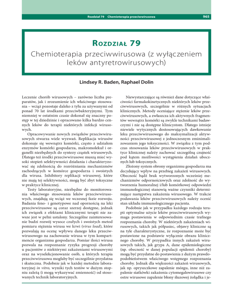 Rozdział 79 Chemioterapia przeciwwirusowa 965 R OZDZIAŁ 79 Chemioterapia przeciwwirusowa (z wyłączeniem leków antyretrowirusowych) Lindsey R. Baden, Raphael Dolin Leczenie chorób wirusowych – zarówno liczba preparatów, jak i zrozumienie ich właściwego stosowania – wciąż pozostaje daleko z tyłu za używanymi od ponad 70 lat środkami przeciwbakteryjnymi. Tym niemniej w ostatnim czasie dokonał się znaczny postęp w tej dziedzinie i opracowano kilka bardzo cennych leków do terapii niektórych infekcji wirusowych. Opracowywanie nowych związków przeciwwirusowych stwarza wiele wyzwań. Replikacja wirusów dokonuje się wewnątrz komórki, często z udziałem enzymów komórki gospodarza, makromolekuł i organelli niezbędnych do syntezy cząstek wirusowych. Dlatego też środki przeciwwirusowe muszą mieć wysoki stopień selektywności działania i charakteryzować się zdolnością do rozróżniania mechanizmów zachodzących w komórce gospodarza i swoistych dla wirusa. Inhibitory replikacji wirusowej, które nie mają tej selektywności, mogą być zbyt toksyczne w praktyce klinicznej. Testy laboratoryjne, niezbędne do monitorowania właściwego stosowania leków przeciwwirusowych, znajdują się wciąż we wczesnej fazie rozwoju. Badania feno- i genotypowe nad opornością na leki przeciwwirusowe są coraz szerzej dostępne, jednak ich związek z efektami klinicznymi terapii nie zawsze jest w pełni ustalony. Szczególne zainteresowanie budzi rozwój wysoce czułych i swoistych metod pomiaru stężenia wirusa we krwi (virus load), które pozwalają na ocenę wpływu danego leku przeciwwirusowego na zachowanie wirusa w tym kompartmencie organizmu gospodarza. Pomiar ilości wirusa pozwala na rozpoznanie ryzyka progresji choroby u pacjentów z niektórymi zakażeniami wirusowymi oraz na wyselekcjonowanie osób, u których terapia przeciwwirusowa mogłaby być szczególnie przydatna i skuteczna. Podobnie jak w każdej metodzie laboratoryjnej in vitro, wyniki tych testów w dużym stopniu zależą (i mogą wykazywać zmienność) od stosowanych technik laboratoryjnych. Niewystarczające są również dane dotyczące właściwości farmakokinetycznych niektórych leków przeciwwirusowych, szczególnie w różnych sytuacjach klinicznych. Metody oceniające stężenie leków przeciwwirusowych, a zwłaszcza ich aktywnych fragmentów wewnątrz komórki są zwykle technikami badawczymi i nie są dostępne klinicystom. Dlatego istnieje niewiele wytycznych dostosowujących dawkowanie leku przeciwwirusowego do maksymalizacji aktywności przeciwwirusowej z jednoczesnym zminimalizowaniem jego toksyczności. W związku z tym podczas stosowania leków przeciwwirusowych w praktyce klinicznej należy zachować szczególną czujność pod kątem możliwości wystąpienia działań ubocznych lub toksycznych. Złożony system obrony organizmu gospodarza ma decydujący wpływ na przebieg zakażeń wirusowych. Obecność bądź brak wytworzonych wcześniej mechanizmów odpornościowych oraz zdolność do wytworzenia humoralnej i/lub komórkowej odpowiedzi immunologicznej stanowią ważne czynniki determinujące następstwa zakażenia wirusowego. W trakcie podawania leków przeciwwirusowych należy ocenić stan układu immunologicznego pacjenta. Podobnie jak w przypadku każdego rodzaju terapii optymalne użycie leków przeciwwirusowych wymaga postawienia w odpowiednim czasie trafnego rozpoznania choroby. W niektórych zakażeniach wirusowych, takich jak półpasiec, objawy kliniczne są na tyle charakterystyczne, że rozpoznanie może być postawione na podstawie wyłącznie obrazu klinicznego choroby. W przypadku innych zakażeń wirusowych takich, jak grypa A, dane epidemiologiczne (np. obecność w danej populacji epidemii choroby) mogą być przydatne do postawienia z dużym prawdopodobieństwem właściwego wstępnego rozpoznania choroby. Jednak dla większości zakażeń wirusowych, jak np. opryszczkowe zapalenie mózgu, inne niż zapalenie siatkówki zakażenia cytomegalowirusowe czy ostre wirusowe zapalenie błony śluzowej żołądka i je- 966 Sekcja V lit, właściwa diagnoza choroby na podstawie obrazu klinicznego nie jest możliwa. W takiej sytuacji rozwój szybkich nieinwazyjnych technik diagnostycznych ma szczególnie duże znaczenie. W ostatnich latach dokonał się znaczny postęp w opracowaniu takich testów dla niektórych zakażeń wirusowych. Pomimo tych problemów, skuteczność licznych leków przeciwwirusowych została jednoznacznie udowodniona w rygorystycznie przeprowadzonych i kontrolowanych próbach klinicznych. W tym rozdziale omówiono leki, które zostały zarejestrowane albo uzyskają aprobatę do stosowania klinicznego w najbliższym czasie i są wykorzystywane w leczeniu zakażeń wirusowych innych niż HIV. Ich podsumowanie przedstawiono w tabeli 79-1. Leki antyretrowirusowe zostały przedstawione w rozdziale 90. LEKI PRZECIWWIRSOWE PRZECIWKO ZAKAŻENIOM UKŁADU ODDECHOWEGO ZANAMIWIR I OSELTAMIWIR Zanamiwir i oseltamiwir są inhibitorami enzymu neuraminidazy wirusa grypy, który ma podstawowe znaczenie w procesie uwalniania cząstek wirusowych z zakażonych komórek i dalszego rozprzstszeniania się w układzie oddechowym zakażononego człowieka. Enzym dokonuje odłączenia końcowych reszt kwasu sialowego, przez co niszczy receptory komórkowe, do których przyłącza się wirusowa hemaglutynina. Zanamiwir i oseltamiwir są analogami kwasu sialowego oraz wykazują wysoką aktywność i swoistość w hamowaniu funkcji neuraminidazy wirusów grypy A i B. Aktywność przeciwneuraminidazowa obu leków jest podobna, chociaż w badaniach in vitro wykazano nieco wyższą aktywność zanamiwiru wobec wirusa grypy B. Zarówno zanamiwir, jak i oseltamiwir działają na zasadzie kompetycyjnego i odwracalnego hamowania aktywnego fragmentu neuraminidazy wirusa grypy A i B oraz wykazują względnie niewielki wpływ na enzymy komórek ssaków. Fosforan oseltamiwiru jest