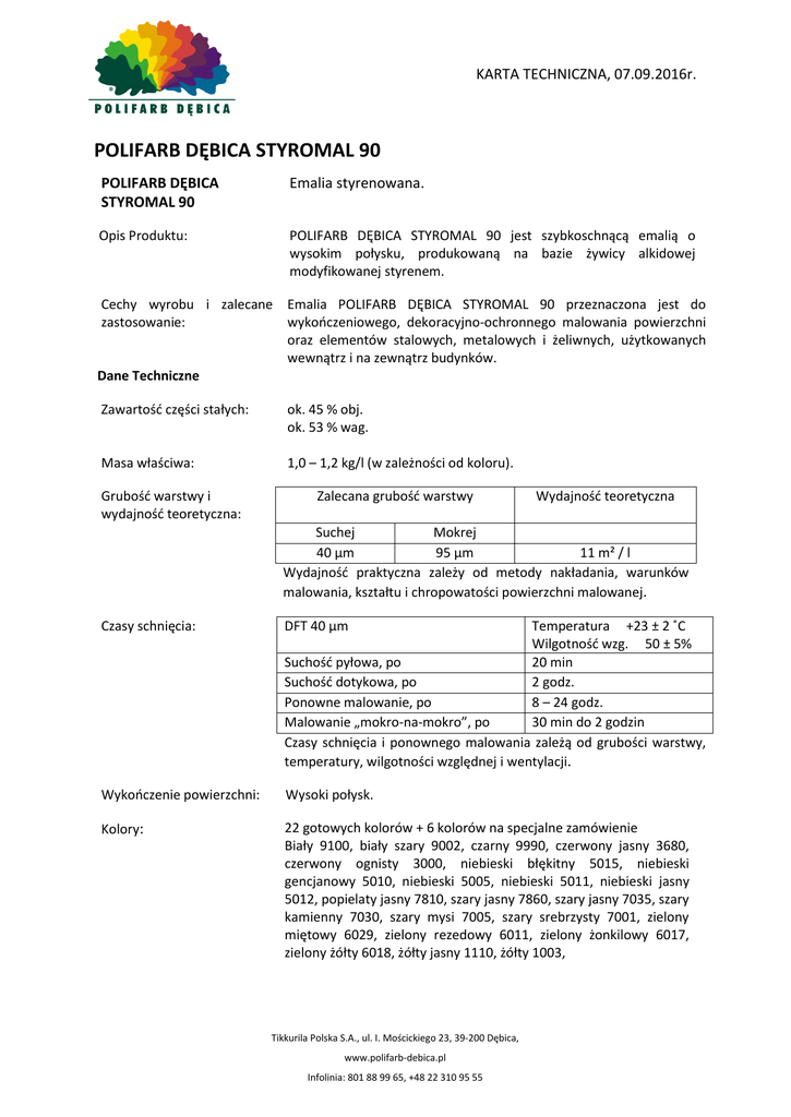 KARTA TECHNICZNA, 07.09.2016r. POLIFARB DĘBICA STYROMAL 90 POLIFARB DĘBICA STYROMAL 90 Emalia styrenowana. Opis Produktu: POLIFARB DĘBICA STYROMAL 90 jest szybkoschnącą emalią o wysokim połysku, produkowaną na bazie żywicy alkidowej modyfikowanej styrenem. Cechy wyrobu i zalecane Emalia POLIFARB DĘBICA STYROMAL 90 przeznaczona jest do zastosowanie: wykończeniowego, dekoracyjno-ochronnego malowania powierzchni oraz elementów stalowych, metalowych i żeliwnych, użytkowanych wewnątrz i na zewnątrz budynków. Dane Techniczne Zawartość części stałych: ok. 45 % obj. ok. 53 % wag. Masa właściwa: 1,0 – 1,2 kg/l (w zależności od koloru). Grubość warstwy i wydajność teoretyczna: Zalecana grubość warstwy Wydajność teoretyczna Suchej Mokrej 40 µm 95 µm 11 m² / l Wydajność praktyczna zależy od metody nakładania, warunków malowania, kształtu i chropowatości powierzchni malowanej. Czasy schnięcia: DFT 40 µm Temperatura +23 ± 2 ˚C Wilgotność wzg. 50 ± 5% Suchość pyłowa, po 20 min Suchość dotykowa, po 2 godz. Ponowne malowanie, po 8 – 24 godz. Malowanie „mokro-na-mokro”, po 30 min do 2 godzin Czasy schnięcia i ponownego malowania zależą od grubości warstwy, temperatury, wilgotności względnej i wentylacji. Wykończenie powierzchni: Wysoki połysk. Kolory: 22 gotowych kolorów + 6 kolorów na specjalne zamówienie Biały 9100, biały szary 9002, czarny 9990, czerwony jasny 3680, czerwony ognisty 3000, niebieski błękitny 5015, niebieski gencjanowy 5010, niebieski 5005, niebieski 5011, niebieski jasny 5012, popielaty jasny 7810, szary jasny 7860, szary jasny 7035, szary kamienny 7030, szary mysi 7005, szary srebrzysty 7001, zielony miętowy 6029, zielony rezedowy 6011, zielony żonkilowy 6017, zielony żółty 6018, żółty jasny 1110, żółty 1003, Tikkurila Polska S.A., ul. I. Mościckiego 23, 39-200 Dębica, www.polifarb-debica.pl Infolinia: 801 88 99 65, +48 22 310 95 55 KARTA TECHNICZNA, 07.09.2016r. POLIFARB DĘBICA STYROMAL 90 oraz kolory na specjalne zamówienia: fioletowy sygnalizacyjny 4008, niebieski jasny 5540, pomarańczowy 2009, zielona jasna 6390, żółty średni 1130, żółty rzepak 1021. W celu uniknięcia różnic w odcieniach należy użyć farby z jednej partii produkcyjnej. Dane Aplikacyjne Przygotowanie powierzchni: Usunąć oleje, tłuszcze, sole i inne zanieczyszczenia powierzchni, używając odpowiednich środków (PN-EN ISO 12944-4). Powierzchnie stalowe: POLIFARB DĘBICA STYROMAL 90 nakładać na podłoża stalowe i żeliwne zagruntowane produktami marki Polifarb Dębica: - podkładem styrenowanym POLIFARB DĘBICA STYROLIT®. Aplikacja emalii po min. 2 godzinach przy aplikacji natryskiem pneumatycznym lub po 24 godzinach przy nanoszeniu pędzlem, - farba antykorozyjną POLIFARB DĘBICA NEOKOR® PRO. Aplikacja emalii po upływie min. 48 godzin, - szybkoschnącym podkładem alkidowym POLIFARB DĘBICA AGROMAL . Aplikacja emalii po upływie min. 24 godzin. Renowacje powierzchni: Usunąć oleje, zatłuszczenia, sole i inne zanieczyszczenia powierzchni, używając odpowiednich środków. Przed malowaniem warstwy nawierzchniowej POLIFARB DĘBICA STYROMALU 90 naprawić uszkodzone miejsce w powierzchni, używając odpowiedniego wyrobu. Podkłady: POLIFARB DĘBICA STYROLIT, POLIFARB DĘBICA NEOKOR PRO, POLIFARB DĘBICA AGROMAL. Warunki nakładania: Emalię przed użyciem należy dokładnie wymieszać. POLIFARB DĘBICA STYROMAL 90 nakładać w 2 lub 3 warstwach. Zaleca się, aby grubość jednej warstwy „suchej” powłoki wynosiła 30-40 μm. Prace malarskie prowadzić przy temperaturze od +5°C do +30°C, przy czym temperatura podłoża powinna być co najmniej o 3°C wyższa od temperatury punktu rosy. Nakładanie: Przed użyciem farbę dokładnie wymieszać. Pędzel – farba o lepkości handlowej. Natrysk pneumatyczny – sugerowane parametry: – lepkość umowna mierzona kubkiem wypływowym z dnem stożkowym o średnicy otworu 4mm – 25-30 s, – średnica dyszy – 1,5-2,5 mm, – ciśnienie – 2,5-3,5 bar, Natrysk hydrodynamiczny – sugerowane parametry: – farba o lepkości handlowej, – średnica dyszy – 0,011”-0,015” – ciśnienie – 120-160 bar, 90 Tikkurila Polska S.A., ul. I. Mościckiego 23, 39-200 Dębica, www.polifarb-debica.pl Infolinia: 801 88 99 65, +48 22 310 95 55 KARTA TECHNICZNA, 07.09.2016r. POLIFARB DĘBICA STYROMAL 90 Producent nie odpowiada za jakość wymalowań w przypadku nieprzestrzegania podanych zaleceń Rozcieńczalnik: Rozcieńczalnik RF-01 do wyrobów chlorokauczukowych marki Polifarb Dębica. styrenowanych i Czyszczenie narzędzi: Rozcieńczalnik RF-01 do wyrobów chlorokauczukowych marki Polifarb Dębica. styrenowanych i Termin przydatności: 18 miesięcy od daty produkcji, w fabrycznie zamkniętym opakowaniu. Opakowania: 20 l Bezpieczeństwo: Zawsze należy zwracać uwagę na etykietę ostrzegawczą, znajdującą się na opakowaniu. Zawiera: ksylen, styren. Niebezpieczeństwo: Wysoce łatwopalna ciecz i pary. Podejrzewa się, że działa szkodliwie na dziecko w łonie matki. Może powodować uszkodzenie narządów poprzez długotrwałe lub narażenie powtarzane (narząd słuchu). Działa drażniąco na skórę. Działa szkodliwie na organizmy wodne, powodując długotrwałe skutki. Zawiera oksym ketonu etylowometylowego. Może powodować wystąpienie reakcji alergicznej. Przechowywać z dala od źródeł ciepła/iskrzenia/otwartego ognia/gorących powierzchni. Palenie wzbronione. Unikać wdychania mgły/par/rozpylonej cieczy. Stosować rękawice ochronne. W przypadku niedostatecznej wentylacji stosować indywidualne środki ochrony dróg oddechowych. Unikać uwolnienia do środowiska. Dodatkowe informacje o zagrożeniach i ich zapobieganiu ujęte są w kartach charakterystyki produktu. Transport i przechowywanie: Przechowywać i transportować w szczelnie zamkniętym opakowaniu, w temperaturze od +5°C do +25°C. Składować w pomieszczeniach suchych i przewiewnych