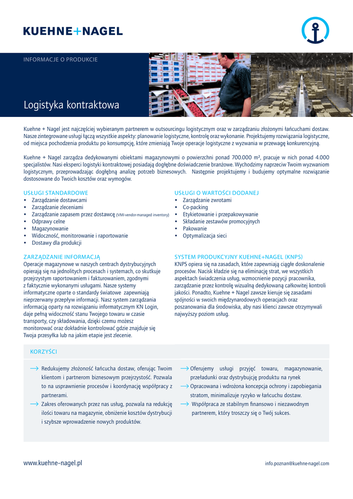 INFORMACJE O PRODUKCIE Logistyka kontraktowa Kuehne + Nagel jest najczęściej wybieranym partnerem w outsourcingu logistycznym oraz w zarządzaniu złożonymi łańcuchami dostaw. Nasze zintegrowane usługi łączą wszystkie aspekty: planowanie logistyczne, kontrolę oraz wykonanie. Projektujemy rozwiązania logistyczne, od miejsca pochodzenia produktu po konsumpcję, które zmieniają Twoje operacje logistyczne z wyzwania w przewagę konkurencyjną. Kuehne + Nagel zarządza dedykowanymi obiektami magazynowymi o powierzchni ponad 700.000 m², pracuje w nich ponad 4.000 specjalistów. Nasi eksperci logistyki kontraktowej posiadają dogłębne doświadczenie branżowe. Wychodzimy naprzeciw Twoim wyzwaniom logistycznym, przeprowadzając dogłębną analizę potrzeb biznesowych. Następnie projektujemy i budujemy optymalne rozwiązanie dostosowane do Twoich kosztów oraz wymogów. USŁUGI STANDARDOWE • Zarządzanie dostawcami • Zarządzanie zleceniami • Zarządzanie zapasem przez dostawcę (VMI-vendor-managed inventory) • Odprawy celne • Magazynowanie • Widoczność, monitorowanie i raportowanie • Dostawy dla produkcji USŁUGI O WARTOŚCI DODANEJ • Zarządzanie zwrotami • Co-packing • Etykietowanie i przepakowywanie • Składanie zestawów promocyjnych • Pakowanie • Optymalizacja sieci ZARZĄDZANIE INFORMACJĄ Operacje magazynowe w naszych centrach dystrybucyjnych opierają się na jednolitych procesach i systemach, co skutkuje przejrzystym raportowaniem i fakturowaniem, zgodnymi z faktycznie wykonanymi usługami. Nasze systemy informatyczne oparte o standardy światowe zapewniają nieprzerwany przepływ informacji. Nasz system zarządzania informacją oparty na rozwiązaniu informatycznym KN Login, daje pełną widoczność stanu Twojego towaru w czasie transporty, czy składowania, dzięki czemu możesz monitorować oraz dokładnie kontrolować gdzie znajduje się Twoja przesyłka lub na jakim etapie jest zlecenie. SYSTEM PRODUKCYJNY KUEHNE+NAGEL (KNPS) KNPS opiera się na zasadach, które zapewniają ciągłe doskonalenie procesów. Nacisk kładzie się na eliminację strat, we wszystkich aspektach świadczenia usług, wzmocnienie pozycji pracownika, zarządzanie przez kontrolę wizualną dedykowaną całkowitej kontroli jakości. Ponadto, Kuehne + Nagel zawsze kieruje się zasadami spójności w swoich międzynarodowych operacjach oraz poszanowania dla środowiska, aby nasi klienci zawsze otrzymywali najwyższy poziom usług. KORZYŚCI edukujemy złożoność łańcucha dostaw, oferując Twoim R klientom i partnerom biznesowym przejrzystość. Pozwala to na usprawnienie procesów i koordynację współpracy z partnerami. Zakres oferowanych przez nas usług, pozwala na redukcję ilości towaru na magazynie, obniżenie kosztów dystrybucji i szybsze wprowadzenie nowych produktów. www.kuehne–nagel.pl Oferujemy usługi przyjęć towaru, magazynowanie, przeładunki oraz dystrybujcję produktu na rynek Opracowana i wdrożona koncepcja ochrony i zapobiegania stratom, minimalizuje ryzyko w łańcuchu dostaw. Współpraca ze stabilnym finansowo i niezawodnym partnerem, który troszczy się o Twój sukces. [email protected] ROZWIĄZANIA PRZEMYSŁOWE SEKTOR DETALICZNY Dostarczamy strategiczne rozwiązania logistyczne, korzystając z wiedzy na temat handlu, produkcji oraz logistyki. FMCG Kuehne + Nagel konsekwentnie dostarcza usługi logistyczne o wysokiej jakości dla przodujących na świecie firm z sektora FMCG. SEKTOR MOTORYZACYJNY Kuehne + Nagel posiada zasoby i doświadczenie aby zapewnić wysoką przewagę konkurencyjną w logistyce motoryzacyjnej na całym świecie. TOWARY PRZEMYSŁOWE Nasze szyte na miarę rozwiązania obejmują cały łańcuch dostaw towarów przemysłowych. SEKTOR FARMACEUTYCZNY I OPIEKI ZDROWOTNEJ Nasz zespół opracował innowacyjne podejście do logistyki farmacji i opieki zdrowotnej poprzez adaptacje cyklu życia produktu w łańcuchu dostaw. To pozwala nam na dostosowywanie naszych usług, tak, aby odpowiednie działania zostały zastosowane na odpowiednich etapach rozwoju, produkcji i dystrybucji produktu. SEKTOR HIGH-TECH Nasze usługi high-tech ustanowiły koncepcję ochrony i zapobiegania stratom. Umożliwiamy klientom redukcję zapasów magazynowych, obniżenie kosztów dystrybucji i przyspieszenie wprowadzenia nowych produktów. NASZA SIEĆ: Albania - 1 lokalizacja - 1.000 m² Polska - 13 lokalizacji - 160.000 m² Austria - 5 lokalizacji - 80.000 m² Rumunia - 2 lokalizacje - 30.000 m² Chorwacja - 1 lokalizacja- 16.000 m² Rosja - 6 lokalizacji - 121.000 m² Czechy- 2 lokalizacje - 16.000 m² Serbia - 1 lokalizacja - 10.000 m² Grecja - 4 lokalizacje - 60.000 m² Słowacja - 2 lokalizacje - 28.000 m² Węgry - 2 lokalizacje - 54.000 m² Słowenia - 1 lokalizacja - 2.000 m² Łotwa - 1 lokalizacja - 13.000 m² Ukraina - 5 lokalizacji - 95.000 m² KONTAKT Kuehne + Nagel Sp. z o.o. Ul. Spedycyjna 1 • 62-023 Gądki/Poznań • Polska • tel.: +48 61 81 99 100 • [email protected] www.kuehne–nagel.pl