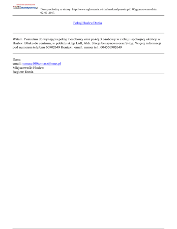 Dane pochodzą ze strony: http://www.ogloszenia.wirtualnaskandynawia.pl/. Wygenerowano dnia: 02-03-2017. Pokoj Haslev/Dania Witam. Posiadam do wynajęcia pokój 2 osobowy oraz pokój 3 osobowy w cichej i spokojnej okolicy w Haslev. Blisko do centrum, w pobliżu sklep Lidl, Aldi. Stacja benzynowa oraz S-tog. Więcej informacji pod numerem telefonu 60902649 Kontakt: email: numer tel.: 004560902649 Dane: email: [email protected] Miejscowość: Haslew Region: Dania