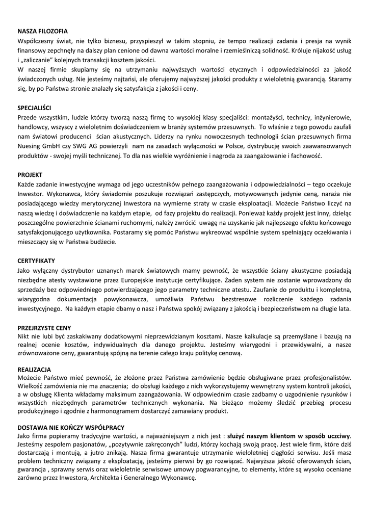 NASZA FILOZOFIA Współczesny świat, nie tylko biznesu, przyspieszył w takim stopniu, że tempo realizacji zadania i presja na wynik finansowy zepchnęły na dalszy plan cenione od dawna wartości moralne i rzemieślniczą solidność. Króluje nijakość usług i „zaliczanie” kolejnych transakcji kosztem jakości. W naszej firmie skupiamy się na utrzymaniu najwyższych wartości etycznych i odpowiedzialności za jakość świadczonych usług. Nie jesteśmy najtańsi, ale oferujemy najwyższej jakości produkty z wieloletnią gwarancją. Staramy się, by po Państwa stronie znalazły się satysfakcja z jakości i ceny. SPECJALIŚCI Przede wszystkim, ludzie którzy tworzą naszą firmę to wysokiej klasy specjaliści: montażyści, technicy, inżynierowie, handlowcy, wszyscy z wieloletnim doświadczeniem w branży systemów przesuwnych. To właśnie z tego powodu zaufali nam światowi producenci ścian akustycznych. Liderzy na rynku nowoczesnych technologii ścian przesuwnych firma Nuesing GmbH czy SWG AG powierzyli nam na zasadach wyłączności w Polsce, dystrybucję swoich zaawansowanych produktów - swojej myśli technicznej. To dla nas wielkie wyróżnienie i nagroda za zaangażowanie i fachowość. PROJEKT Każde zadanie inwestycyjne wymaga od jego uczestników pełnego zaangażowania i odpowiedzialności – tego oczekuje Inwestor. Wykonawca, który świadomie poszukuje rozwiązań zastępczych, motywowanych jedynie ceną, naraża nie posiadającego wiedzy merytorycznej Inwestora na wymierne straty w czasie eksploatacji. Możecie Państwo liczyć na naszą wiedzę i doświadczenie na każdym etapie, od fazy projektu do realizacji. Ponieważ każdy projekt jest inny, dzieląc poszczególne powierzchnie ścianami ruchomymi, należy zwrócić uwagę na uzyskanie jak najlepszego efektu końcowego satysfakcjonującego użytkownika. Postaramy się pomóc Państwu wykreować wspólnie system spełniający oczekiwania i mieszczący się w Państwa budżecie. CERTYFIKATY Jako wyłączny dystrybutor uznanych marek światowych mamy pewność, że wszystkie ściany akustyczne posiadają niezbędne atesty wystawione przez Europejskie instytucje certyfikujące. Żaden system nie zostanie wprowadzony do sprzedaży bez odpowiedniego potwierdzającego jego parametry techniczne atestu. Zaufanie do produktu i kompletna, wiarygodna dokumentacja powykonawcza, umożliwia Państwu bezstresowe rozliczenie każdego zadania inwestycyjnego. Na każdym etapie dbamy o nasz i Państwa spokój związany z jakością i bezpieczeństwem na długie lata. PRZEJRZYSTE CENY Nikt nie lubi być zaskakiwany dodatkowymi nieprzewidzianym kosztami. Nasze kalkulacje są przemyślane i bazują na realnej ocenie kosztów, indywidualnych dla danego projektu. Jesteśmy wiarygodni i przewidywalni, a nasze zrównoważone ceny, gwarantują spójną na terenie całego kraju politykę cenową. REALIZACJA Możecie Państwo mieć pewność, że złożone przez Państwa zamówienie będzie obsługiwane przez profesjonalistów. Wielkość zamówienia nie ma znaczenia; do obsługi każdego z nich wykorzystujemy wewnętrzny system kontroli jakości, a w obsługę Klienta wkładamy maksimum zaangażowania. W odpowiednim czasie zadbamy o uzgodnienie rysunków i wszystkich niezbędnych parametrów technicznych wykonania. Na bieżąco możemy śledzić przebieg procesu produkcyjnego i zgodnie z harmonogramem dostarczyć zamawiany produkt. DOSTAWA NIE KOŃCZY WSPÓŁPRACY Jako firma popieramy tradycyjne wartości, a najważniejszym z nich jest : służyć naszym klientom w sposób uczciwy. Jesteśmy zespołem pasjonatów, „pozytywnie zakręconych” ludzi, którzy kochają swoją pracę. Jest wiele firm, które dziś dostarczają i montują, a jutro znikają. Nasza firma gwarantuje utrzymanie wieloletniej ciągłości serwisu. Jeśli masz problem techniczny związany z eksploatacją, jesteśmy pierwsi by go rozwiązać. Najwyższa jakość oferowanych ścian, gwarancja , sprawny serwis oraz wieloletnie serwisowe umowy pogwarancyjne, to elementy, które są wysoko oceniane zarówno przez Inwestora, Architekta i Generalnego Wykonawcę. I NA KONIEC… Firma SOWAN INTERIOR SYSTEM działa na terenie całej Polski. Obsługujemy Państwa poprzez biura naszych Autoryzowanych Przedstawicieli Regionalnych (APR). Każde z nich jest samodzielną firmą rodzinną kierowaną przez Właściciela. Montażem zajmują się tylko Autoryzowane przez producentów Grupy Montażowe (AGM) - również samodzielne firmy rodzinne. Naszą pozycję budujemy w oparciu o zespół ludzi o najwyższych kwalifikacjach i wartościach etycznych, a co najważniejsze o bogatą bazę zadowolonych Klientów. Jeżeli potrzebujecie Państwo bardziej przekonywujących argumentów prosimy odwiedźcie naszą stronę internetową. Staraliśmy się by zawarte w niej informacje były przejrzyste i użyteczne, zarówno dla odbiorcy indywidualnego jak i dla biura projektowego czy inwestora. Jeżeli macie Państwo pytania lub tematy do omówienia, po prostu zadzwońcie do nas lub napiszcie. Do realizacji zadania przydzielimy Państwu opiekuna znajdującego się najbliżej. Dziękujemy za poświęcenie czasu na przeczytanie powyższych informacji. Mamy nadzieję, że wyjaśniliśmy czym się wyróżniamy i dlaczego chcielibyśmy abyście Państwo wybrali współpracę z nami.