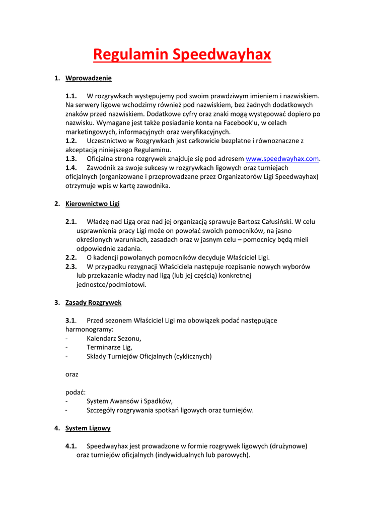 Regulamin Speedwayhax 1. Wprowadzenie 1.1. W rozgrywkach występujemy pod swoim prawdziwym imieniem i nazwiskiem. Na serwery ligowe wchodzimy również pod nazwiskiem, bez żadnych dodatkowych znaków przed nazwiskiem. Dodatkowe cyfry oraz znaki mogą występowad dopiero po nazwisku. Wymagane jest także posiadanie konta na Facebook'u, w celach marketingowych, informacyjnych oraz weryfikacyjnych. 1.2. Uczestnictwo w Rozgrywkach jest całkowicie bezpłatne i równoznaczne z akceptacją niniejszego Regulaminu. 1.3. Oficjalna strona rozgrywek znajduje się pod adresem www.speedwayhax.com. 1.4. Zawodnik za swoje sukcesy w rozgrywkach ligowych oraz turniejach oficjalnych (organizowane i przeprowadzane przez Organizatorów Ligi Speedwayhax) otrzymuje wpis w kartę zawodnika. 2. Kierownictwo Ligi 2.1. Władzę nad Ligą oraz nad jej organizacją sprawuje Bartosz Całusioski. W celu usprawnienia pracy Ligi może on powoład swoich pomocników, na jasno określonych warunkach, zasadach oraz w jasnym celu – pomocnicy będą mieli odpowiednie zadania. 2.2. O kadencji powołanych pomocników decyduje Właściciel Ligi. 2.3. W przypadku rezygnacji Właściciela następuje rozpisanie nowych wyborów lub przekazanie władzy nad ligą (lub jej częścią) konkretnej jednostce/podmiotowi. 3. Zasady Rozgrywek 3.1. Przed sezonem Właściciel Ligi ma obowiązek podad następujące harmonogramy: Kalendarz Sezonu, Terminarze Lig, Składy Turniejów Oficjalnych (cyklicznych) oraz podad: System Awansów i Spadków, Szczegóły rozgrywania spotkao ligowych oraz turniejów. 4. System Ligowy 4.1. Speedwayhax jest prowadzone w formie rozgrywek ligowych (drużynowe) oraz turniejów oficjalnych (indywidualnych lub parowych). 4.2. Każde rozgrywki ligowe są prowadzone w formie systemu „każdy z każdym”. W jednej lidze może byd maksymalnie 6 drużyn. Jeśli liga nie zdoła zapełnid się drużynami, to wtedy zadaniem Organizatorów jest znalezienie/uformowanie dodatkowej drużyny lub zreorganizowanie rozgrywek tak, by były one jak najbardziej zbliżone do systemu „każdy z każdym” w lidze sześciu drużynowej. 5. Tabele Ligowe 5.1. Drużyna otrzymuje do tabeli: - za wygraną zespół otrzymuje 2 duże punkty meczowe, - za przegraną zespół nie otrzymuje dużych punktów meczowych, - za remis - obie drużyny otrzymują po 1 dużym punkcie meczowym, - za lepszy bilans punktowy w dwumeczu wygrany zespół otrzymuje 1 duży punkt meczowy. Przy równej ilości dużych i małych punktów w dwumeczu, punkt bonusowy nie zostaje przyznany. Dodatkowo zespoły otrzymują małe punkty, które wynikają z różnicy między punktami zdobytymi, a straconymi przez drużynę. 5.2. O wyższym miejscu w tabeli decyduje (według kolejności od najważniejszego): - suma dużych punktów, - bezpośredni wyniku dwumeczu, - suma małych punktów. 5.3. W przypadku równej ilości dużych punktów u więcej niż dwóch drużyn, należy sporządzid małą tabelkę, która uwzględniad będzie bezpośrednie pojedynki wśród wybranych do niej drużyn. Jeśli duże punkty dalej będą się zgadzad to kolejnym kryterium są małe punkty. Jeśli i to kryterium nie rozstrzygnie sprawy należy wziąd pod uwagę podaną przez Organizatorów listę przed sezonem o klasyfikacji danego zespołu (zespół, który jest wyżej w klasyfikacji jest również wyżej na koniec sezonu). 5.4. Po fazie zasadniczej (systemie „każdy z każdym”) rozgrywki wkroczą w fazę „Play-Off” i system „Knock-Out” (przegrany odpada), a w niej co następuje: - zespoły z miejsc 1. I 2. (pierwszego i drugiego) automatycznie jadą w fazie półfinałów, - zespoły z miejsc 3-6 jadą w dwierdfinałach (3-6 / 4-5), zwycięzcy awansują do półfinałów, przegrani jadą mecz o utrzymanie, - wygrani z dwierdfinałów mierzą się z 1. I 2. zespołem po fazie zasadniczej (wygrany z pary 3-6 jedzie z 2. zespołem po fazie zasadniczej, wygrany z pary 4-5 jedzie z 1. zespołem po fazie zasadniczej), - wygrani półfinałów mierzą się ze sobą w finale, przegrani półfinałów jadą mecz o 3. miejsce. - każdy pojedynek odbywa się w formie dwumeczu, w którym pierwszym gospodarzem jest zespół, który był niżej w tabeli po fazie zasadniczej. W przypadku remisu w dwumeczu awans do kolejnej fazy uzyskuje drużyna, która zajęła wyższe miejsce w fazie zasadniczej. Zespół, który: - zajmie 1. miejsce zostaje złotym medalistą danej ligi, - zajmie 2. miejsce zostaje srebrnym medalistą danej ligi, - zajmie 3. miejsce zostaje brązowym medalistą danej ligi, - zajmie 5. miejsce jedzie w barażu z 2. zespołem niższej ligi - zajmie 6. miejsce automatycznie spada do niższej ligi. 6. Zgłaszanie zespołów 6.1. Zespoły można zgłaszad w odpowiednim dziale, w momencie ogłoszenia przez Organizatorów Ligi startu zgłoszeo i tylko w terminach wyznaczonych przez Organizatorów. 6.2. Założyciel zespołu nie musi byd jego kapitanem. Założyciel może mianowad kapitana spośród zawodników swojego zespołu. Aby zostad kapitanem klubu należy posiadad niezszarganą opinię w świecie internetowych gier żużlowych oraz uzyskad zgodę na budowanie klubu przez władze ligi. Ponadto kapitanem zostad może tylko taki gracz, który odjechał jeden pełny sezon w Lidze Speedwayhax (bądź piętnaście spotkao ligowych). 6.3. Jeden gracz może występowad tylko w jednym zespole w trakcie trwania sezonu. Wyjątkiem jest sytuacja, w której zawodnik zostaje wyrzucony z drużyny przez kapitana, czuje się poszkodowany zaistniałą sytuacją oraz przedstawi rozsądne argumenty za pozostawieniem go w grze do kooca trwającego sezonu, administracji Ligi. Jeżeli administracja przychyli się do prośby gracza to zawodnik może dołączyd do klubu, który wyrazi zainteresowanie zatrudnieniem go. 6.4. Zadaniem kapitana jest nadanie nazwy zespołowi oraz przekazanie logo do władz ligi. Nazwa nie może byd obraźliwa, powinna składad się maksymalnie z 25 znaków (wraz