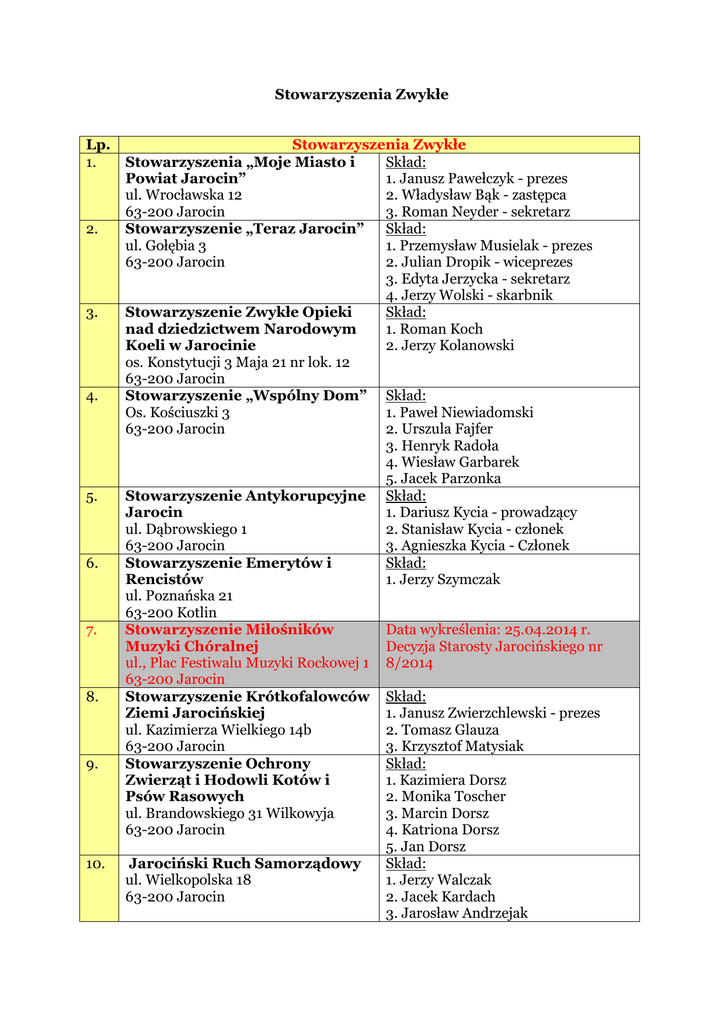 Stowarzyszenia Zwykłe Lp. 1. 2. 3. 4. 5. 6. 7. 8. 9. 10. Stowarzyszenia Zwykłe Stowarzyszenia „Moje Miasto i Skład: Powiat Jarocin” 1. Janusz Pawełczyk - prezes ul. Wrocławska 12 2. Władysław Bąk - zastępca 63-200 Jarocin 3. Roman Neyder - sekretarz Stowarzyszenie „Teraz Jarocin” Skład: ul. Gołębia 3 1. Przemysław Musielak - prezes 63-200 Jarocin 2. Julian Dropik - wiceprezes 3. Edyta Jerzycka - sekretarz 4. Jerzy Wolski - skarbnik Stowarzyszenie Zwykłe Opieki Skład: nad dziedzictwem Narodowym 1. Roman Koch Koeli w Jarocinie 2. Jerzy Kolanowski os. Konstytucji 3 Maja 21 nr lok. 12 63-200 Jarocin Stowarzyszenie „Wspólny Dom” Skład: Os. Kościuszki 3 1. Paweł Niewiadomski 63-200 Jarocin 2. Urszula Fajfer 3. Henryk Radoła 4. Wiesław Garbarek 5. Jacek Parzonka Stowarzyszenie Antykorupcyjne Skład: Jarocin 1. Dariusz Kycia - prowadzący ul. Dąbrowskiego 1 2. Stanisław Kycia - członek 63-200 Jarocin 3. Agnieszka Kycia - Członek Stowarzyszenie Emerytów i Skład: Rencistów 1. Jerzy Szymczak ul. Poznańska 21 63-200 Kotlin Stowarzyszenie Miłośników Data wykreślenia: 25.04.2014 r. Muzyki Chóralnej Decyzja Starosty Jarocińskiego nr ul., Plac Festiwalu Muzyki Rockowej 1 8/2014 63-200 Jarocin Stowarzyszenie Krótkofalowców Skład: Ziemi Jarocińskiej 1. Janusz Zwierzchlewski - prezes ul. Kazimierza Wielkiego 14b 2. Tomasz Glauza 63-200 Jarocin 3. Krzysztof Matysiak Stowarzyszenie Ochrony Skład: Zwierząt i Hodowli Kotów i 1. Kazimiera Dorsz Psów Rasowych 2. Monika Toscher ul. Brandowskiego 31 Wilkowyja 3. Marcin Dorsz 63-200 Jarocin 4. Katriona Dorsz 5. Jan Dorsz Jarociński Ruch Samorządowy Skład: ul. Wielkopolska 18 1. Jerzy Walczak 63-200 Jarocin 2. Jacek Kardach 3. Jarosław Andrzejak 11. Stowarzyszenie na rzecz rozwoju Jarocina ul. Rynek 3 63-200 Jarocin 12. Stowarzyszenie Ochrony Zwierząt i Hodowli Kotów i Psów Rasowych "Kottad" ul. Rymarkiewicza 32 63-220 Kotlin Witaszyckie Koło Ludzi Aktywnych Al. Wolności 35 63-230 Witaszyce Sojusz Jarocińskiej Lewicy ul. Jachowskiego 14 63-200 Jarocin 13. 14. 15. Stowarzyszenie Właścicieli i Hodowców Kotów i Psów Rasowych "Perro Kissa" Dąbrowa 41 63-233 Jaraczewo Stan na dzień: 25.03.2015 Skład: 1. Damian Dyoniziak 2. Piotr Dziurzyński 3. Lucjan Paluszkiewicz 4. Mirosława Mickiewicz 5. Jarosław Dziurzyński Skład: 1. Agnieszka Łukowska 2. Paweł Pawlak 3. Halina Łukowska 4. Tadeusz Łukowski Skład: 1. Ireneusz Lamprecht Skład: 1. Tomasz Ochliński Skład: 1. Monika Jankowiak