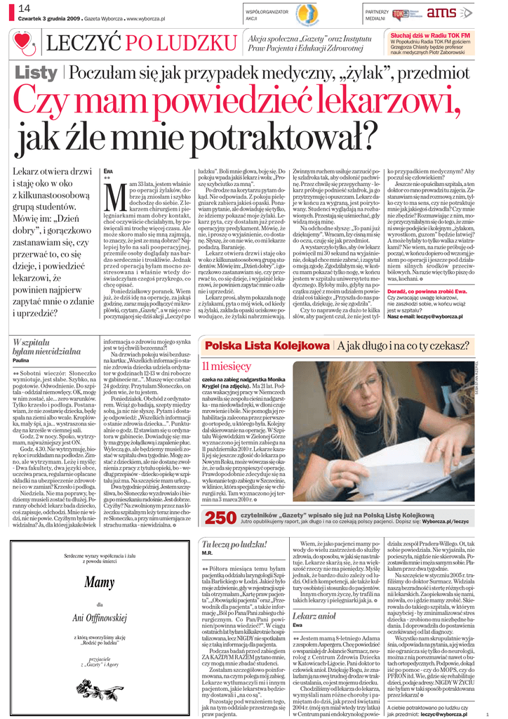 14 WSPÓŁORGANIZATOR AKCJI Czwartek 3 grudnia 2009 Gazeta Wyborcza www.wyborcza.pl + + LECZYĆ PO LUDZKU PARTNERZY MEDIALNI Akcja społeczna „Gazety” oraz Instytutu Praw Pacjenta i Edukacji Zdrowotnej Słuchaj dziś w Radiu TOK FM W Popołudniu Radia TOK FM gościem Grzegorza Chlasty będzie profesor nauk medycznych Piotr Zaborowski Listy | Poczułam się jak przypadek medyczny, „żylak”, przedmiot Czy mam powiedzieć lekarzowi, jak źle mnie potraktował? EWA am 33 lata, jestem właśnie po operacji żylaków, dobrze ją zniosłam i szybko dochodzę do siebie. Z lekarzem chirurgiem i pielęgniarkami mam dobry kontakt, choć oczywiście chciałabym, by poświęcali mi trochę więcej czasu. Ale może skoro mało się mną zajmują, to znaczy, że jest ze mną dobrze? Najlepiej było na sali pooperacyjnej, przemiłe osoby doglądały nas bardzo serdecznie i troskliwie. Jednak przed operacją byłam mocno zestresowana i właśnie wtedy doświadczyłam czegoś przykrego, co chcę opisać. Poniedziałkowy poranek. Wiem już, że dziś idę na operację, za jakąś godzinę, zaraz mają podłączyć mi kroplówki, czytam „Gazetę”, a w niej o rozpoczynającej się dziś akcji „Leczyć po M informacja o zdrowiu mojego synka jest w tej chwili bezcenna?! Na drzwiach pokoju wisi bezduszna kartka: „Wszelkich informacji o stanie zdrowia dziecka udziela ordynator w godzinach 12-13 w dni robocze w gabinecie nr...”. Muszę więc czekać 24 godziny. Przytulam Słoneczko, on jeden wie, że tu jestem. Poniedziałek. Obchód z ordynatorem. Wciąż go badają, szepty między sobą, ja nic nie słyszę. Pytam i dostaję odpowiedź: „Wszelkich informacji o stanie zdrowia dziecka...”. Punktualnie o godz. 12 stawiam się u ordynatora w gabinecie. Dowiaduję się: mały ma grypę żołądkową i zapalenie płuc. Wyleczą go, ale będziemy musieli zostać w szpitalu dwa tygodnie. Mogę zostać z dzieckiem, ale nie dostanę zwolnienia z pracy z tytułu opieki, bo – według przepisów – dziecko opiekę w szpitalu już ma. Na szczęście mam urlop... Dwa tygodnie później. Jestem szczęśliwa, bo Słoneczko wyzdrowiało i biega po mieszkaniu radośnie. Jest dobrze. Czyżby? Na zwolnionym przez nas łóżeczku szpitalnym leży teraz inne choreSłoneczko, aprzy nim umierająca ze strachu matka – niewidzialna. W szpitalu byłam niewidzialna Paulina Sobotni wieczór: Słoneczko wymiotuje, jest słabe. Szybko, na pogotowie. Odwodnienie. Do szpitala – oddział niemowlęcy. OK, mogę w nim zostać, ale... zero warunków. Tylko krzesło i podłoga. Postanawiam, że nie zostawię dziecka, będę spała na ziemi albo wcale. Kroplówka, mały śpi, a ja... wystraszona siedzę na krześle w ciemnej sali. Godz. 2 w nocy. Spoko, wytrzymam, najważniejszy jest ON. Godz. 4.30. Nie wytrzymuję, biorę koc i rozkładam na podłodze. Zimno, ale wytrzymam. Leżę i myślę: – Dwa fakultety, dwa języki obce, uczciwa praca, regularnie opłacane składki na ubezpieczenie zdrowotne i co w zamian? Krzesło i podłoga. Niedziela. Nie ma poprawy, będziemy musieli zostać tu dłużej. Poranny obchód: lekarz bada dziecko, coś zapisuje, odchodzi. Mnie nie widzi, nic nie powie. Czyżbym była niewidzialna? Ja, dla której jakakolwiek ludzku”. Boli mnie głowa, boję się. Do pokoju wpada jakiś lekarz i woła: „Proszę szybciutko za mną”. Po drodze na korytarzu pytam dokąd. Nie odpowiada. Z pokoju pielęgniarek zabiera jakieś opaski. Ponawiam pytanie, ale dowiaduję się tylko, że idziemy pokazać moje żylaki. Lekarz pyta, czy dostałam już przedoperacyjny predykament. Mówię, że nie, i proszę o wyjaśnienie, co dostanę. Słyszę, że on nie wie, co mi lekarze podadzą. Baranieję. Lekarz otwiera drzwi i staję oko w oko z kilkunastoosobową grupą studentów. Mówię im: „Dzień dobry”, i gorączkowo zastanawiam się, czy przerwać to, co się dzieje, i wyjaśnić lekarzowi, że powinien zapytać mnie o zdanie i uprzedzić. Lekarz prosi, abym pokazała nogę z żylakami, pyta o mój wiek, od kiedy są żylaki, zakłada opaski uciskowe powodujące, że żylaki nabrzmiewają. Mamy dla Ani Otffinowskiej z którą stworzyliśmy akcję ,,Rodzić po ludzku” przyjaciele z „Gazety” i Agory ko przypadkiem medycznym? Aby poczuł się człowiekiem? Jeszcze nie opuściłam szpitala, aten doktor co rano prowadzi tu zajęcia. Zastanawiam się nad rozmową z nim, tylko czy to ma sens, czy nie potraktuje mnie jak jakiegoś dziwadła? Czy mnie nie zbędzie? Rozmawiając z nim, może przyczyniłabym się do tego, że zmieni swoje podejście ikolejnym „żylakom, wyrostkom, guzom” będzie łatwiej? A może byłaby to tylko walka z wiatrakami? Nie wiem, na razie próbuję odpocząć, wkońcu dopiero od wczoraj jestem po operacji i jeszcze pod działaniem silnych środków przeciwbólowych. Na razie więc tylko piszę do was, kochani. Doradź, co powinna zrobić Ewa. Czy zwracając uwagę lekarzowi, nie zaszkodzi sobie, w końcu wciąż jest w szpitalu? Nasz e-mail: [email protected] Polska Lista Kolejkowa | A jak długo i na co ty czekasz? 11 miesięcy czeka na zabieg nadgarstka Monika Krygiel (na zdjęciu). Ma 21 lat. Pod- czas wakacyjnej pracy w Niemczech nabawiła się zespołu cieśni nadgarstka – ma niedowład ręki, w dłoni czuje mrowienie i bóle. Nie pomogła jej rehabilitacja zalecona przez pierwszego ortopedę, u którego była. Kolejny dał skierowanie na operację. W Szpitalu Wojewódzkim w Zielonej Górze wyznaczono jej termin zabiegu na 11 października 2010 r. Lekarze kazali jej się jeszcze zgłosić do lekarza po Nowym Roku, może wówczas się okaże, że uda się przyspieszyć operację. Prawdopodobnie zdecyduje się na wykonanie tego zabiegu wSzczecinie, wklinice, która specjalizuje się wchirurgii ręki. Tam wyznaczono jej termin na 3 marca 2010 r. 250 czytelników „Gazety” wpisało się już na Polską Listę Kolejkową Jutro opublikujemy raport, jak długo i na co cze