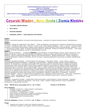 PRZEDSIĘBIORSTWO TURYSTYCZNE „BASZTA” KRYSTYN TSCHURL UL.PRZYPADEK 43A/5 88-100 INOWROCŁAW e- mail: [email protected] Tel: 604 052 131 GWARANCJA UBEZPIECZENIOWA INTER FIRMA WPISANA DO REJESTRU ORGANIZATORÓW TURYSTYKI I POŚREDNIKÓW TURYSTYCZNYCH MARSZAŁKA WOJEWÓDZTWA KUJAWSKO-POMORSKIEGO POD NUMEREM 224 Cesarskie zabytki Wiednia Nove Mesto Twierdza Kłodzko Kompleks „Riese” – czyli tajemnice Gór Sowich DZIEŃ 1 Zbiórka uczestników zgodnie z życzeniem kierownika grupy i przejazd do miejsca zakwaterowania. Obiadokolacja , nocleg. DZIEŃ 2 Śniadanie, wyjazd do miejscowości Nove Mesto - Perła architektury renesansowej w Czechach. Średniowieczne miasto na skale o wysokości około 40m. otoczone z trzech stron rzeką Metują założone w 1501 r. Rynek z renesansowymi szczytami i barokowymi podcieniami, miejski zespół zabytkowy, gotycki Kościół Trójcy Przenajświętszej- założony w 1513 r., renesansowy zamek i ogród. W drodze powrotnej zakupy w Nachodzie. Powrót do Kudowy lub Dusznik , czas wolny na spacer po Parku Zdrojowym ,powrót na obiadokolację i nocleg. DZIEŃ 3 Nocny wyjazd do Wiednia , . zwiedzanie WIEDNIA z przewodnikiem. Przejazd Ringiem: Opera, muzea, Parlament, Teatr Nadworny, Ratusz, Uniwersytet, Park Miejski z pomnikiem J. Straussa, spacer po starówce, Katedra św. Szczepana , Hofburg – dawna rezydencja Habsburgów, Ratusz, Dom Hundertwassera ,Wzgórze Kahlenberg – miejsce związane z Janem III Sobieskim i odsieczą wiedeńską. Powrót do kraju w późnych godzinach wieczornych, po drodze obiadokolacja w Czechach DZIEŃ 4 Śniadanie, przejazd do Kudowy , Park Narodowy Gór Stołowych – Szczeliniec Wielki - piesze wejście i zejście z przewodnikiem.Przejazd do Kłodzka , zwiedzanie z przewodnikiem – Kłodzko posiada znaczący zespół zabytkowych obiektów. W śródmieściu, powstałym według XIII i XIV-wiecznego założenia urbanistycznego, znajdują się budowle reprezentujące różne style architektoniczne. Można podziwiać kolorowe, pochodzące z różnych wieków kamieniczki, imponujący ratusz z II połowy XIX w., gotycki most z XIV w., będący unikatem na skalę krajową, który zdobi sześć barokowych figur, kościół pw. Wniebowzięcia NMP, najwspanialszy obiekt sakralny Kłodzka, budowany z przerwami od XIV do XVI w. i górującą nad miastem twierdzę z XVII i XVIII w., która zafascynuje nie tylko miłośników architektury militarnej. Na każdym kroku zobaczymy, najczęściej barokowe, pełnoplastyczne figury świętych, które w intencji dawnych mieszkańców miały strzec miasto przed powodziami, pożarami i epidemiami. W programie : Twierdza , starówka Kłodzka - bogata w ciekawe formy architektoniczne , podziemna trasa turystyczna , czas wolny , przejazd do Polanicy – Zdrój , rekreacyjny spacer z przewodnikiem po części zdrojowej miejscowości , powrót do miejsca zakwaterowania, obiadokolacja , nocleg DZIEŃ 5 Śniadanie , przejazd do Osówki - miejscowości która kryje jedną z wielu tajemnic II wojny światowej – fragment kompleksu „Riese”. Przejazd do Wrocławia , czas wolny , obiad , wyjazd w drogę powrotną. Powrót w godzinach wieczornych , zakończenie wycieczki. Cena: 845,00 zł/os. przy grupie 35 os + ok. 17 Euro Termin: 6-10.06.2012 Cena obejmuje: przejazdy autokarem + opłaty drogowe i parkingowe 4 noclegi , pokoje z łazienkami 4 śniadania, 3 obiadokolacje, 1 obiad bilety wstępu do zwiedzanych obiektów z wyjątkiem Wiednia opłaty za miejscowego przewodnika w Wiedniu opiekę i informację turystyczną pilota ubezpieczenie Cena nie obejmuje: wstępów we Wiedniu ( ok. 17 Euro ), wydatków osobistych. Uwagi: program jest ramowy i może ulec drobnym zmianom dokument niezbędny do wyjazdu: dowód osobisty lub paszport