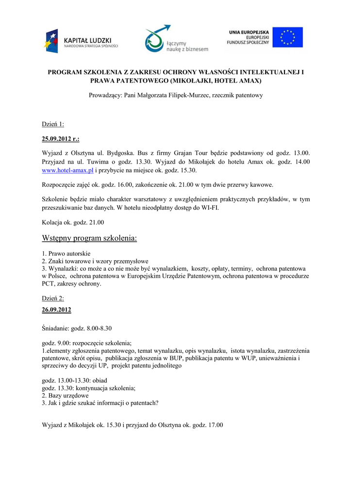 PROGRAM SZKOLENIA Z ZAKRESU OCHRONY WŁASNOŚCI INTELEKTUALNEJ I PRAWA PATENTOWEGO (MIKOŁAJKI, HOTEL AMAX) Prowadzący: Pani Małgorzata Filipek-Murzec, rzecznik patentowy Dzień 1: 25.09.2012 r.: Wyjazd z Olsztyna ul. Bydgoska. Bus z firmy Grajan Tour będzie podstawiony od godz. 13.00. Przyjazd na ul. Tuwima o godz. 13.30. Wyjazd do Mikołajek do hotelu Amax ok. godz. 14.00 www.hotel-amax.pl i przybycie na miejsce ok. godz. 15.30. Rozpoczęcie zajęć ok. godz. 16.00, zakończenie ok. 21.00 w tym dwie przerwy kawowe. Szkolenie będzie miało charakter warsztatowy z uwzględnieniem praktycznych przykładów, w tym przeszukiwanie baz danych. W hotelu nieodpłatny dostęp do WI-FI. Kolacja ok. godz. 21.00 Wstępny program szkolenia: 1. Prawo autorskie 2. Znaki towarowe i wzory przemysłowe 3. Wynalazki: co może a co nie może być wynalazkiem, koszty, opłaty, terminy, ochrona patentowa w Polsce, ochrona patentowa w Europejskim Urzędzie Patentowym, ochrona patentowa w procedurze PCT, zakresy ochrony. Dzień 2: 26.09.2012 Śniadanie: godz. 8.00-8.30 godz. 9.00: rozpoczęcie szkolenia; 1.elementy zgłoszenia patentowego, temat wynalazku, opis wynalazku, istota wynalazku, zastrzeżenia patentowe, skrót opisu, publikacja zgłoszenia w BUP, publikacja patentu w WUP, unieważnienia i sprzeciwy do decyzji UP, projekt patentu jednolitego godz. 13.00-13.30: obiad godz. 13.30: kontynuacja szkolenia; 2. Bazy urzędowe 3. Jak i gdzie szukać informacji o patentach? Wyjazd z Mikołajek ok. 15.30 i przyjazd do Olsztyna ok. godz. 17.00