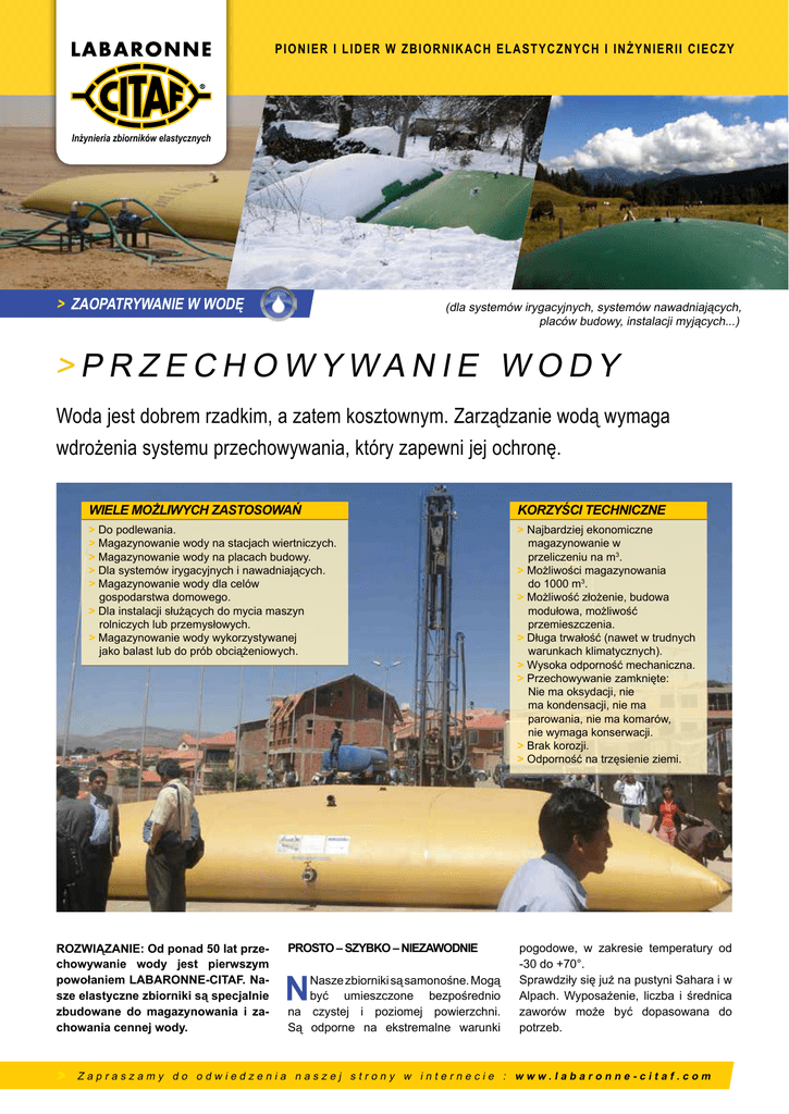PIONIER I LIDER W ZBIORNIKACH ELASTYCZNYCH I INŻYNIERI I CIECZY Inżynieria zbiorników elastycznych > ZAOPATRYWANIE W WODĘ (dla systemów irygacyjnych, systemów nawadniających, placów budowy, instalacji myjących...) >PRZECHOWYWANIE WODY Woda jest dobrem rzadkim, a zatem kosztownym. Zarządzanie wodą wymaga wdrożenia systemu przechowywania, który zapewni jej ochronę. WIELE MOŻLIWYCH ZASTOSOWAŃ KORZYŚCI TECHNICZNE >>Do podlewania. >>Magazynowanie wody na stacjach wiertniczych. >>Magazynowanie wody na placach budowy. >>Dla systemów irygacyjnych i nawadniających. >>Magazynowanie wody dla celów gospodarstwa domowego. >>Dla instalacji służących do mycia maszyn rolniczych lub przemysłowych. >>Magazynowanie wody wykorzystywanej jako balast lub do prób obciążeniowych. >>Najbardziej ekonomiczne magazynowanie w przeliczeniu na m3. >>Możliwości magazynowania do 1000 m3. >>Możliwość złożenie, budowa modułowa, możliwość przemieszczenia. >>Długa trwałość (nawet w trudnych warunkach klimatycznych). >>Wysoka odporność mechaniczna. >>Przechowywanie zamknięte: Nie ma oksydacji, nie ma kondensacji, nie ma parowania, nie ma komarów, nie wymaga konserwacji. >>Brak korozji. >>Odporność na trzęsienie ziemi. ROZWIĄZANIE: Od ponad 50 lat przechowywanie wody jest pierwszym powołaniem LABARONNE-CITAF. Nasze elastyczne zbiorniki są specjalnie zbudowane do magazynowania i zachowania cennej wody. > PROSTO – SZYBKO – NIEZAWODNIE N Nasze zbiorniki są samonośne. Mogą być umieszczone bezpośrednio na czystej i poziomej powierzchni. Są odporne na ekstremalne warunki pogodowe, w zakresie temperatury od -30 do +70°. Sprawdziły się już na pustyni Sahara i w Alpach. Wyposażenie, liczba i średnica zaworów może być dopasowana do potrzeb. Zapraszamy do odwiedzenia naszej strony w internecie : www.labaronne-citaf.com > ZAOPATRYWANIE W WODĘ > PRZECHOWYWANIE WODY PRODUKTY > Łatwa i szybka instalacja, w 4 etapach >>1- Rozpakowanie >>2- Rozwinięcie >>3- Rozłożenie >>4- Gotowe! > Cysterna elastyczna, zamknięta, samonośna LA B A R O NN ŚĆ O E N OD PO 5 cm F ITA -C R Elastyczna cysterna to najszybsze rozwiązanie nie wymagające żadnej, specjalnej konserwacji. Dostępne są pojemności od 1 do 1000 m 3. Rozmiary pustego zbiornika wm Wysokość maksymalna w m Masa własna w kg 5 10 50 100 300 500 1000 3,40x2,96 5,70x2,96 9,25x5,92 10,40x8,88 20,80x11,84 22,15x19,24 28,20x25,16 0,85 1,00 1,40 1,55 1,50 1,40 1,60 20 39 148 213 660 1141 2039 cm Inne pojemności i rozmiary są możliwe, prosimy o kontakt – BEZPŁATNY KOSZTORYS Dotyczy zbiorników elastycznych, zamkniętych. na 5 rozciąganie: 4 L ŚĆ 0 >Cysterna elastyczna, otwarta, samopodnośna A B A R ON NE -C Elastyczne cysterny umożliwiają szybkie napełnienie od góry a także całkowite oczyszczenie dolnej części. Dostępne są pojemności od 1 do 300 m 3. JA AF IT K no O Pojemność w m3 /5 or ść Zasada budowy zbiornika samonośnego Kg Odp 450Kg Kilka parametrów technicznych w ar st hn lo ic zn Wie a >Cysterna elastyczna, transportowa wo wa tkanina te c Łatwa instalacja na przyczepie ciężarówki typu plateau lub na wozie asenizacyjnym z uchwytem, dzięki elastycznej cysternie unikają Państwo unieruchomienia pojazdu lub potrzeby jego wynajmu. Dostępne są pojemności od 850 do 18 000 litrów. Projekt i produkcja: >Szczelność otwarta lub zamknięta Nasze tkaniny powlekane PCV, uzbrojone poliestrem o gramaturze od 900 do 1300 g/m2 doskonale sprawdzają się w realizacji szczelności zbiorników otwartych jak i zamkniętych. Dystrybutor : Inżynieria zbiorników elastycznych * * flexible tank • cisterna flexible • flexible zistern • cisterna flessibile • ZI DE MONPLAISIR - RUE DU CHAMP DE COURSES - BP39 - 38781 PONT EVEQUE CEDEX - FRANCE Tél. : +33 (0)4 74 31 40 40 - fax : +33 (0)4 74 31 40 41 - [email protected] > Zapraszamy do odwiedzenia naszej strony w internecie : www.labaronne-citaf.com