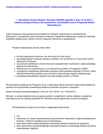 Projekty badawcze finansowane przez NCBiR ( badania stosowane i wdrożenia) 1. Narodowe Centrum Badań i Rozwoju (NCBiR) ogłosiło w dniu 16.12.2014 r. ostatnią edycją konkursu dla naukowców i przedsiębiorców w Programie Badań Stosowanych. Celem programu jest poszerzenie kompetencji młodych naukowców w samodzielnym planowaniu, zarządzaniu oraz kierowaniu własnymi zespołami badawczymi, podczas realizacji projektów badawczych, których wyniki mogą być wdrożone w gospodarce. Program adresowany jest do osób, które: do dnia ogłoszenia konkursu nie ukończyły 35 roku życia, posiadają stopień naukowy doktora uzyskany nie wcześniej niż 5 lat przed rokiem ogłoszenia konkursu, są autorami publikacji w renomowanych czasopismach naukowych, bądź posiadają patenty lub wdrożenia, dotychczas nie uczestniczyły w roli kierownika projektu w Programie LIDER, uzyskają do współpracy jednostkę naukową, która posiada siedzibę w Polsce i która zatrudni kierownika projektu oraz członków utworzonego zespołu badawczego, posiadają obywatelstwo polskie lub kartę stałego pobytu w Polsce. Wnioskodawca aplikuje do Programu wraz z Jednostką, którą może być organizacja badawcza (publiczna lub prywatna) prowadząca badania naukowe lub prace rozwojowe. Nabór wniosków jest jednoetapowy i trwa od 15.01.2015 r. do 15.03.2015 r. Wnioski w wersji elektronicznej (w języku polskim i angielskim) należy składać w systemie informatycznym do obsługi projektów SI. Złożenie wersji papierowej nie jest wymagane. Wnioskodawca załącza do wniosku następujące dokumenty: CV, referencje od dwóch samodzielnych pracowników naukowych, bądź przedstawicieli biznesu, z którymi współpracuje wnioskodawca, skan dokumentu potwierdzającego tożsamość (dowód osobisty lub paszport). skan dokumentu potwierdzającego posiadanie stopnia naukowego doktora lub tytułu zawodowego magistra, zawodowego magistra, oświadczenie woli wnioskodawcy potwierdzające zgodność danych i informacji zamieszczonych we wniosku i dokumentach do niego załączonych ze stanem faktycznym i prawnym, oraz sporządzone w oparciu o wzory umieszczone w SI: oświadczenie o niefinansowaniu zadań objętych wnioskiem ze środków pochodzących z innych źródeł i nieubieganiu się o ich finansowanie z innych źródeł, oświadczenie o niezaleganiu w wpłatami z tytułu należności budżetowych oraz opłacaniem składek na ubezpieczenia społeczne i zdrowotne, oświadczenie jednostki o zdolności do rzetelnego wydatkowania środków publicznych, pełnomocnictwo osoby upoważnionej do reprezentowania jednostki lub kopię dokumentu poświadczającego umocowanie takiej osoby do reprezentowania jednostki. Wnioskodawca może złożyć w konkursie tylko jeden wniosek. Przed przystąpieniem do redakcji wniosku i bardzo przydatnym dla właściwego opracowania wniosku jest zapoznanie się z tekstem ogłoszenia konkursowego oraz danych wymaganych we wniosku, które znajdują się na stronie www.ncbir.gov.pl/lider/lider-vi-edycja/materiały-do pobrania. Wnioskodawca wypełnia w systemie SI pola wniosku oraz załącza oświadczenie w postaci skanu podpisanego dokumentu w formacie PDF. Proszę przygotować treść oświadczeń i przekazać je do Działu Nauki celem uzyskania podpisu JM Rektora. Ze względów organizacyjnych, termin przyjmowania oświadczeń do podpisu ustala się do 11 marca 2015 r. Informuję, że Składający wniosek drogą elektroniczną obowiązany jest złożyć w Dziale Nauki KARTĘ PROJEKTU (zarządzenie Rektora Politechniki Koszalińskiej Nr 25/2005). Mirosława Pilewska-Markiewicz Kierownik Działu Nauki tel. 94, 3478. 627 e-mail: [email protected] Archiwum