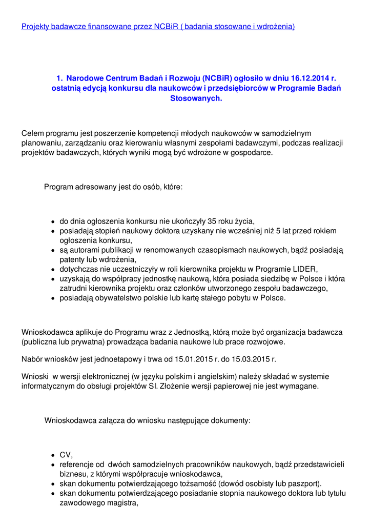 1. Narodowe Centrum Badań i Rozwoju (NCBiR) ogłos