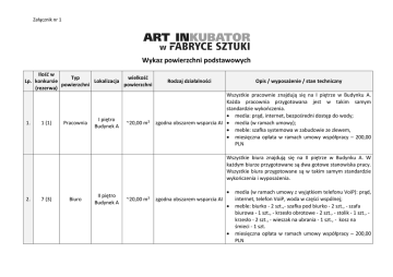 Załącznik nr 1 Wykaz powierzchni podstawowych Ilość w Typ wielkość Lp. konkursie Lokalizacja powierzchni powierzchni (rezerwa) 1. 1 (1) Pracownia I piętro Budynek A ~20,00 m² Rodzaj działalności Opis / wyposażenie / stan techniczny Wszystkie pracownie znajdują się na I piętrze w Budynku A. Każda pracownia przygotowana jest w takim samym standardzie wykończenia. media: prąd, internet, bezpośredni dostęp do wody; zgodna obszarem wsparcia AI media (w ramach umowy); meble: szafka systemowa w zabudowie ze zlewem, miesięczna opłata w ramach umowy współpracy – 200,00 PLN Wszystkie biura znajdują się na II piętrze w Budynku A. W każdym biurze przygotowane są dwa gotowe stanowiska pracy. Wszystkie biura przygotowane są w takim samym standardzie wykończenia i wyposażenia. 2. 7 (3) Biuro II piętro Budynek A ~20,00 m² zgodna obszarem wsparcia AI media (w ramach umowy z wyjątkiem telefonu VoiP): prąd, internet, telefon VoiP, woda w części wspólnej; meble: biurko - 2 szt.,- szafka pod biurko - 2 szt., - szafa biurowa - 1 szt., - krzesło obrotowe - 2 szt., - stolik - 1 szt., krzesło - 2 szt., - wieszak na ubrania - 1 szt., - kosz na śmieci - 1 szt. miesięczna opłata w ramach umowy współpracy – 200,00 PLN Załącznik nr 1 3. 3 (1) Galeria artystyczna Łączna Parter wielkość Budynek B powierzchni - ~30,00 m² zgodna obszarem wsparcia AI , a w szczególności: prowadzenie działalności usługowej, handlowej (dla towarów będących wynikiem działalności designerskiej, rękodzielniczej, artystycznej - dotyczy to unikatowych lub krótkoseryjnych produkcji), galerii sztuki, księgarń, antykwariatów. W skład każdej galerii wchodzą dwa pomieszczenia (galeria i zaplecze galerii). Każda galeria posiada dwa wejścia : jedno niezależne, ogólnie dostępne dla każdego klienta z boku budynku B. Drugie od strony zaplecza ze wspólnego korytarza, stanowiącego część wspólną dla wszystkich galerii. Wejście to jest dostępne tylko ze środka budynku B. media (w ramach umowy): prąd, internet, woda w części wspólnej, wykończenie: stan surowy do adaptacji w ramach uzgodnień z AI miesięczna opłata w ramach umowy współpracy – 300,00 PLN