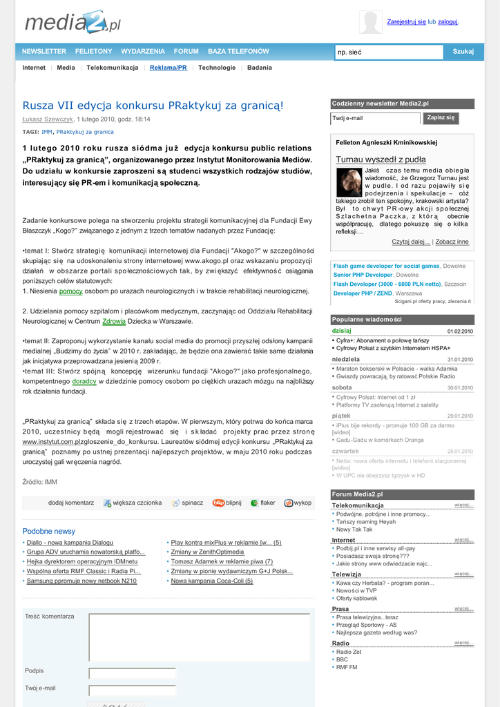 Zarejestruj się lub zaloguj. NEWSLETTER FELIETONY WYDARZENIA FORUM BAZA TELEFONÓW Szukaj np. sieć Internet | Media | Telekomunikacja | Reklama/PR | Technologie | Badania Rusza VII edycja konkursu PRaktykuj za granicą! Codzienny newsletter Media2.pl Łukasz Szewczyk, 1 lutego 2010, godz. 18:14 Twój e-mail Zapisz się TAGI: IMM, PRaktykuj za granica 1 lutego 2010 roku rusza siódma ju ż edycja konkursu public relations „PRaktykuj za granicą”, organizowanego przez Instytut Monitorowania Mediów. Do udziału w konkursie zaproszeni są studenci wszystkich rodzajów studiów, interesujący się PR-em i komunikacją społeczną. Zadanie konkursowe polega na stworzeniu projektu strategii komunikacyjnej dla Fundacji Ewy Błaszczyk „Kogo?” związanego z jednym z trzech tematów nadanych przez Fundację: Felieton Agnieszki Kminikowskiej Turnau wyszedł z pudła Jakiś c z a s t e m u m e d i a o b i e g ła wiadomość, że Grzegorz Turnau jest w p u d l e . I o d r a z u p o j a w i ły s i ę podejrzenia i spekulacje – cóż takiego zrobił ten spokojny, krakowski artysta? Był t o c h w y t P R -o w y a k c j i s p o łecznej S z l a c h e t n a P a c z k a , z k t ó r ą obecnie współpracuję, dlatego pokusz ę się o kilka refleksji… Czytaj dalej... | Zobacz inne •temat I: Stwórz strategi ę komunikacji internetowej dla Fundacji "Akogo?" w szczególno ści skupiając si ę na udoskonaleniu strony internetowej www.akogo.pl oraz wskazaniu propozycji działań w obszarze portali spo łecznościowych tak, by zwi ększyć efektywnoś ć osiągania poniższych celów statutowych: Flash game developer for social games, Dowolne 1. Niesienia pomocy osobom po urazach neurologicznych i w trakcie rehabilitacji neurologicznej. Developer PHP / ZEND, Warszawa Senior PHP Developer, Dowolne Flash Developer (3000 - 6000 PLN netto), Szczecin Scigani.pl oferty pracy, zlecenia it 2. Udzielania pomocy szpitalom i placówkom medycznym, zaczynając od Oddziału Rehabilitacji Neurologicznej w Centrum Zdrowia Dziecka w Warszawie. Popularne wiadomo ści dzisiaj 01.02.2010 •temat II: Zaproponuj wykorzystanie kanału social media do promocji przyszłej odsłony kampanii medialnej „Budzimy do życia” w 2010 r. zakładając, że będzie ona zawierać takie same działania jak inicjatywa przeprowadzana jesienią 2009 r. • Cyfra+: Abonament o połowę tańszy • Cyfrowy Polsat z szybkim Internetem HSPA+ •temat III: Stwórz spójn ą koncepcję wizerunku fundacji "Akogo?" jako profesjonalnego, kompetentnego doradcy w dziedzinie pomocy osobom po ciężkich urazach mózgu na najbliższy rok działania fundacji. • Maraton bokserski w Polsacie - walka Adamka • Gwiazdy powracają, by ratować Polskie Radio niedziela sobota granicą” poznamy po ustnej prezentacji najlepszych projektów, w maju 2010 roku podczas uroczystej gali wręczenia nagród. 30.01.2010 • Cyfrowy Polsat: Internet od 1 zł • Platformy TV zaoferują Internet z satelity piątek „PRaktykuj za granicą” składa się z trzech etapów. W pierwszym, który potrwa do końca marca 2010, uczestnicy b ędą mogli rejestrowa ć się i s k ładać projekty prac przez stron ę www.instytut.com.plzgloszenie_do_konkursu. Laureatów siódmej edycji konkursu „PRaktykuj za 31.01.2010 29.01.2010 • iPlus bije rekordy - promuje 100 GB za darmo [wideo] • Gadu-Gadu w komórkach Orange czwartek 28.01.2010 • Netia: nowa oferta internetu i telefonii stacjonarnej [wideo] • W UPC nie obejrzysz Igrzysk w HD Źródło: IMM Forum Media2.pl dodaj komentarz większa czcionka spinacz blipnij flaker Podobne newsy • Diallo - nowa kampania Dialogu • Play kontra mixPlus w reklamie [w... (5) • Grupa ADV uruchamia nowatorską platfo... • Zmiany w ZenithOptimedia • Hejka dyrektorem operacyjnym IDMnetu • Tomasz Adamek w reklamie piwa (7) • Wspólna oferta RMF Classic i Radia Pi... • Zmiany w pionie wydawniczym G+J Polsk... • Samsung ppromuje nowy netbook N210 • Nowa kampania Coca-Coli (5) Treść komentarza Podpis Twój e-mail wykop Telekomunikacja • Podwójne, potrójne i inne promocy... • Tańszy roaming Heyah • Nowy Tak Tak więcej... Internet • Podbij.pl i inne serwisy all -pay • Posiadasz swoja stron ę??? • Jakie strony www odwiedzacie najc... więcej... Telewizja • Kawa czy Herbata? - program poran... • Nowości w TVP • Oferty kablowek więcej... Prasa • Prasa telewizyjna...teraz • Przegląd Sportowy - AS • Najlepsza gazeta według was? więcej... Radio • Radio Zet • BBC • RMF FM więcej... Przepisz kod Nie chcesz wpisywa ć kodu? Zarejestruj się lub zaloguj. Dodaj komentarz © 2004-2010 Kreativ Sp. z o.o. Reklama | Kontakt