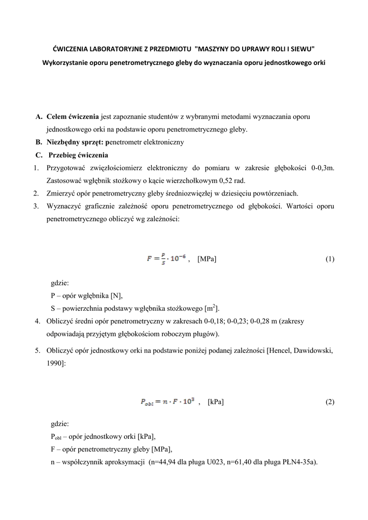 ĆWICZENIA LABORATORYJNE Z PRZEDMIOTU "MASZYNY DO UPRAWY ROLI I SIEWU" Wykorzystanie oporu penetrometrycznego gleby do wyznaczania oporu jednostkowego orki A. Celem ćwiczenia jest zapoznanie studentów z wybranymi metodami wyznaczania oporu jednostkowego orki na podstawie oporu penetrometrycznego gleby. B. Niezbędny sprzęt: penetrometr elektroniczny C. Przebieg ćwiczenia 1. Przygotować zwięzłościomierz elektroniczny do pomiaru w zakresie głębokości 0-0,3m. Zastosować wgłębnik stożkowy o kącie wierzchołkowym 0,52 rad. 2. Zmierzyć opór penetrometryczny gleby średniozwięzłej w dziesięciu powtórzeniach. 3. Wyznaczyć graficznie zależność oporu penetrometrycznego od głębokości. Wartości oporu penetrometrycznego obliczyć wg zależności: , [MPa] (1) gdzie: P – opór wgłębnika [N], S – powierzchnia podstawy wgłębnika stożkowego [m2]. 4. Obliczyć średni opór penetrometryczny w zakresach 0-0,18; 0-0,23; 0-0,28 m (zakresy odpowiadają przyjętym głębokościom roboczym pługów). 5. Obliczyć opór jednostkowy orki na podstawie poniżej podanej zależności [Hencel, Dawidowski, 1990]: , [kPa] gdzie: Pobl – opór jednostkowy orki [kPa], F – opór penetrometryczny gleby [MPa], n – współczynnik aproksymacji (n=44,94 dla pługa U023, n=61,40 dla pługa PŁN4-35a). (2) 6. Obliczyć opór jednostkowy orki korzystając z równania Oscoul: , [kPa] (3) gdzie: Pobl – opór jednostkowy orki [kPa],γ F – opór penetrometryczny gleby [MPa], γ – ciężar objętościowy gleby [kN·m-3], przyjąć wartości typowe dla okresu uprawy roli, g – przyśpieszenie ziemskie [m·s-2], v – prędkość orki [m·s-1], θs – kąt ustawienia skrzydła odkładnicy [rad] (0,79 rad – U023, 0,77 rad – PŁN4-35a), K1, K2, współczynniki empiryczne (wg. National Institute of Agricultural Engineering K1=50, K2=9,66. 7. Wyniki obliczeń wykonane oporu penetrometrycznego i oporu jednostkowego gleby zamieścić w tabeli 1. Tab. 1. Opór jednostkowy orki wykonanej pługami U023 i PŁN4-35a i opór penetrometryczny Typ Zastosowana pługa metoda, głębokość orki głębokość orki 0,18 m 0,23 m 0,28 m F [MPa] P [kPa] F [MPa] P [kPa] F [MPa] P [kPa] 1,15 61 1,13 47 1,18 68 1,15 79 1,15 75 1,16 64 Pomiar U023 Głębokość orki Hencel, Dawidowski Oscoul PŁN4- Pomiar Hencel, Dawidowski 35a Oscoul D. Sprawozdanie powinno zawierać: - wykres zależności oporu penetrometrycznego od głębokości, - tabelę 1 z wynikami obliczeń, - analizę uzyskanych wyników, - wnioski. Literatura pomocnicza Bernacki H., Haman J., Kanafojski C. 1967. Teoria i konstrukcja maszyn rolniczych. T. 1. PWRiL, Warszawa. Gach S., Kuczewski J., Waszkiewicz C. 1991. Maszyny rolnicze. Elementy teorii i obliczeń. Wyd. SGGW, Warszawa. Hencel A., Dawidowski B. 1990. Energetyczne ocena pracy korpusów płużnych. Część II. Wykorzystanie oporu penetrometrycznego gleby do wyznaczania siły uciągu korpusu. Zeszyty Naukowe AR Szczecin. 141, 135-142.