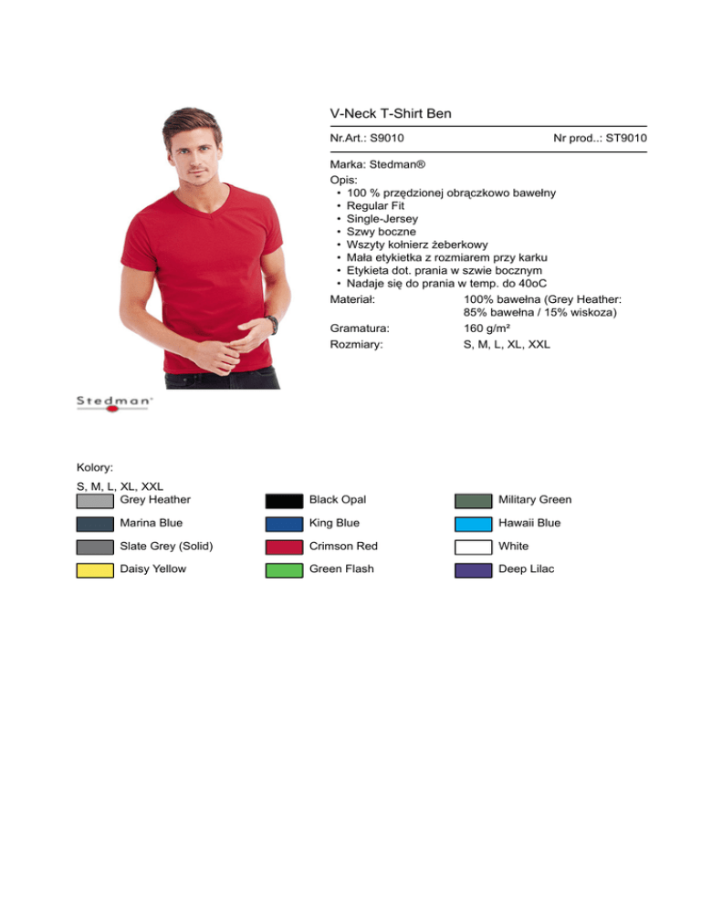 V-Neck T-Shirt Ben Nr.Art.: S9010 Nr prod..: ST9010 Marka: Stedman® Opis: • 100 % przędzionej obrączkowo bawełny • Regular Fit • Single-Jersey • Szwy boczne • Wszyty kołnierz żeberkowy • Mała etykietka z rozmiarem przy karku • Etykieta dot. prania w szwie bocznym • Nadaje się do prania w temp. do 40oC Materiał: 100% bawełna (Grey Heather: 85% bawełna / 15% wiskoza) Gramatura: 160 g/m² Rozmiary: S, M, L, XL, XXL Kolory: S, M, L, XL, XXL Grey Heather Black Opal Military Green Marina Blue King Blue Hawaii Blue Slate Grey (Solid) Crimson Red White Daisy Yellow Green Flash Deep Lilac