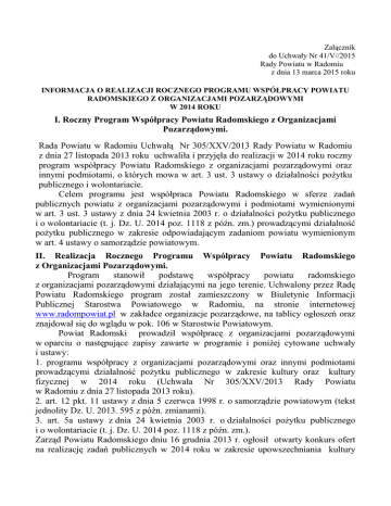 Załącznik do Uchwały Nr 41/V//2015 Rady Powiatu w Radomiu z dnia 13 marca 2015 roku INFORMACJA O REALIZACJI ROCZNEGO PROGRAMU WSPÓŁPRACY POWIATU RADOMSKIEGO Z ORGANIZACJAMI POZARZĄDOWYMI W 2014 ROKU I. Roczny Program Współpracy Powiatu Radomskiego z Organizacjami Pozarządowymi. Rada Powiatu w Radomiu Uchwałą Nr 305/XXV/2013 Rady Powiatu w Radomiu z dnia 27 listopada 2013 roku uchwaliła i przyjęła do realizacji w 2014 roku roczny program współpracy Powiatu Radomskiego z organizacjami pozarządowymi oraz innymi podmiotami, o których mowa w art. 3 ust. 3 ustawy o działalności pożytku publicznego i wolontariacie. Celem programu jest współpraca Powiatu Radomskiego w sferze zadań publicznych powiatu z organizacjami pozarządowymi i podmiotami wymienionymi w art. 3 ust. 3 ustawy z dnia 24 kwietnia 2003 r. o działalności pożytku publicznego i o wolontariacie (t. j. Dz. U. 2014 poz. 1118 z późn. zm.) prowadzącymi działalność pożytku publicznego w zakresie odpowiadającym zadaniom powiatu wymienionym w art. 4 ustawy o samorządzie powiatowym. II. Realizacja Rocznego Programu Współpracy Powiatu Radomskiego z Organizacjami Pozarządowymi. Program stanowił podstawę współpracy powiatu radomskiego z organizacjami pozarządowymi działającymi na jego terenie. Uchwalony przez Radę Powiatu Radomskiego program został zamieszczony w Biuletynie Informacji Publicznej Starostwa Powiatowego w Radomiu, na stronie internetowej www.radompowiat.pl w zakładce organizacje pozarządowe, na tablicy ogłoszeń oraz znajdował się do wglądu w pok. 106 w Starostwie Powiatowym. Powiat Radomski prowadził współpracę z organizacjami pozarządowymi w oparciu o następujące zapisy zawarte w programie i poniżej cytowane uchwały i ustawy: 1. programu współpracy z organizacjami pozarządowymi oraz innymi podmiotami prowadzącymi działalność pożytku publicznego w zakresie kultury oraz kultury fizycznej w 2014 roku (Uchwała Nr 305/XXV/2013 Rady Powiatu w Radomiu z dnia 27 listopada 2013 roku). 2. art. 12 pkt. 11 ustawy z dnia 5 czerwca 1998 r. o samorządzie powiatowym (tekst jednolity Dz. U. 2013. 595 z późn. zmianami). 3. art. 5a ustawy z dnia 24 kwietnia 2003 r. o działalności pożytku publicznego i o wolontariacie (t. j. Dz. U. 2014 poz. 1118 z późn. zm.). Zarząd Powiatu Radomskiego dniu 16 grudnia 2013 r. ogłosił otwarty konkurs ofert na realizację zadań publicznych w 2014 roku w zakresie upowszechniania kultury oraz kultury fizycznej. Wysokość środków publicznych przeznaczonych na realizację zadań w zakresie kultury w roku 2014 wyniosła 5 050 zł, natomiast w zakresie kultury fizycznej wynosiła 46 460 zł. Termin składania ofert w siedzibie Starostwa Powiatowego w Radomiu przez podmioty uprawnione upłynął 8 stycznia 2014 roku. Zgodnie z art. 13 pkt.2 ustawy z dnia 24 kwietnia 2003 r. o działalności pożytku publicznego i o wolontariacie (t. j. Dz. U. 2014 poz.1118 z późn. zm.) zachowano termin ogłoszenia konkursu - nie może być krótszy niż 21 dni od dnia ukazania się ostatniego ogłoszenia. Uchwałą Nr 433/2014 Zarząd Powiatu Radomskiego z dnia 8 stycznia 2014 r. powołał komisję konkursową w celu dokonania wyboru ofert organizacji pozarządowych złożonych w odpowiedzi na ogłoszony konkurs. Komisja konkursowa zgodnie z Uchwałą Zarządu Powiatu, zebrała się 14 stycznia 2014 r. W jej skład weszły następujące osoby: 1. przewodniczący - Marian Oleszczuk – naczelnik Wydziału Promocji i Rozwoju Powiatu, 2. wiceprzewodniczący-Marek Jarosz – członek Zarządu Powiatu Radomskiego, 3. członkowie: a) Włodzimierz Bojarski – zastępca naczelnika Wydziału Promocji i Rozwoju Powiatu, b) Bożena Walos – inspektor w Wydziale Promocji i Rozwoju Powiatu, c) Alfred Świątek – sekretarz Powiatowej Rady Sportu. Na realizację zadań w zakresie kultury w 2014 roku Powiat przeznaczył kwotę 5 050 zł, natomiast w zakresie kultury fizycznej kwotę 46 460 zł. W odpowiedzi na konkurs wpłynęła jedna oferta zgłoszona przez organizację pozarządową na realizację zadań w zakresie kultury, która spełniły wymogi określone w ustawie o działalności pożytku publicznego i o wolontariacie. W zakresie kultury fizycznej wpłynęło 21 ofert na realizację zadań. Wymogi określone w ustawie o działalności pożytku publicznego i o wolontariacie oraz warunki i kryteria ogłoszonego konkursu spełniło 20 ofert. Jedna oferta z UKS Odechów z gminy Skaryszew złożona była na zadanie o zasięgu gminnym. Ponadto nie zawierała wymaganych załączników. Komisja dokonała również oceny dwóch ofert złożonych przez GKS Jaguar z Wolanowa i PTS z Pionek na realizację takiego samego zadania tj. „XIII Międzypowiatowego Turnieju Piłki Siatkowej Mężczyzn o Puchar Przewodniczącego Rady Powiatu”. Wybrano korzystniejszą ofertę o szerszym zakresie, z udziałem większej ilości drużyn, złożoną na realizację w/w zadania przez GKS Jaguar z Wolanowa. Ponadto klub sportowy Jaguar dysponuje nowocześniejszą bazą sportową do realizacji tego przedsięwzięcia. W rozpatrywanych ofertach wzięte były pod uwagę: zgodność oferowanego zadania z priorytetowymi działaniami określonymi w ogłoszeniu konkursu ofert, kompletny opis działań, efektywny budżet, realne koszty, dostępność planowanego przedsięwzięcia dla mieszkańców powiatu radomskiego, wysokość środków publicznych oraz udział środków własnych na realizację zadania. Bardzo ważnym kryterium było również doświadczenie w realizacji podobnych zadań, efektywność, rzetelność i jakość wykonania zadania w poprzednich latach, a także prawidłowe wykorzystanie środków publicznych oraz prowadzenie wymaganej dokumentacji. Informację o przyznanych środkach finansowych przekazano organizacjom pisemnie. Złożone oferty nie wymagały uzupełnienia. Wymagane było jedynie przesłanie korekty kosztorysu dostosowanej do wysokości przyznanej dotacji