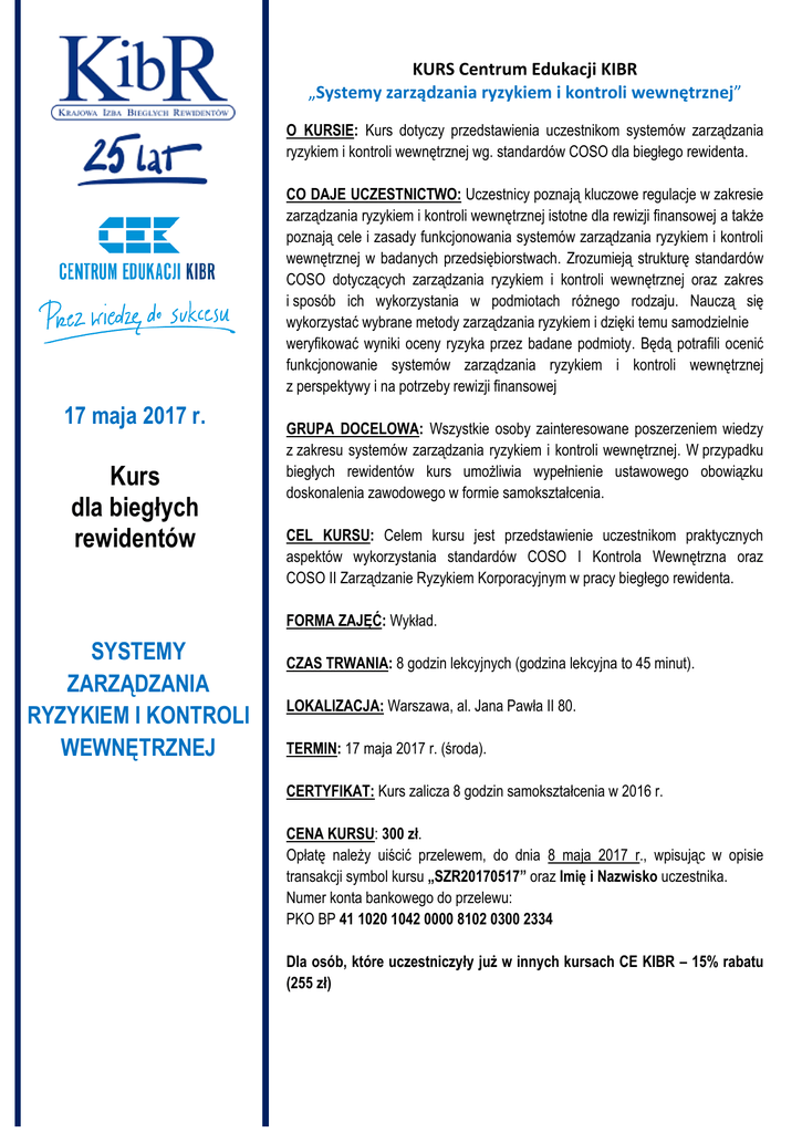 KURS Centrum Edukacji KIBR „Systemy zarządzania ryzykiem i kontroli wewnętrznej” O KURSIE: Kurs dotyczy przedstawienia uczestnikom systemów zarządzania ryzykiem i kontroli wewnętrznej wg. standardów COSO dla biegłego rewidenta. CO DAJE UCZESTNICTWO: Uczestnicy poznają kluczowe regulacje w zakresie zarządzania ryzykiem i kontroli wewnętrznej istotne dla rewizji finansowej a także poznają cele i zasady funkcjonowania systemów zarządzania ryzykiem i kontroli wewnętrznej w badanych przedsiębiorstwach. Zrozumieją strukturę standardów COSO dotyczących zarządzania ryzykiem i kontroli wewnętrznej oraz zakres i sposób ich wykorzystania w podmiotach różnego rodzaju. Nauczą się wykorzystać wybrane metody zarządzania ryzykiem i dzięki temu samodzielnie weryfikować wyniki oceny ryzyka przez badane podmioty. Będą potrafili ocenić funkcjonowanie systemów zarządzania ryzykiem i kontroli wewnętrznej z perspektywy i na potrzeby rewizji finansowej 17 maja 2017 r. Kurs dla biegłych rewidentów GRUPA DOCELOWA: Wszystkie osoby zainteresowane poszerzeniem wiedzy z zakresu systemów zarządzania ryzykiem i kontroli wewnętrznej. W przypadku biegłych rewidentów kurs umożliwia wypełnienie ustawowego obowiązku doskonalenia zawodowego w formie samokształcenia. CEL KURSU: Celem kursu jest przedstawienie uczestnikom praktycznych aspektów wykorzystania standardów COSO I Kontrola Wewnętrzna oraz COSO II Zarządzanie Ryzykiem Korporacyjnym w pracy biegłego rewidenta. FORMA ZAJĘĆ: Wykład. SYSTEMY ZARZĄDZANIA RYZYKIEM I KONTROLI WEWNĘTRZNEJ CZAS TRWANIA: 8 godzin lekcyjnych (godzina lekcyjna to 45 minut). LOKALIZACJA: Warszawa, al. Jana Pawła II 80. TERMIN: 17 maja 2017 r. (środa). CERTYFIKAT: Kurs zalicza 8 godzin samokształcenia w 2016 r. CENA KURSU: 300 zł. Opłatę należy uiścić przelewem, do dnia 8 maja 2017 r., wpisując w opisie transakcji symbol kursu „SZR20170517” oraz Imię i Nazwisko uczestnika. Numer konta bankowego do przelewu: PKO BP 41 1020 1042 0000 8102 0300 2334 Dla osób, które uczestniczyły już w innych kursach CE KIBR – 15% rabatu (255 zł) Systemy zarządzania ryzykiem i kontroli wewnętrznej Warunkiem przystąpienia do kursu jest wniesienie opłaty oraz wypełnienie formularza rejestracyjnego. Przesłanie formularza rejestracyjnego równoważne jest z deklaracją słuchacza o zapoznaniu się z Regulaminem organizacji szkoleń w Centrum Edukacji KIBR (www.ce.kibr.org.pl/regulamin). Wszelkie pytania prosimy kierować do Centrum Edukacji KIBR, pod adresem: [email protected] lub telefonicznie: 22 637 31 04. Wykładowca: Dr Jerzy Podlewski Wiceprezes Stowarzyszenia Zarządzania Ryzykiem POLRISK. Certyfikowany Risk Manager, członek FERMA (Europejska Federacja Zarządzania Ryzykiem). Certyfikowany Project Manager PRINCE2™. Ekspert zarządzania ryzykiem gospodarczym Enterprise Risk Management (ERM). Posiada ponad 20 letnie doświadczenie zawodowe zdobyte w firmach polskich i międzynarodowych, w tym w sektorze finansowym w obszarze zarządzania ryzykiem. Obecnie doradca zarządów firm wdrażających systemy zarządzania ryzykiem i trener biznesu. Uczestnik zagranicznych konferencji risk managerów. Autor książek i e-booków, publikacji naukowych i prasowych, stałej rubryki o zarządzaniu ryzykiem w „Gazecie Ubezpieczeniowej”. Od 2009 roku prowadzi popularny portal o zarządzaniu ryzykiem www.ryzykonomia.pl. Prelegent i panelista na konferencjach Krajowej Izby Biegłych Rewidentów, Coface Country Risk, Dyrektor Finansowy Roku Magazynu Forbes, Polskiego Instytutu Dyrektorów, Gazety Ubezpieczeniowej. Wykładowca programu „Profesjonalna Rada Nadzorcza” Ministerstwa Skarbu Państwa i GPW. Doktor nauk ekonomicznych, adiunkt w katedrze Finansów i Rachunkowości Sopockiej Szkoły Wyższej. Wykładowca na studiach anglojęzycznych MBA Clark University, na studiach dziennych i podyplomowych Akademii Biznesu Vistula, Politechniki Gdańskiej, Wyższej Szkoły Bankowej. HARMONOGRAM: Kurs zostanie zrealizowane w ciągu jednego dnia szkoleniowego w godzinach od 9.00 do 15.50. Uczestnicy będą mieli zagwarantowaną przerwę na lunch. HARMONOGRAM ZAJĘĆ Systemy zarządzania ryzykiem i kontroli wewnętrznej TERMINY ZAJĘĆ GODZINY ZAJĘĆ 17 maja 2017 r. środa 09.00-10.30 10.30-10.40 10.40-12.10 12.10-12.40 12.40-14.10 14.10-14.20 14.20-15.50 PRZEBIEG ZAJĘĆ zajęcia dydaktyczne przerwa zajęcia dydaktyczne lunch zajęcia dydaktyczne przerwa zajęcia dydaktyczne WYKŁADOWCA Liczba godzin 2 2 dr Jerzy Podlewski 2 2