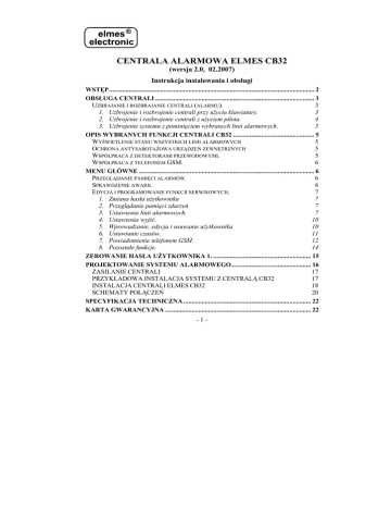 CENTRALA ALARMOWA ELMES CB32 (wersja 2.0, 02.2007) Instrukcja instalowania i obsługi WSTĘP............................................................................................................................ 2 OBSŁUGA CENTRALI ................................................................................................ 3 UZBRAJANIE I ROZBRAJANIE CENTRALI (ALARMU). 3 1. Uzbrojenie i rozbrojenie centrali przy użyciu klawiatury. 3 2. Uzbrojenie i rozbrojenie centrali z użyciem pilota. 4 3. Uzbrojenie systemu z pominięciem wybranych linii alarmowych. 5 OPIS WYBRANYCH FUNKCJI CENTRALI CB32 ................................................. 5 WYŚWIETLENIE STANU WSZYSTKICH LINII ALARMOWYCH 5 OCHRONA ANTYSABOTAŻOWA URZĄDZEŃ ZEWNĘTRZNYCH 5 WSPÓŁPRACA Z DETEKTORAMI PRZEWODOWYMI. 5 WSPÓŁPRACA Z TELEFONEM GSM. 6 MENU GŁÓWNE .......................................................................................................... 6 PRZEGLĄDANIE PAMIĘCI ALARMÓW. 6 SPRAWDZENIE AWARII. 6 EDYCJA I PROGRAMOWANIE FUNKCJI SERWISOWYCH. 7 1. Zmiana hasła użytkownika 7 2. Przeglądanie pamięci zdarzeń 7 3. Ustawienia linii alarmowych. 7 4. Ustawienia wyjść. 10 5. Wprowadzanie, edycja i usuwanie użytkownika 10 6. Ustawianie czasów. 11 7. Powiadomienie telefonem GSM. 12 8. Pozostałe funkcje. 14 ZEROWANIE HASŁA UŻYTKOWNIKA 1. ........................................................... 15 PROJEKTOWANIE SYSTEMU ALARMOWEGO................................................ 16 ZASILANIE CENTRALI 17 PRZYKŁADOWA INSTALACJA SYSTEMU Z CENTRALĄ CB32 17 INSTALACJA CENTRALI ELMES CB32 18 SCHEMATY POŁĄCZEŃ 20 SPECYFIKACJA TECHNICZNA ............................................................................. 22 KARTA GWARANCYJNA ........................................................................................ 22 -1- WSTĘP Centrala alarmowa Elmes CB32 przeznaczona jest do stosowania w instalacjach systemów alarmowych sygnalizacji włamania, napadu i kontroli dostępu w domach jednorodzinnych, mieszkaniach, sklepach, biurach i innych obiektach. Współpracuje z bezprzewodowymi detektorami i pilotami produkcji Elmes Elektronik. Posiada również dwa wejścia parametryczne do podłączenia dowolnych detektorów przewodowych. Jest urządzeniem w pełni programowalnym i posiada trzy wyjścia alarmowania o obciążalności prądowej do 1A przeznaczone do łączenia zewnętrznych sygnalizatorów, dialera telefonicznego, itp. Centrala posiada także dedykowane wyjście dla powiadomienia telefonem GSM. Podświetlany panel LCD oraz klawiatura numeryczna pozwalają na wygodną obsługę i programowanie centrali. Zegar czasu rzeczywistego umożliwia precyzyjne określenie czasu wystąpienia 256 ostatnio zarejestrowanych zdarzeń. Specjalne procedury minimalizacji zużycia energii pozwalają na 72 godzinną pracę centrali w trybie zasilania awaryjnego, z akumulatorami o pojemności 1800mAh. Centrala obsługuje do 16 użytkowników systemu i monitoring do 32 detektorów identyfikowanych jako niezależne linie alarmowe. Każdy użytkownik oraz każda linia mogą mieć dowolnie definiowaną nazwę o długości do 16 znaków. Możliwe jest zastosowanie centrali CB32 jako podsystemu w alarmach przewodowych. Centrala może być zasilana z linii zasilającej systemu przewodowego, a jej wyjścia alarmowe mogą być łączone do centrali przewodowej. Cechy charakterystyczne i użytkowe centrali Elmes CB32: - obsługa 32 bezprzewodowych detektorów - linii alarmowych o dowolnych nazwach, - dwa wejścia parametryczne dla detektorów przewodowych, - identyfikacja 16 użytkowników z definiowaniem ich nazw, w tym 4 administratorów, - podświetlana klawiatura i wyświetlacz alfanumeryczny, diody sygnalizacyjne LED, - uzbrajanie i rozbrajanie centrali hasłem z klawiatury lub zdalnie z użyciem pilota, - szeroki wybór typów linii alarmowych, - funkcjonalne tryby częściowego uzbrojenia centrali (dzienny, nocny), - alarm napadowy (wezwanie o pomoc) aktywowany pilotem - funkcja panic, - współpraca z telefonem GSM do powiadamiania o alarmie i monitoringu, - pamięć 256 ostatnich zdarzeń obejmująca rodzaj zdarzenia oraz czas jego wystąpienia, - sygnalizacja akustyczna naruszenia wejścia w linii typu „gong”, - zwłoka na wejście aktywowana pilotem lub przez naruszenie linii opóźnionej, - programowany czas zwłoki na „wejście” i „wyjście” w zakresie od 0 do 99 sekund, - monitoring obecności detektorów (linii) przez centralę, - trzy wyjścia tranzystorowe z zabezpieczeniem do 1A o definiowanym przeznaczeniu (alarmowe, sygnalizacji braku zasilania lub uzbrojenia systemu), - programowany czas na wyjściach alarmowania (0-999s), - antysabotażowe zabezpieczenie wyjścia OUT1 dla sygnalizatora zewnętrznego, - antysabotażowe zabezpieczenie przed zakłócaniem pasma radiowego w linii 30, - parametryczne (1 kOhm) wejście antysabotażowe ochrony urządzeń zewnętrznych, -2- - wskaźnik poziomu sygnału radiowego w formie linijki znakowej na panelu LCD, - wbudowany pod klawiaturą centrali wewnętrzny sygnalizator akustyczny 92dB, - zasilanie centrali napięciem niestabilizowanym 12VDC (9..15 VDC), pobór prądu: od 150mA przy zasilaniu tylko centrali, do 300mA przy zasilaniu centrali i tel. GSM, - zasilanie awaryjne centrali dwoma akumulatorami NiMH typu AA (na wyposażeniu) o pojemności od 1800 do 2500mAh zapewniające ponad 72 godziny pracy centrali po zaniku zasilania sieciowego. OBSŁUGA CENTRALI Codzienna obsługa systemu alarmowego z centralą CB32 polega na uzbrajaniu i rozbrajaniu systemu oraz kontroli sygnalizowanych stanów awaryjnych. Wykonuje się ją używając przycisków klawiatury, których znaczenie objaśniono poniżej: 1,3,5,7,8,9,0 - przyciski numeryczne, 2▲,◄4, 6►, 8▼ - przyciski numeryczne i kursorów menu programowania, C - przycisk kasowania wyboru (cancel) i wyjścia z menu programowania, OK - przycisk zatwierdzenia wyboru. Aktualny stan systemu 