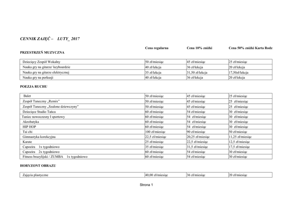 CENNIK ZAJĘĆ – LUTY_ 2017