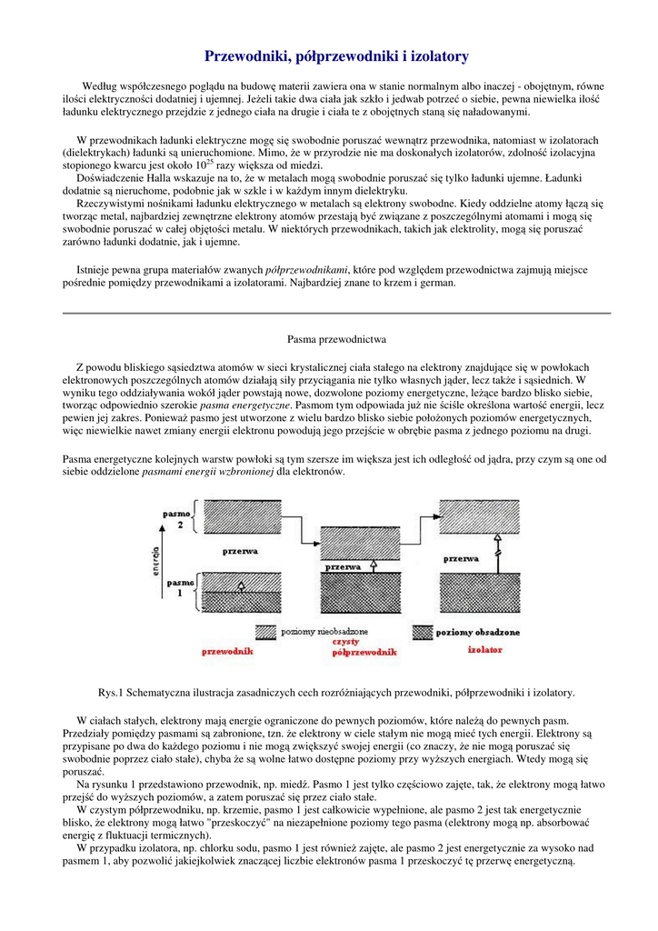 Przewodniki, półprzewodniki i izolatory Według współczesnego poglądu na budowę materii zawiera ona w stanie normalnym albo inaczej - obojętnym, równe ilości elektryczności dodatniej i ujemnej. JeŜeli takie dwa ciała jak szkło i jedwab potrzeć o siebie, pewna niewielka ilość ładunku elektrycznego przejdzie z jednego ciała na drugie i ciała te z obojętnych staną się naładowanymi. W przewodnikach ładunki elektryczne mogę się swobodnie poruszać wewnątrz przewodnika, natomiast w izolatorach (dielektrykach) ładunki są unieruchomione. Mimo, Ŝe w przyrodzie nie ma doskonałych izolatorów, zdolność izolacyjna stopionego kwarcu jest około 1025 razy większa od miedzi. Doświadczenie Halla wskazuje na to, Ŝe w metalach mogą swobodnie poruszać się tylko ładunki ujemne. Ładunki dodatnie są nieruchome, podobnie jak w szkle i w kaŜdym innym dielektryku. Rzeczywistymi nośnikami ładunku elektrycznego w metalach są elektrony swobodne. Kiedy oddzielne atomy łączą się tworząc metal, najbardziej zewnętrzne elektrony atomów przestają być związane z poszczególnymi atomami i mogą się swobodnie poruszać w całej objętości metalu. W niektórych przewodnikach, takich jak elektrolity, mogą się poruszać zarówno ładunki dodatnie, jak i ujemne. Istnieje pewna grupa materiałów zwanych półprzewodnikami, które pod względem przewodnictwa zajmują miejsce pośrednie pomiędzy przewodnikami a izolatorami. Najbardziej znane to krzem i german. Pasma przewodnictwa Z powodu bliskiego sąsiedztwa atomów w sieci krystalicznej ciała stałego na elektrony znajdujące się w powłokach elektronowych poszczególnych atomów działają siły przyciągania nie tylko własnych jąder, lecz takŜe i sąsiednich. W wyniku tego oddziaływania wokół jąder powstają nowe, dozwolone poziomy energetyczne, leŜące bardzo blisko siebie, tworząc odpowiednio szerokie pasma energetyczne. Pasmom tym odpowiada juŜ nie ściśle określona wartość energii, lecz pewien jej zakres. PoniewaŜ pasmo jest utworzone z wielu bardzo blisko siebie połoŜonych poziomów energetycznych, więc niewielkie nawet zmiany energii elektronu powodują jego przejście w obrębie pasma z jednego poziomu na drugi. Pasma energetyczne kolejnych warstw powłoki są tym szersze im większa jest ich odległość od jądra, przy czym są one od siebie oddzielone pasmami energii wzbronionej dla elektronów. Rys.1 Schematyczna ilustracja zasadniczych cech rozróŜniających przewodniki, półprzewodniki i izolatory. W ciałach stałych, elektrony mają energie ograniczone do pewnych poziomów, które naleŜą do pewnych pasm. Przedziały pomiędzy pasmami są zabronione, tzn. Ŝe elektrony w ciele stałym nie mogą mieć tych energii. Elektrony są przypisane po dwa do kaŜdego poziomu i nie mogą zwiększyć swojej energii (co znaczy, Ŝe nie mogą poruszać się swobodnie poprzez ciało stałe), chyba Ŝe są wolne łatwo dostępne poziomy przy wyŜszych energiach. Wtedy mogą się poruszać. Na rysunku 1 przedstawiono przewodnik, np. miedź. Pasmo 1 jest tylko częściowo zajęte, tak, Ŝe elektrony mogą łatwo przejść do wyŜszych poziomów, a zatem poruszać się przez ciało stałe. W czystym półprzewodniku, np. krzemie, pasmo 1 jest całkowicie wypełnione, ale pasmo 2 jest tak energetycznie blisko, Ŝe elektrony mogą łatwo "przeskoczyć" na niezapełnione poziomy tego pasma (elektrony mogą np. absorbować energię z fluktuacji termicznych). W przypadku izolatora, np. chlorku sodu, pasmo 1 jest równieŜ zajęte, ale pasmo 2 jest energetycznie za wysoko nad pasmem 1, aby pozwolić jakiejkolwiek znaczącej liczbie elektronów pasma 1 przeskoczyć tę przerwę energetyczną. Metale  W sieci krystalicznej metali w szerokim pasmie zewnętrznym, tzw. pasmie przewodnictwa znajdują się wspólne dla wszystkich atomów elektrony swobodne, natomiast wymiana elektronów w wewnętrznym pasmie jest utrudniona. Atomy metali o dobrym przewodnictwie elektrycznym np.: miedzi i srebra mają w zewnętrznej, częściowo zapełnionej warstwie powłoki tylko po jednym elektronie. Elektrony te, tworzące tzw. gaz elektronowy, poruszają się swobodnie w utworzonym w sieci krystalicznej metalu pasmie przewodnictwa. Inne pierwiastki metaliczne np.: Ŝelazo, nikiel, których zewnętrzne warstwy powłok są całkowicie wypełnione elektronami, nie powinny wykazywać przewodnictwa elektrycznego. Okazało się jednak, Ŝe w powłoce elektronowej tych pierwiastków są jeszcze wolne miejsca w warstwach bliŜszych jądra, przy czym w czasie łączenia się ich atomów w ciało stałe poziomy energetyczne warstwy niezapełnionej zbliŜają się wskutek oddziaływania sąsiednich jąder, do poziomów warstwy całkowicie zapełnionej tworząc poszerzone, wspólne pasmo przewodnictwa. Elektrony znajdujące się w tym pasmie mogą się swobodnie poruszać, stając się nośnikami prądu. Okazało się, Ŝe liczba elektronów swobodnych jest równa liczbie atomów w metalu i nie zaleŜy od jego wartościowości, czyli od liczby elektronów w zewnętrznej warstwie powłoki elektronowej. Izolatory Ciała stałe, w których mimo wzajemnego oddziaływania atomów warstwy zewnętrzne ich powłok elektronowych są całkowicie wypełnione elektronami, a przedziały energii wzbronionej są tak duŜe, Ŝe energia cieplna elektronu nie wystarcza do jego przejścia w pasmo przewodnictwa - nie wykazują przewodnictwa elektrycznego, czyli są izolatorami. Półprzewodniki Wzajemne oddziaływnie atomów w sieci krystalicznej półprzewodnika wytwarza taki układ zewnętrznych warstw elektronowych, Ŝe pasmo przewodnictwa jest niezbyt odległe od pasma podstawowego, zaś siły które wiąŜą znajdujące się w nich elektrony z jądrami, mają stosunkowo niewielką wartość. Wskutek tego energia cieplna elektronu, zwiększona np. przez zderzenie z sąsiednim atomem, staje się wystarczająca do przerzucenia go do niecałkowicie ob
