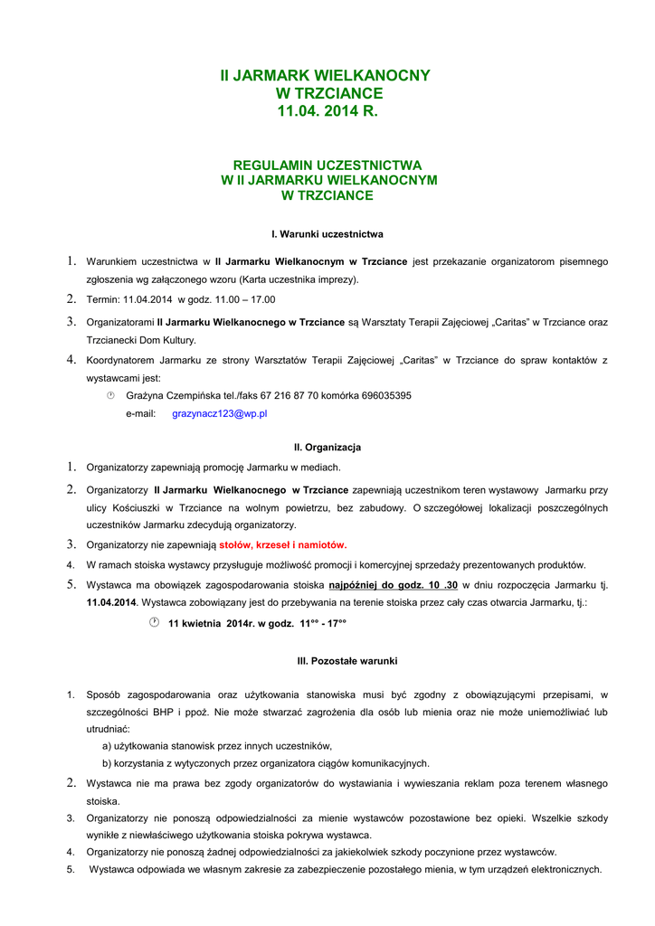II JARMARK WIELKANOCNY W TRZCIANCE 11.04. 2014 R. REGULAMIN UCZESTNICTWA W II JARMARKU WIELKANOCNYM W TRZCIANCE I. Warunki uczestnictwa 1. Warunkiem uczestnictwa w II Jarmarku Wielkanocnym w Trzciance jest przekazanie organizatorom pisemnego zgłoszenia wg załączonego wzoru (Karta uczestnika imprezy). 2. Termin: 11.04.2014 w godz. 11.00 – 17.00 3. Organizatorami II Jarmarku Wielkanocnego w Trzciance są Warsztaty Terapii Zajęciowej „Caritas” w Trzciance oraz Trzcianecki Dom Kultury. 4. Koordynatorem Jarmarku ze strony Warsztatów Terapii Zajęciowej „Caritas” w Trzciance do spraw kontaktów z wystawcami jest: Grażyna Czempińska tel./faks 67 216 87 70 komórka 696035395 e-mail: [email protected] II. Organizacja 1. Organizatorzy zapewniają promocję Jarmarku w mediach. 2. Organizatorzy II Jarmarku Wielkanocnego w Trzciance zapewniają uczestnikom teren wystawowy Jarmarku przy ulicy Kościuszki w Trzciance na wolnym powietrzu, bez zabudowy. O szczegółowej lokalizacji poszczególnych uczestników Jarmarku zdecydują organizatorzy. 3. Organizatorzy nie zapewniają stołów, krzeseł i namiotów. 4. W ramach stoiska wystawcy przysługuje możliwość promocji i komercyjnej sprzedaży prezentowanych produktów. 5. Wystawca ma obowiązek zagospodarowania stoiska najpóźniej do godz. 10 .30 w dniu rozpoczęcia Jarmarku tj. 11.04.2014. Wystawca zobowiązany jest do przebywania na terenie stoiska przez cały czas otwarcia Jarmarku, tj.: 11 kwietnia 2014r. w godz. 11°° - 17°° III. Pozostałe warunki 1. Sposób zagospodarowania oraz użytkowania stanowiska musi być zgodny z obowiązującymi przepisami, w szczególności BHP i ppoż. Nie może stwarzać zagrożenia dla osób lub mienia oraz nie może uniemożliwiać lub utrudniać: a) użytkowania stanowisk przez innych uczestników, b) korzystania z wytyczonych przez organizatora ciągów komunikacyjnych. 2. Wystawca nie ma prawa bez zgody organizatorów do wystawiania i wywieszania reklam poza terenem własnego stoiska. 3. Organizatorzy nie ponoszą odpowiedzialności za mienie wystawców pozostawione bez opieki. Wszelkie szkody wynikłe z niewłaściwego użytkowania stoiska pokrywa wystawca. 4. Organizatorzy nie ponoszą żadnej odpowiedzialności za jakiekolwiek szkody poczynione przez wystawców. 5. Wystawca odpowiada we własnym zakresie za zabezpieczenie pozostałego mienia, w tym urządzeń elektronicznych.
