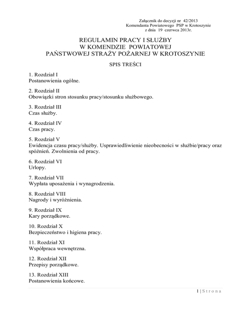 Załącznik do decyzji nr 42/2013 Komendanta Powiatowego PSP w Krotoszynie z dnia 19 czerwca 2013r. REGULAMIN PRACY I SŁUŻBY W KOMENDZIE POWIATOWEJ PAŃSTWOWEJ STRAŻY POŻARNEJ W KROTOSZYNIE SPIS TREŚCI 1. Rozdział I Postanowienia ogólne. 2. Rozdział II Obowiązki stron stosunku pracy/stosunku służbowego. 3. Rozdział III Czas służby. 4. Rozdział IV Czas pracy. 5. Rozdział V Ewidencja czasu pracy/służby. Usprawiedliwienie nieobecności w służbie/pracy oraz spóźnień. Zwolnienia od pracy. 6. Rozdział VI Urlopy. 7. Rozdział VII Wypłata uposażenia i wynagrodzenia. 8. Rozdział VIII Nagrody i wyróżnienia. 9. Rozdział IX Kary porządkowe. 10. Rozdział X Bezpieczeństwo i higiena pracy. 11. Rozdział XI Współpraca wewnętrzna. 12. Rozdział XII Przepisy porządkowe. 13. Rozdział XIII Postanowienia końcowe. 1|Strona Rozdział I Postanowienia ogólne §1.1. Regulamin określa organizację i porządek pracy/służby oraz prawa i obowiązki stron stosunku pracy/służby w Komendzie Powiatowej Państwowej Straży Pożarnej w Krotoszynie . 2. Użyte w regulaminie wyrażenia oznaczają: 1) PSP – Państwową Straż Pożarną, 2) Komendant – Komendanta Powiatowego PSP w Krotoszynie ; pracodawcę w rozumieniu kodeksu pracy; uprawnionego do mianowania (powołania) w rozumieniu ustawy z dnia 24 sierpnia 1991r. o PSP, 3) Komenda – Komendę Powiatową PSP w Krotoszynie; zakład pracy w rozumieniu kodeksu pracy; miejsce pracy/służby, 4) strażak – funkcjonariusza pożarnictwa, 5) pracownik - pracownika cywilnego Komendy, 6) przełożony - osobę kierującą pracą innych pracowników/strażaków; kierującego komórką organizacyjną Komendy, w której pracownik/strażak pełni pracę/służbę, a w przypadku kierujących komórkami – nadzorującego te komórki, 7) droga służbowa – tryb załatwiania spraw osobistych i służbowych lub przekazywania informacji przez pracowników/strażaków, polegający na ustnym lub pisemnym przekazywaniu poleceń i informacji od wyższych przełożonych przez bezpośredniego przełożonego do podwładnego oraz przyjmowaniu meldunków, raportów służbowych i informacji od podwładnego – przez kolejnych przełożonych aż do tego, który sprawę rozstrzyga lub jest odbiorcą informacji, 8) pora nocna – czas pracy/służby w godz. od 22.00 do 6.00. 3. Droga służbowa jest w Komendzie przyjętym sposobem rozpowszechniania informacji dot. pracy/służby wśród pracowników/strażaków. Rozdział II Obowiązki stron stosunku pracy/stosunku służbowego § 2. Komendant jest obowiązany w szczególności: 1) przedstawić na piśmie pracownikowi/strażakowi podejmującemu pracę/służbę jego zakres czynności, zaznajamiać ze sposobem wykonywania służby lub pracy na wyznaczonych stanowiskach oraz jego podstawowymi uprawnieniami, 2) udzielać pracownikowi/strażakowi niezbędnych informacji na piśmie nie później niż w ciągu 7 dni od dnia podjęcia przez niego pracy/służby o obowiązującej dobowej i tygodniowej normie czasu pracy/służby, częstotliwości, terminie i czasie wypłaty wynagrodzenia/uposażenia, urlopie wypoczynkowym, dodatkowym, przyjętym sposobie potwierdzania przybycia 2|Strona i obecności w miejscu pełnienia pracy/służby oraz usprawiedliwiania nieobecności, 3) organizować pracę/służbę w sposób zapewniający pełne wykorzystanie czasu pracy/służby, jak również osiąganie przez pracowników/strażaków, przy wykorzystaniu ich uzdolnień i kwalifikacji, wysokiej wydajności i należytej jakości wykonywanych zadań, 4) zapewnić odpowiednie miejsce oraz środki techniczne niezbędne do wykonywania zadań na zajmowanym stanowisku służbowym zgodnie z obowiązującymi przepisami bhp, 5) wydać strażakowi w naturze należne mu przedmioty umundurowania, odzieży specjalnej, środki ochrony indywidualnej i ekwipunku osobistego, dystynkcje i znaki identyfikacyjne zgodnie z tabelami należności, 6) dokonywać przydziału zadań zgodnie z zakresem obowiązków wynikających z zajmowanego stanowiska służbowego albo zgodnie z treścią umowy o pracę/aktu mianowania (powołania), 7) zapewnić pracownikom/strażakom bezpieczne i higieniczne warunki pracy/służby oraz prowadzić systematyczne szkolenia w tym zakresie, 8) terminowo i prawidłowo wypłacać wynagrodzenie/uposażenie, 9) umożliwić pracownikom/strażakom podnoszenie wykształcenia ogólnego i kwalifikacji zawodowych oraz sprawności fizycznej – wg potrzeb organizacyjnych, 10) realizować i zaspokajać uprawnienia socjalne pracowników/strażaków określone w odrębnych przepisach, 11) stosować obiektywne i sprawiedliwe kryteria oceny realizacji zadań przez pracowników/strażaków, 12) prowadzić dokumentację w sprawach związanych ze stosunkiem pracy/służby zgodnie z obowiązującymi przepisami w tym zakresie oraz akta osobowe pracowników i strażaków, 13) przeciwdziałać mobbingowi, 14) przeciwdziałać dyskryminacji w toku pracy/służby, w szczególności ze względu na płeć, wiek, rasę, przekonania polityczne, przynależność związkową, pochodzenie etniczne, wyznanie, orientację seksualną, 15) zapobiegać występowaniu protekcji i korupcji, 16) zapewnić przestrzeganie przepisów ustawy o ochronie danych osobowych oraz o ochronie informacji niejawnych, 17) kierować pracownika/strażaka na okresowe profilaktyczne badania lekarskie oraz badania lekarskie wynikające z rozwiązania stosunku pracy/stosunku służbowego, 18) wpływać na kształtowanie w zakładzie pracy zasad współżycia społecznego. § 3. Komendant lub zastępca Komendanta przyjmuje pracowników/strażaków w sprawach skarg, wniosków, zażaleń i odwołań raz w tygodniu w terminie określonym w Biuletynie Informacji Publicznej oraz na tablicy informacyjnej w budynku Komendy. 3|Strona § 4.1. Przełożony po przydzieleniu pracownika/strażaka niezwłocznie przedkłada Komendantowi projekt zakresu czynności, o którym jest mowa w § 2 p