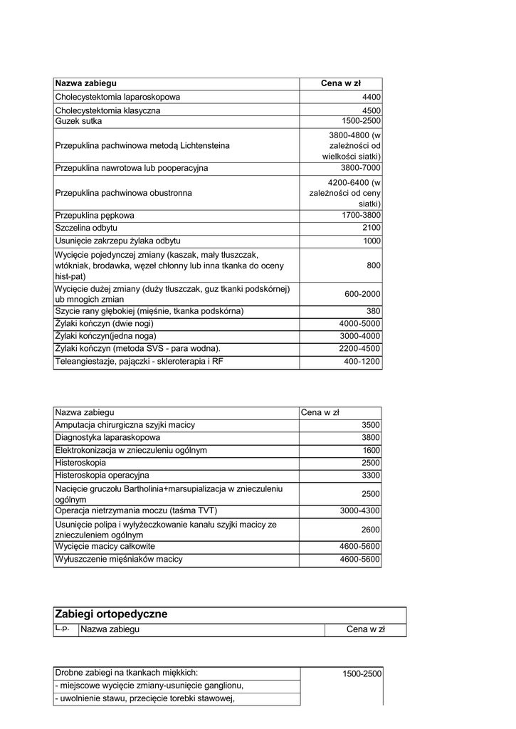 Nazwa zabiegu Cena w zł Cholecystektomia laparoskopowa 4400 Cholecystektomia klasyczna Guzek sutka Przepuklina pachwinowa metodą Lichtensteina Przepuklina nawrotowa lub pooperacyjna Przepuklina pachwinowa obustronna Przepuklina pępkowa Szczelina odbytu 4500 1500-2500 3800-4800 (w zależności od wielkości siatki) 3800-7000 4200-6400 (w zależności od ceny siatki) 1700-3800 2100 Usunięcie zakrzepu żylaka odbytu Wycięcie pojedynczej zmiany (kaszak, mały tłuszczak, wtókniak, brodawka, węzeł chłonny lub inna tkanka do oceny hist-pat) Wycięcie dużej zmiany (duży tłuszczak, guz tkanki podskórnej) ub mnogich zmian Szycie rany głębokiej (mięśnie, tkanka podskórna) Żylaki kończyn (dwie nogi) Żylaki kończyn(jedna noga) Żylaki kończyn (metoda SVS - para wodna). Teleangiestazje, pajączki - skleroterapia i RF Nazwa zabiegu Amputacja chirurgiczna szyjki macicy Diagnostyka laparaskopowa Elektrokonizacja w znieczuleniu ogólnym Histeroskopia Histeroskopia operacyjna Nacięcie gruczołu Bartholinia+marsupializacja w znieczuleniu ogólnym Operacja nietrzymania moczu (taśma TVT) Usunięcie polipa i wyłyżeczkowanie kanału szyjki macicy ze znieczuleniem ogólnym Wycięcie macicy całkowite Wyłuszczenie mięśniaków macicy 1000 800 600-2000 380 4000-5000 3000-4000 2200-4500 400-1200 Cena w zł 3500 3800 1600 2500 3300 2500 3000-4300 2600 4600-5600 4600-5600 Zabiegi ortopedyczne L.p. Nazwa zabiegu Drobne zabiegi na tkankach miękkich: - miejscowe wycięcie zmiany-usunięcie ganglionu, - uwolnienie stawu, przecięcie torebki stawowej, Cena w zł 1500-2500 - drobne tenotomie- uwolnienie ścięgien, usunięcie przerośniętych kaletek, itp. Artroskopia lecznicza np. usunięcie uszkodzonej łąkotki, więzadła, chrząstki czy ciała wolnego ze stawu Operacja wymagająca artrotomii: - synowektomia-usunięcie przerośniętej błony maziowej, - uwolnienia stawu, usuniecie zrostów, przykurczów pourazowych 3500-4500 Artroskopowa rekonstrukcja więzadeł stawu kolanowego (cena uzależniona od rodzaju implantu) 8500-1100 Artroskopowa operacja naprawcza w obrębie stawu barkowego, operacja nawykowego zwichnięcia stawu ramiennego, obrąbek stawowy, uszkodzenie ścięgien, bez ceny implantu 4500-6000 Operacje korekcyjne paluchów koślawych oraz pozostałych. Zróżnicowanie cenowe, w zależności od zakresu operacji i rodzaju wykorzystanego implantu. Operacje na stopie płasko-koślawej statycznej: -osteotomie kości piętowej, -szycie czy plastyka ścięgna mięśnia piszczelowego tylnego, 4000-11000 -operacje w obrębie przodostopia -osteotomie. Operacje korekcyjne kości piętowej- osteotomie klinowe, w przypadkach przerostów guzów piętowych. Operacje naprawcze - rekonstrukcje więzadłowe, przy niestabilnościach stawu skokowego oraz innych stawów w obrębie stopy. Zespoły uciskowe nerwów obwodowych, zespół kanału nadgarstka. Operacje naprawcze ścięgien prostowników ręki i stopy. Operacje naprawcze ścięgien zginaczy ręki. Operacja przykurczów w obrębie ręki. Przykurcz Dupuytreni. 2800 2400 2500-3500 Operacje łokcia tenisisty. Usunięcie materiału zespalającego( w zależności od miejsca) 4000 1800-4500 Zamknięte nastawienie złamań przedramienia, stawu skokowego , złamań w obrębie ręki i stopy, repozycja zwichnięć stawów, w krótkotrwałym znieczuleniu ogólnym Otwarte nastawienie złamania ze stabilizacja wewnętrzną: - przedramienia. - nasady dalszej goleni, - kości w obrębie ręki i stopy, - obojczyka, - więzozrostu obojczykowe - barkowego (bez ceny implantu). Szew pierwotny lub operacja rekonstrukcyjna ścięgna Achillesa. Operacje naprawcze po zastarzałych urazach, czy w zmianach zwyrodnieniowych, osteotomie korekcyjne, operacje na tkankach miękkich. Usztywnienie stawu skokowego górnego 4500 3800-7500 2500 1000-3500 3500-4500 3500-4800 4500- 8000 Operacyjne leczenie stawów rzekomych (w zależności od metodyki). Endoprotezoplastyka pierwotna całkowita cementowa stawu biodrowego Endoprotezoplastyka pierwotna całkowita kolana,bezcementowa biodra Endoprotezoplastyka pierwotna całkowita biodra lub kolana rekonstrukcja kostną endoprotezo plastyka ST.biod.z zastosowaniem trzpienia przynasadowego,kapoplastyka ST.b Zabiegi rekonstrukcyjne deformacji kostno-stawowej u dzieci 3500-8800 10.000(w zależności od endoprotezy) 12.000(w zależności od endoprotezy) 20.000(w zależności od endoprotezy) Indywidualnie Zabiegi szczękowo-twarzowe Nazwa zabiegu Cena w zł Traumatologia Repozycja i unieruchomienie złamań wyrostka zębodołowego szczęki/żuchwy Zamknięte nastawienie złamania szczęki/żuchwy (repozycja, unieruchomienie) Otwarte nastawienie złamania oczodołu/kości jarzmowej/żuchwy Otwarte nastawienie złamania szczęki 2000 3200-5000 4300-7300 4300-9000 Plastyka wad ortognatycznych Otwarta plastyka gałęzi żuchwy (BSSO) (progenia, laterogenia itd.) Operacja dwuszczękowa (BSSO, LeFortl) Torbiele zębopochodne (żuchwa/szczęka) Nowotwory łagodne tkanek miękkich Nowotwory łagodne kości Zęby zatrzymane Zabiegi na zatokach szczękowych(dostęp Caldwell-Luca)torbiele, ciała obce itd Zamknięcie połączenia ustno-zatokowego Sanacja jamy ustnej 7800-12000 10000-14000 2000-3400 1800-4500 2600-5500 2000-3200 2300-3400 2000 1500-2600