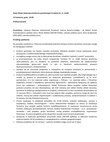 Sesja Skype dotycząca konkursu grantowego Fundacji im. A. Lindh 19 kwietnia, godz. 15:00 Podsumowanie Uczestnicy: Johanna Peterson (Sekretariat Fundacji), Joanna Sanetra-Szeliga i dr Robert Kusek (koordynatorzy polskiej sieci), Wiola Małota (SIETAR Polska, członek polskiej sieci), Anna Grabowska (PRO MED, członek polskiej sieci). Przebieg spotkania: Na początku spotkania p. Peterson przedstawiła pokrótce bieżący konkurs grantowy zwracając uwagę na następujące kwestie: • • • • • • • • konkurs grantowy ma bardzo szerokie priorytety, składane projekty muszą wykazywać jasne powiązanie z problematyką dialogu międzykulturowego; szczególną uwagę zwraca się na dwie grupy docelowe: młodzież i kobiety („motor” przemian); w przeciwieństwie do wielu innych programów Fundacji im. A. Lindh konkurs grantowy ukierunkowany jest na działania na poziomie lokalnym, skierowane do społeczeństwa obywatelskiego (grass-root level), w tym w lokalnych społecznościach, grupach dyskryminowanych, mniejszościach; zachęca się do tworzenia projektów w nawiązaniu do inicjatyw lokalnych, w partnerstwie z przedsięwzięciami lokalnymi, które dotycząc dialogu międzykulturowego; kryteria kwalifkowalności projektu (tj. jakie warunki musi spełniać projekt, aby mógł ubiegać się o środki) są spisane w przewodniku po konkursie grantowym („Guidelines”); są to m.in. partnerstwo 1+1 (co najmniej jedna organizacja z Północy i co najmniej jedna z Południa), podpisana umowa o współpracy (partnership agreement) – dokumenty dołączony do aplikacji (musi być podpisany i zeskanowany!), wkład finansowy lidera projektu (wkład finansowy partnera projektu nie jest obowiązkowy, ale mile widziany jest wkład choćby wkład rzeczowy, ponieważ to pokazuje zaangażowanie w projekt), członkostwo w sieci narodowej wcześniejsze niż 15 stycznia 2013 r. (członkiem sieci musi być jedynie lider projektu, partnerzy mogą do sieci nie należeć, muszą być jednak organizacjami z osobowością prawną, zarejestrowanymi w jednym z 42 państw Unii dla Śródziemnomorza); Proces ewaluacji: 1) składanie wniosków do 15.04 (online, wniosek aplikacyjny, umowa o współpracy, budżet, harmonogram – wzory dokumentów dostępne na www), 2) ewaluacja formalna (czy projekt spełnia kryteria kwalifikowalności), 3) ewaluacja merytoryczna przez komitet selekcyjny (przedstawiciele różnych działów Sekretariatu Fundacji) – m.in. sprawdzane: tematyka i cele projektu, grupy docelowe, zasięg projektu (multiplikatorzy), racjonalność finansowa, 4) ocena projektów przez ekspertów zewnętrznych (trzech ekspertów). Zazwyczaj w konkursie grantowym przychodzi około 200-300 aplikacji, w obecnym konkursie wybrane będzie 30-35 projektów (z uwzględnieniem rozkładu geograficznego); Selekcja projektów do 15 czerwca – wybrane projekty mogą ruszać od 15 lipca. Pytania • • • • • • • Jak powinna wyglądać umowa o współpracy (partnership agreement)? Wzór znajduje się na stronach www. Ważne: należy go podpisać, zeskanować i wysłać wraz z wnioskiem aplikacyjnym! Co może być wkładem rzeczowym? Jakie przykładowe usługi/dobra mogą być wkładem rzeczowym w przypadku partnera projektu z Tunezji? Przestrzeń (tj. np. sale), sprzęt. Wielkość wykładu rzeczowego nie może przekroczyć 5% budżetu. We wniosku aplikacyjnym podajemy szacowaną wartość wkładu rzeczowego (osobna rubryka na końcu budżetu). Co to jest „contingency reserve” (rezerwa „wszelki wypadek”)? To założone dodatkowe środki na nieprzewidziane wydatki. Czy koszty administracyjne mogą być wkładem własnym? Tak. Pod warunkiem, że osoby nie działają na zasadzie wolontariatu. Czy są wytyczne co do tego, w jakim języku mają być sporządzane dokumenty w czasie projektu, np. raporty (lider projektu jest z Polski, a partner z Tunezji); na jaki język mają być one tłumaczone na potrzeby sprawozdawcze? Na potrzeby sprawozdawcze wszystkie składane dokumenty muszą być w języku francuskim albo angielskim. Czy można uzyskać informacje na temat tego, jakie projekty zostały wcześniej zorganizowane z grantów ALF? Krótkie informacje dostępne są na stronie Fundacji. Podczas Forum w Marsylii będzie dostępna prezentacja online projektów. Ta sama organizacja składa dwa różne wnioski. Czy we wnioskach może być uwzględniona współpraca z taka sama organizacja z kraju aplikującego? Tak. Jedna organizacja może składać kilka wniosków, we współpracy z tymi samymi partnerami (z tego samego bądź innego kraju). Ważne: dofinansowanie otrzyma tylko jeden z projektów złożonych przez tą samą organizację. Można za to być partnerem w wielu projektach. Na koniec spotkania p. Peterson obiecała sprawdzić i udostępnić opisy nagrodzonych projektów oraz uszczegółowić kwestie związane z audytem (tj. czy może być 2 audytorów, 1 w kraju Północy, 1 w kraju Południa). Sporządziła: Joanna Sanetra-Szeliga Kraków, 22.04.2013