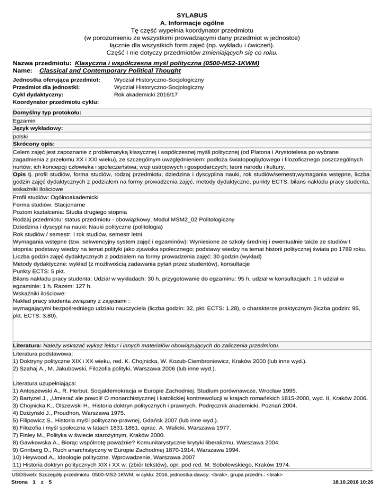 SYLABUS A. Informacje ogólne Tę część wypełnia koordynator przedmiotu (w porozumieniu ze wszystkimi prowadzącymi dany przedmiot w jednostce) łącznie dla wszystkich form zajeć (np. wykładu i ćwiczeń). Część I nie dotyczy przedmiotów zmieniających się co roku. Nazwa przedmiotu: Klasyczna i współczesna myśl polityczna (0500-MS2-1KWM) Name: Classical and Contemporary Political Thought Jednostka oferująca przedmiot: Przedmiot dla jednostki: Cykl dydaktyczny: Koordynator przedmiotu cyklu: Wydział Historyczno-Socjologiczny Wydział Historyczno-Socjologiczny Rok akademicki 2016/17 Domyślny typ protokołu: Egzamin Język wykładowy: polski Skrócony opis: Celem zajęć jest zapoznanie z problematyką klasycznej i współczesnej myśli politycznej (od Platona i Arystotelesa po wybrane zagadnienia z przełomu XX i XXI wieku), ze szczególnym uwzględnieniem: podłoża światopoglądowego i filozoficznego poszczególnych nurtów; ich koncepcji człowieka i społeczeństwa; wizji ustrojowych i gospodarczych; teorii narodu i kultury. Opis tj. profil studiów, forma studiów, rodzaj przedmiotu, dziedzina i dyscyplina nauki, rok studiów/semestr,wymagania wstępne, liczba godzin zajęć dydaktycznych z podziałem na formy prowadzenia zajęć, metody dydaktyczne, punkty ECTS, bilans nakładu pracy studenta, wskaźniki ilościowe Profil studiów: Ogólnoakademicki Forma studiów: Stacjonarne Poziom kształcenia: Studia drugiego stopnia Rodzaj przedmiotu: status przedmiotu - obowiązkowy, Moduł MSM2_02 Politologiczny Dziedzina i dyscyplina nauki: Nauki polityczne (politologia) Rok studiów / semestr: I rok studiów, semestr letni Wymagania wstępne (tzw. sekwencyjny system zajęć i egzaminów): Wyniesione ze szkoły średniej i ewentualnie także ze studiów I stopnia: podstawy wiedzy na temat polityki jako zjawiska społecznego; podstawy wiedzy na temat historii politycznej świata po 1789 roku. Liczba godzin zajęć dydaktycznych z podziałem na formy prowadzenia zajęć: 30 godzin (wykład) Metody dydaktyczne: wykład (z możliwością zadawania pytań przez studentów), konsultacje Punkty ECTS: 5 pkt. Bilans nakładu pracy studenta: Udział w wykładach: 30 h, przygotowanie do egzaminu: 95 h, udział w konsultacjach: 1 h udział w egzaminie: 1 h. Razem: 127 h. Wskaźniki ilościowe: Nakład pracy studenta związany z zajęciami : wymagającymi bezpośredniego udziału nauczyciela (liczba godzin: 32, pkt. ECTS: 1.28), o charakterze praktycznym (liczba godzin: 95, pkt. ECTS: 3.80). Literatura: Należy wskazać wykaz lektur i innych materiałów obowiązujących do zaliczenia przedmiotu. Literatura podstawowa: 1) Doktryny polityczne XIX i XX wieku, red. K. Chojnicka, W. Kozub-Ciembroniewicz, Kraków 2000 (lub inne wyd.). 2) Szahaj A., M. Jakubowski, Filozofia polityki, Warszawa 2006 (lub inne wyd.). Literatura uzupełniająca: 1) Antoszewski A., R. Herbut, Socjaldemokracja w Europie Zachodniej. Studium porównawcze, Wrocław 1995. 2) Bartyzel J., „Umierać ale powoli! O monarchistycznej i katolickiej kontrrewolucji w krajach romańskich 1815-2000, wyd. II, Kraków 2006. 3) Chojnicka K., Olszewski H., Historia doktryn politycznych i prawnych. Podręcznik akademicki, Poznań 2004. 4) Dziżyński J., Proudhon, Warszawa 1975. 5) Filipowicz S., Historia myśli polityczno-prawnej, Gdańsk 2007 (lub inne wyd.). 6) Filozofia i myśl społeczna w latach 1831-1861, oprac. A. Walicki, Warszawa 1977. 7) Finley M., Polityka w świecie starożytnym, Kraków 2000. 8) Gawkowska A., Biorąc wspólnotę poważnie? Komunitarystyczne krytyki liberalizmu, Warszawa 2004. 9) Grinberg D., Ruch anarchistyczny w Europie Zachodniej 1870-1914, Warszawa 1994. 10) Heywood A., Ideologie polityczne. Wprowadzenie, Warszawa 2007 11) Historia doktryn politycznych XIX i XX w. (zbiór tekstów), opr. pod red. M. Sobolewskiego, Kraków 1974. USOSweb: Szczegóły przedmiotu: 0500-MS2-1KWM, w cyklu: 2016, jednostka dawcy: <brak>, grupa przedm.: <brak> Strona 1 z 5 18.10.2016 10:26 12) Historia idei politycznych. Wybór tekstów, t. II, oprac. S. Filipowicz et al. (kilka wydań). 13) Idee i ideologie we współczesnym świecie. Wielkie tematy, red. K. Dziubka et al., Warszawa 2008. 14) Kołakowski L., Główne nurty marksizmu. Powstanie-rozwój-rozkład (różne wydania). 14) Kornatowski W., Zarys dziejów myśli politycznej starożytności, Warszawa 1968. 15) Król M., Filozofia polityczna, Kraków 2008. 16) Król M., Historia myśli politycznej: od Machiavellego po czasy współczesne, Gdańsk 2001. 17) Kulesza W. T., Ideologie naszych czasów (kilka wydań). 18) Kymlicka W., Współczesna filozofia polityczna, Kraków-Warszawa 1998. 19) Laquer W., Faszyzm. Wczoraj, dziś, jutro, Warszawa 1998. 20) Laskowski P., Szkice z dziejów anarchizmu, Warszawa 2006. 21) Michalak B. Czy grozi nam depolityzacja polityki? Przyczynek do rozważań na temat wizji postpolitycznej, [w:] Studia nad przywództwem politycznym. Ustalenia metodologiczne i praktyka, red. A. Kasińska-Metryka, Toruń 2011. 22) Olszewski H., Słownik twórców idei, Poznań 2001. 23) Paxton R., Anatomia faszyzmu, Poznań 2005. 24) Pipes R., Komunizm, Warszawa 2008. 25) Rau Z., Liberalizm. Zarys myśli politycznej XIX i XX wieku, Warszawa 2000. 26) Scruton R., Co znaczy konserwatyzm, 2002. 27) Sikora A., Od Heraklita do Husserla, Warszawa 2005 (lub inne wyd.). 28) Skarzyński R., Konserwatyzm. Zarys dziejów filozofii politycznej, Warszawa 1998. 29) Słownik społeczny, pod red. B. Szlachty, Kraków 2004. 30) Spory wokół Nowej Trzeciej Drogi, wybór i opr. T. Kowalik, Warszawa 2001. 31) Sylwestrzak A., Historia doktryn politycznych i prawnych (wiele wydań). 32) Szacki J., Historia myśli socjologicznej. Wydanie nowe, Warszawa 2003. 33) Szacki J., Liberalizm po komunizmie, Kraków 1994. 34) Szlachta B., Konserwatyzm. Z dziejów tradycji myślenia o polityce, Kraków-Warszawa 1998. 35) Waldenberg, Prekursorzy Nowej Lewicy. Studia z myśli społecznej XIX i