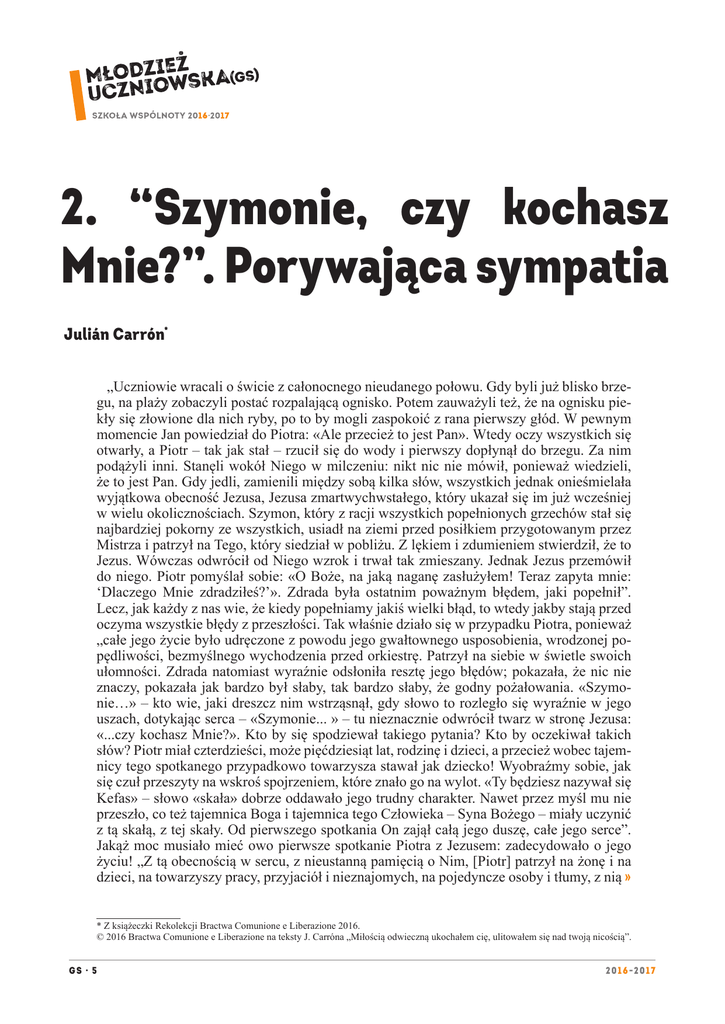 2. “Szymonie, czy kochasz Mnie?”. Porywająca sympatia Julián Carrón* „Uczniowie wracali o świcie z całonocnego nieudanego połowu. Gdy byli już blisko brzegu, na plaży zobaczyli postać rozpalającą ognisko. Potem zauważyli też, że na ognisku piekły się złowione dla nich ryby, po to by mogli zaspokoić z rana pierwszy głód. W pewnym momencie Jan powiedział do Piotra: «Ale przecież to jest Pan». Wtedy oczy wszystkich się otwarły, a Piotr – tak jak stał – rzucił się do wody i pierwszy dopłynął do brzegu. Za nim podążyli inni. Stanęli wokół Niego w milczeniu: nikt nic nie mówił, ponieważ wiedzieli, że to jest Pan. Gdy jedli, zamienili między sobą kilka słów, wszystkich jednak onieśmielała wyjątkowa obecność Jezusa, Jezusa zmartwychwstałego, który ukazał się im już wcześniej w wielu okolicznościach. Szymon, który z racji wszystkich popełnionych grzechów stał się najbardziej pokorny ze wszystkich, usiadł na ziemi przed posiłkiem przygotowanym przez Mistrza i patrzył na Tego, który siedział w pobliżu. Z lękiem i zdumieniem stwierdził, że to Jezus. Wówczas odwrócił od Niego wzrok i trwał tak zmieszany. Jednak Jezus przemówił do niego. Piotr pomyślał sobie: «O Boże, na jaką naganę zasłużyłem! Teraz zapyta mnie: ‘Dlaczego Mnie zdradziłeś?’». Zdrada była ostatnim poważnym błędem, jaki popełnił”. Lecz, jak każdy z nas wie, że kiedy popełniamy jakiś wielki błąd, to wtedy jakby stają przed oczyma wszystkie błędy z przeszłości. Tak właśnie działo się w przypadku Piotra, ponieważ „całe jego życie było udręczone z powodu jego gwałtownego usposobienia, wrodzonej popędliwości, bezmyślnego wychodzenia przed orkiestrę. Patrzył na siebie w świetle swoich ułomności. Zdrada natomiast wyraźnie odsłoniła resztę jego błędów; pokazała, że nic nie znaczy, pokazała jak bardzo był słaby, tak bardzo słaby, że godny pożałowania. «Szymonie…» – kto wie, jaki dreszcz nim wstrząsnął, gdy słowo to rozległo się wyraźnie w jego uszach, dotykając serca – «Szymonie... » – tu nieznacznie odwrócił twarz w stronę Jezusa: «...czy kochasz Mnie?». Kto by się spodziewał takiego pytania? Kto by oczekiwał takich słów? Piotr miał czterdzieści, może pięćdziesiąt lat, rodzinę i dzieci, a przecież wobec tajemnicy tego spotkanego przypadkowo towarzysza stawał jak dziecko! Wyobraźmy sobie, jak się czuł przeszyty na wskroś spojrzeniem, które znało go na wylot. «Ty będziesz nazywał się Kefas» – słowo «skała» dobrze oddawało jego trudny charakter. Nawet przez myśl mu nie przeszło, co też tajemnica Boga i tajemnica tego Człowieka – Syna Bożego – miały uczynić z tą skałą, z tej skały. Od pierwszego spotkania On zajął całą jego duszę, całe jego serce”. Jakąż moc musiało mieć owo pierwsze spotkanie Piotra z Jezusem: zadecydowało o jego życiu! „Z tą obecnością w sercu, z nieustanną pamięcią o Nim, [Piotr] patrzył na żonę i na dzieci, na towarzyszy pracy, przyjaciół i nieznajomych, na pojedyncze osoby i tłumy, z nią * Z książeczki Rekolekcji Bractwa Comunione e Liberazione 2016. © 2016 Bractwa Comunione e Liberazione na teksty J. Carróna „Miłością odwieczną ukochałem cię, ulitowałem się nad twoją nicością”. GS · 5 2 0 1 6 -2 0 1 7 2. “Szymonie, czy kochasz Mnie?”. Porywająca sympatia myślał i zasypiał. Ten Człowiek stał się dla niego jak wielkie, ogromne, niejasne jeszcze objawienie”1. Ksiądz Giussani kontynuuje przeżywanie tamtej sceny: „«Szymonie, czy kochasz Mnie?». «Tak Panie, ja Ciebie kocham»”. Lecz jak to jest możliwe, „jak mógł powiedzieć coś takiego po tym wszystkim, co zrobił?”, po tych wszystkich błędach, które przychodziły mu na myśl. „To «tak» było potwierdzeniem uznania największej wyjątkowości, wyjątkowości niekwestionowanej; sympatii, która wchłaniała wszystkie inne. Wszystko pozostawało wpisane w to ich spojrzenie, jak gdyby spójność i jej brak zeszły wreszcie na drugi plan, schowały się za wiernością, która czuła ciało ze swojego ciała; za kształtem życia, który nadało to spotkanie”2. „Sympatia” nie jest tym słowem, które spodziewalibyśmy się usłyszeć, kiedy mówi się o moralności, do tego stopnia, że spycha na drugi plan problem spójności albo niespójności, który tak nam doskwiera. Lecz kto tego doświadczył, może to zrozumieć: obecność taka jak obecność Jezusa, sympatia taka, jak ta wzbudzona przez Jezusa, przeważa nad wszystkimi błędami, które ktoś mógł popełnić. L. Giussani – S. Alberto – J. Prades, Zostawić ślady w historii świata. Nowe ślady chrześcijańskiego doświadczenia, Wydawnictwo Św. Krzyża, Opole 2011, s. 83-84. 2 Tamże, s. 84. 1 GS · 6 2 0 1 6 -2 0 1 7