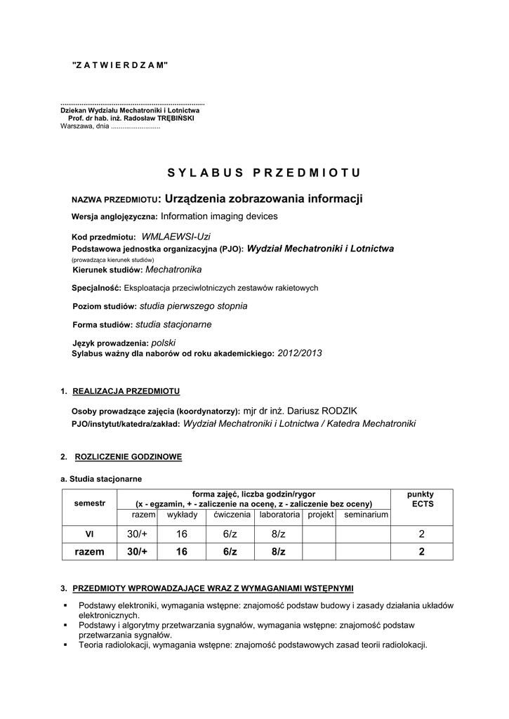 "Z A T W I E R D Z A M" ............................................................................ Dziekan Wydziału Mechatroniki i Lotnictwa Prof. dr hab. inż. Radosław TRĘBIŃSKI Warszawa, dnia .......................... SYLABUS PRZEDMIOTU NAZWA PRZEDMIOTU: Urządzenia zobrazowania informacji Wersja anglojęzyczna: Information imaging devices Kod przedmiotu: WMLAEWSI-Uzi Podstawowa jednostka organizacyjna (PJO): Wydział Mechatroniki i Lotnictwa (prowadząca kierunek studiów) Kierunek studiów: Mechatronika Specjalność: Eksploatacja przeciwlotniczych zestawów rakietowych Poziom studiów: studia pierwszego stopnia Forma studiów: studia stacjonarne Język prowadzenia: polski Sylabus ważny dla naborów od roku akademickiego: 2012/2013 1. REALIZACJA PRZEDMIOTU Osoby prowadzące zajęcia (koordynatorzy): mjr dr inż. Dariusz RODZIK PJO/instytut/katedra/zakład: Wydział Mechatroniki i Lotnictwa / Katedra Mechatroniki 2. ROZLICZENIE GODZINOWE a. Studia stacjonarne semestr forma zajęć, liczba godzin/rygor (x - egzamin, + - zaliczenie na ocenę, z - zaliczenie bez oceny) razem wykłady ćwiczenia laboratoria projekt punkty ECTS seminarium VI 30/+ 16 6/z 8/z 2 razem 30/+ 16 6/z 8/z 2 3. PRZEDMIOTY WPROWADZAJĄCE WRAZ Z WYMAGANIAMI WSTĘPNYMI Podstawy elektroniki, wymagania wstępne: znajomość podstaw budowy i zasady działania układów elektronicznych. Podstawy i algorytmy przetwarzania sygnałów, wymagania wstępne: znajomość podstaw przetwarzania sygnałów. Teoria radiolokacji, wymagania wstępne: znajomość podstawowych zasad teorii radiolokacji. 4. ZAKŁADANE EFEKTY KSZTAŁCENIA odniesienie do efektów kształcenia dla kierunku Symbol Efekty kształcenia Student, który zaliczył przedmiot, W1 Posiada wiedzę z zakresu możliwości taktyczno-technicznych sprzętu bojowego będącego na wyposażeniu pododdziału przeciwlotniczego; Posiada wiedzę z zakresu czynności obsługowych uzbrojenia i sprzętu bojowego; Potrafi przygotować uzbrojenie i sprzęt bojowy do prowadzenia działań bojowych; Potrafi wyjaśnić zasady funkcjonowania sprzętu i uzbrojenia bojowego; W2 U1 U2 K_W02; W_32B_2 K_W04; W_32B_8 K_U01; U_32B_1 K_U11; U_32B_6 5. METODY DYDAKTYCZNE Wykłady ilustrowane prezentacjami komputerowymi Power Point w celu dostarczenia wiedzy określonej efektami W1, W2 Ćwiczenia audytoryjne polegające na indywidulanej pracy na schematach funkcjonalnych i ideowych układów zobrazowania informacji radiolokacyjnej, w celu usystematyzowania wiedzy określonej efektami W1, W2 i U1 Laboratoria polegające na wykonywaniu przez grupę studentów badań parametrów zobrazowania informacji radiolokacyjnej i sygnału telewizyjnego w celu opanowania umiejętności U1 i U11. 6. TREŚCI PROGRAMOWE liczba godzin Lp. temat/tematyka zajęć wykł. 1. Podstawowe pojęcia fotometryczne. Wybrane zagadnienia z fizjologii widzenia człowieka oraz optyki elektronowej. 2. Konstrukcja i parametry lamp wskaźnikowych. Budowa i działanie lampy wskaźnikowej. Zjawiska fizyczne związane z zapisem i odczytem informacji z lamp pamięciowych. 3. Rodzaje zobrazowań radiolokacyjnych. Wskaźniki radiolokacyjne jedno i dwuwspółrzędne typu A, B, M, P. Wskaźniki trójwspółrzędne. Analogowe metody generacji podstaw czasu odległości i kąta. 4. Projektory obrazu i wyświetlacze ciekłokrystaliczne. Pasywne i aktywne ekrany do zobrazowania informacji. Obrazy trójwymiarowe. 5. Zobrazowania syntetyczne. Ogólne zasady współpracy wskaźnika z komputerem i stacją radiolokacyjną. Sposoby generacji znaków alfanumerycznych oraz zobrazowania sytuacji powietrznej. 6. Zobrazowania TV. Podstawowe pojęcia i ogólne zasady telewizji. Pasmo częstotliwości sygnału wizyjnego. Synchronizacja i synteza obrazu. Sposoby generacji zobrazowania barwnego. Urządzenia telewizji przemysłowej. 7. Metody rejestracji obrazów. Budowa i zasada działania kamery. Komputerowe systemy projekcji informacji. Razem Lp. temat/tematyka zajęć ćwicz. lab. 4 4 2 2 4 2 2 2 2 2 2 2 16 6 8 liczba godzin proj. semin. wykł. ćwicz. lab. proj. semin. ..... ..... ...... ..... ..... TEMATY ĆWICZEŃ RACHUNKOWYCH 1. 2. 3. Analiza działania układów wskaźnika radiolokacyjnego na podstawie schematu funkcjonalnego. Analiza pracy wybranych układów wskaźnika radiolokacyjnego na podstawie schematów ideowych. Analiza działania układów odbiornika TV na podstawie schematów funkcjonalnego i ideowego. Razem 2 2 2 ..... 6 TEMATY ĆWICZEŃ LABORATORYJNYCH 1. 2. 3. Badanie wskaźników Samobieżnej Stacji Wykrywania i Naprowadzania. Badanie zobrazowania syntetycznego na wskaźniku oficera naprowadzania PZR. 4 2 Badanie zespolonego sygnału telewizyjnego. Razem 2 ..... ..... 8 7. LITERATURA podstawowa: Makiewicz W.: Urządzenia zobrazowania informacji, WAT 1989. PRWB 9A33BM2 Opis techniczny cz.II i III. PRWB 9A33BM2 Album schematów cz.II i III. uzupełniająca: Sadowski J. i inni: Przeciwlotniczy zestaw rakietowy OSA-AK, WAT 2000. Urbański B.: Odbiorniki telewizyjne, WKŁ 1998. 8. SPOSOBY WERYFIKACJI ZAKŁADANYCH EFEKTÓW KSZTAŁCENIA Przedmiot jest zaliczany na ocenę. Zaliczenie przedmiotu odbywa się na podstawie pozytywnych wyników kolokwium końcowego oraz zaliczeń z ćwiczeń audytoryjnych i laboratorium. Zaliczenie ćwiczeń audytoryjnych odbywa się na podstawie ocen bieżących z zadań indywidualnych. Zaliczenie laboratorium odbywa się na podstawie spełnienia efektu U1 i U2. Efekt W1 sprawdzany jest podczas ćwiczeń audytoryjnych oraz na kolokwium końcowym. Efekt W2 sprawdzany jest podczas zadań indywidualnych na ćwiczeniach audytoryjnych i na kolokwium oraz podczas sprawdzania wiedzy teoretycznej przed ćwiczenia laboratoryjnymi. Ocena 5,0 (bdb) 4,0 (db) 3,0 (dst) Opis wiedzy Bezbłędnie zna budowę, zasadę działania i samodzielnie rozumie sens fizyczny stosowania rozszerzonego zakresu czynności obsługowych uzbrojenia i sprzętu bojowego; Właściwie zna budowę, zasadę działania i rozumie rozszerzony zakre