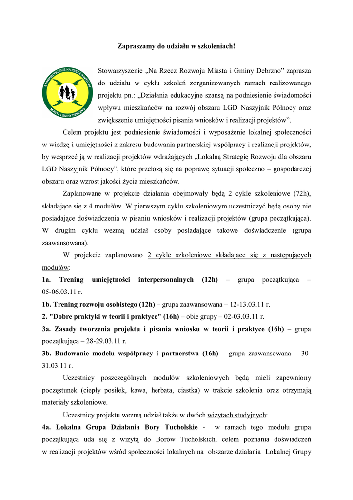 Zapraszamy do udziału w szkoleniach! Stowarzyszenie „Na Rzecz Rozwoju Miasta i Gminy Debrzno” zaprasza do udziału w cyklu szkoleń zorganizowanych ramach realizowanego projektu pn.: „Działania edukacyjne szansą na podniesienie świadomości wpływu mieszkańców na rozwój obszaru LGD Naszyjnik Północy oraz zwiększenie umiejętności pisania wniosków i realizacji projektów”. Celem projektu jest podniesienie świadomości i wyposażenie lokalnej społeczności w wiedzę i umiejętności z zakresu budowania partnerskiej współpracy i realizacji projektów, by wesprzeć ją w realizacji projektów wdrażających „Lokalną Strategię Rozwoju dla obszaru LGD Naszyjnik Północy”, które przełożą się na poprawę sytuacji społeczno – gospodarczej obszaru oraz wzrost jakości życia mieszkańców. Zaplanowane w projekcie działania obejmowały będą 2 cykle szkoleniowe (72h), składające się z 4 modułów. W pierwszym cyklu szkoleniowym uczestniczyć będą osoby nie posiadające doświadczenia w pisaniu wniosków i realizacji projektów (grupa początkująca). W drugim cyklu wezmą udział osoby posiadające takowe doświadczenie (grupa zaawansowana). W projekcie zaplanowano 2 cykle szkoleniowe składające się z następujących modułów: 1a. Trening umiejętności interpersonalnych (12h) – grupa początkująca – 05-06.03.11 r. 1b. Trening rozwoju osobistego (12h) – grupa zaawansowana – 12-13.03.11 r. 2. "Dobre praktyki w teorii i praktyce" (16h) – obie grupy – 02-03.03.11 r. 3a. Zasady tworzenia projektu i pisania wniosku w teorii i praktyce (16h) – grupa początkująca – 28-29.03.11 r. 3b. Budowanie modelu współpracy i partnerstwa (16h) – grupa zaawansowana – 3031.03.11 r. Uczestnicy poszczególnych modułów szkoleniowych będą mieli zapewniony poczęstunek (ciepły posiłek, kawa, herbata, ciastka) w trakcie szkolenia oraz otrzymają materiały szkoleniowe. Uczestnicy projektu wezmą udział także w dwóch wizytach studyjnych: 4a. Lokalna Grupa Działania Bory Tucholskie - w ramach tego modułu grupa początkująca uda się z wizytą do Borów Tucholskich, celem poznania doświadczeń w realizacji projektów wśród społeczności lokalnych na obszarze działania Lokalnej Grupy Działania Bory Tucholskie z zakresu dziedzictwa kulturowo - przyrodniczego. Odwiedzą Krzywogoniec - wioskę grzybową oraz galerie produktów lokalnych w Gostycynie, Cekcynie, Osiu i Tucholi. 4b. Lokalna Grupa Działania Sandry Brdy - grupa zaawansowana natomiast odwiedzi LGD Sandry Brdy, która zapozna uczestników ze swoimi doświadczeniami z realizacji projektów partnerskich w zakresie kultury ludowej, dziedzictwa kulturowego Kaszub oraz dziedzictwa przyrodniczego na bazie rzeki Brdy. Dodatkową atrakcją będzie możliwość poznania tajników wypieku chleba w Widnie oraz wizyta w kaszubskiej chacie w Swornychgaciach. Zgłoszenia można składać osobiście w siedzibie Stowarzyszenia lub mailowo: Stowarzyszenie „Na Rzecz Rozwoju Miasta i Gminy Debrzno” ul. Ogrodowa 26, 77-310 Debrzno; tel. (59) 83 35 750, 502 043 654; mail: [email protected] Projekt współfinansowany ze środków Unii Europejskiej w ramach Osi 4 – Leader Programu Rozwoju Obszarów Wiejskich na lata 2007-2013