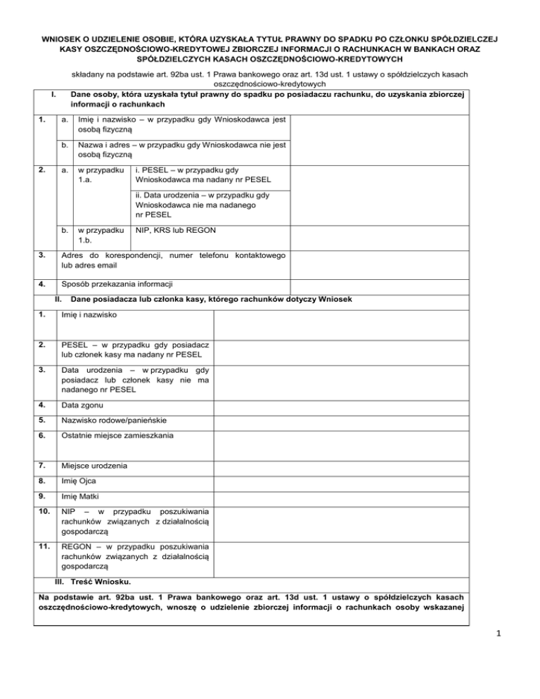 WNIOSEK O UDZIELENIE OSOBIE, KTÓRA UZYSKAŁA TYTUŁ PRAWNY DO SPADKU PO CZŁONKU SPÓŁDZIELCZEJ KASY OSZCZĘDNOŚCIOWO-KREDYTOWEJ ZBIORCZEJ INFORMACJI O RACHUNKACH W BANKACH ORAZ SPÓŁDZIELCZYCH KASACH OSZCZĘDNOŚCIOWO-KREDYTOWYCH składany na podstawie art. 92ba ust. 1 Prawa bankowego oraz art. 13d ust. 1 ustawy o spółdzielczych kasach oszczędnościowo-kredytowych Dane osoby, która uzyskała tytuł prawny do spadku po posiadaczu rachunku, do uzyskania zbiorczej informacji o rachunkach I. 1. 2. a. Imię i nazwisko – w przypadku gdy Wnioskodawca jest osobą fizyczną b. Nazwa i adres – w przypadku gdy Wnioskodawca nie jest osobą fizyczną a. w przypadku 1.a. i. PESEL – w przypadku gdy Wnioskodawca ma nadany nr PESEL ii. Data urodzenia – w przypadku gdy Wnioskodawca nie ma nadanego nr PESEL b. w przypadku 1.b. NIP, KRS lub REGON 3. Adres do korespondencji, numer telefonu kontaktowego lub adres email 4. Sposób przekazania informacji II. Dane posiadacza lub członka kasy, którego rachunków dotyczy Wniosek 1. Imię i nazwisko 2. PESEL – w przypadku gdy posiadacz lub członek kasy ma nadany nr PESEL 3. Data urodzenia – w przypadku gdy posiadacz lub członek kasy nie ma nadanego nr PESEL 4. Data zgonu 5. Nazwisko rodowe/panieńskie 6. Ostatnie miejsce zamieszkania 7. Miejsce urodzenia 8. Imię Ojca 9. Imię Matki 10. NIP – w przypadku poszukiwania rachunków związanych z działalnością gospodarczą 11. REGON – w przypadku poszukiwania rachunków związanych z działalnością gospodarczą III. Treść Wniosku. Na podstawie art. 92ba ust. 1 Prawa bankowego oraz art. 13d ust. 1 ustawy o spółdzielczych kasach oszczędnościowo-kredytowych, wnoszę o udzielenie zbiorczej informacji o rachunkach osoby wskazanej 1 w pkt II. Wniosku: 1. prowadzonych oraz 2. w odniesieniu do których, umowy rachunku uległy rozwiązaniu lub wygasły z przyczyn, o których mowa w art. 59a ust. 1-3 Prawa bankowego oraz w art. 13a ust. 1-3 ustawy o spółdzielczych kasach oszczędnościowo-kredytowych, w bankach oraz spółkdzielczych kasach oszczędnościowo-kredytowtch. Zbiorcza informacja nie obejmuje książeczek mieszkaniowych z prawem do premii gwarancyjnej, produktów kredytowych, w tym kart kredytowych, oraz rachunków technicznych służących do obsługi tych produktów. IV. Oświadczenia Oświadczam, że składając Wniosek zapoznałem(-am) się z zasadami świadczenia usługi poszukiwań rachunków świadczonej poprzez Centralną informację. Oświadczam, że przyjmuję do wiadomości, że zbiorcza informacja o rachunkach osoby wskazanej w pkt II. Wniosku, która zostanie mi przekazana przez Zachodniopomorską SKOK dotyczyć będzie banków i spółdzielczych kas oszczędnościowo-kredytowych, wedle wykazu dostępnego poprzez link zamieszczony na stronie internetowej www.centralnainformacja.pl oraz poprzez link zamieszczony na stronach internetowych banków i spółdzielczych kas oszczędnościowo-kredytowych objętych wykazem. Oświadczam, że zostałem(-am) poinformowany(-na) o opłacie w wysokości 30,00 zł zgodnie z Tabela Opłat i Prowizji, którą zobowiązuję się ponieść w zamian za udzielenie zbiorczej informacji. Oświadczam, że zostałem(-am) poinformowany(-na), że: 1) Zachodniopomorska SKOK jest administratorem danych w rozumieniu ustawy z dnia 29 sierpnia 1997 r. o ochronie danych osobowych (tekst jedn. Dz.U. z 2015 r., poz. 2135, ze zm.) – w odniesieniu do moich danych osobowych umieszczonych we Wniosku. 2) Siedziba Zachodniopomorskiej SKOK znajduje się w Szczecinie, pod adresem: ul. Czorsztyńska 17, 71-201 Szczecin. 3) Celem zbierania danych podanych przeze mnie we Wniosku jest udzielenie mi zbiorczej informacji o rachunkach osoby wskazanej w pkt II. Wniosku. Dane te zostaną przekazane przez Zachodniopomorską SKOK bankom i spółdzielczym kasom oszczędnościowo-kredytowym, wedle wykazu dostępnego poprzez link zamieszczony na stronie internetowej www.centralnainformacja.pl oraz poprzez link zamieszczony na stronach internetowych banków i spółdzielczych kas oszczędnościowo-kredytowych objętych wykazem, za pośrednictwem Centralnej informacji prowadzonej przez Krajową Izbę Rozliczeniową S.A., której siedziba znajduje się w Warszawie, pod adresem: ul. rtm. W. Pileckiego 65, 02-781 Warszawa. 4) Przysługuje mi prawo dostępu do treści moich danych oraz ich poprawiania, a podanie tych danych jest dobrowolne, lecz konieczne do uzyskania zbiorczej informacji o rachunkach osoby wskazanej w pkt II. Wniosku. 1 V. Załączniki 1) 2) 3) 4) 5) 6) Oryginał/poświadczoną przez notariusza kopię odpisu prawomocnego postanowienia o stwierdzeniu nabycia spadku Oryginał/poświadczoną przez notariusza kopię odpisu zarejestrowanego aktu poświadczenia dziedziczenia Inny dokument potwierdzający tytuł prawny do spadku Akt zgonu – w przypadku gdy na podstawie innych dokumentów weryfikacja danych zmarłego nie jest możliwa Dokument uprawniajacy do reprezentacji Wnioskodawcy – w przypadku gdy Wnioskodawca nie jest osobą fizyczną albo jest reprezentowany np. przez przedstawiciela ustawowego Dokument pełnomocnictwa rodzajowego do uzyskania w imieniu Wnioskodawcy zbiorczej informacji z Centralnej informacji – w przypadku gdy Wnioskodawca działa przez pełnomocnika Data i czytelny podpis Wnioskodawcy 1 2 2 Do każdego Wniosku należy załączyć dokument wymieniony w punkcie 1, 2 lub 3. Dokument wymieniony w punkcie 4, 5 i 6 należy załączyć, jeżeli zachodzi przypadek wskazany w odpowiednim punkcie. Albo osoby uprawnionej do reprezentacji Wnioskodawcy/ Pełnomocnika Wnioskodawcy 2 Wypełnia Zachodniopomorska SKOK przyjmująca Wniosek Tożsamość Wnioskodawcy została sprawdzona przy składaniu Wniosku na podstawie …………… Tożsamość i umocowanie do działania w imieniu Wnioskodawcy osoby reprezentującej Wnioskodawcę została sprawdzona przy składaniu Wniosku na podstawie ………………. Tożsamość i umocowanie do działania w