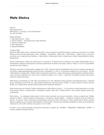 Gmina Subkowy Mała Słońca SOŁTYS Edyta Janoszczyk Mała Słońca, ul. Długa 13, 83-120 Subkowy Tel. 607-322-095 RADA SOŁECKA 1. Edyta Janoszczyk - sołtys 2. Aneta Templer - Przewodnicząca Rady Sołeckiej 3. Szymon Chroboczek 4. Alina Obremska 5. Bogumił Malewski O SOŁECTWIE Sołectwo Mała Słońca leży w Dolinie Dolnej Wisły. Lewy brzeg jest wschodnią granicą sołectwa na odcinku 4 km. Małą Słońcę przecina droga powiatowa Tczew – Bałdowo – Gorzędziej – Mały Garc – Walichnowy – Pelplin, która w centrum wsi łączy się z drogą gminną Subkowy – Mała Słońca. Miejscowość leży na Rowerowym Szlaku Nadwiślańskim Doliny Dolnej Wisły. Nazwa miejscowości należy do najstarszych na Pomorzu. W dokumentach wydanych za czasów Świętopełka oraz w przywilejach nadanych klasztorowi cystersów pelplińskich wymienia się nazwy: Słanca i Slance. Z nich to wykształciła się obecna nazwa Słońca. Pierwsze wzmianki o miejscowości sięgają roku 1245 i dotyczą zamku Świętopełka, który stał na wzgórzu panującym nad Wisłą, najprawdopodobniej blisko karczmy w Rybakach ( w XIV w. ta warownia książęca już nie istniała). W roku 1280 Mestwin nadaje Małą i Wielką Słońcę biskupowi płockiemu. Data pierwszego wydzierżawienia Wielkiej Słońcy przez Konwent pelpliński nie jest znana. Wiadomo jednak, że w 1414 r. opat Piotr Honigfeld zmienia pierwotnie ustalone zasady dzierżawy. Małą Słońcę zamieszkuje ok. 280 osób, stanowiących ok. 6% całkowitej liczby populacji mieszkańców gminy. Z pośród grupy wiekowej od 18 do 65 lat, zdecydowaną większość stanowią ludzie młodzi i w wieku średnim. Można również dodać, że w Małej Słońcy działa bardzo prężnie Koło Gospodyń Wiejskich. Bazę edukacyjną wsi stanowi Szkoła Podstawowa w Małej Słońcy (klasy 1 – 6), do której uczęszczają oprócz uczniów miejscowych dzieci z miejscowości: Gorzędziej, Rybaki, Mały Garc i Wielka Słońca. Przy szkole zostało utworzone przedszkole. Mała Słońca – to następna miejscowość, która może pochwalić się nowym boiskiem z trawy syntetycznej. Obiekt powstał w 2009 r. dzięki środkom pochodzącym z programu „Blisko Boisko” - wspólnej inicjatywy PZU oraz Ministra Sportu i Turystyki. Celem akcji było wybudowanie na terenie Polski 150 boisk z trawy syntetycznej. Nowo otwarte boisko znajduję się przy Szkole Podstawowej w Małej Słońcy. Murawa jest dostępna bezpłatnie, także poza godzinami szkolnymi i w dni wolne. Boisko ma wymiary: 34 m x 64m. W 2010 r. przy szkole powstało miasteczko rowerowe z projektu pt. „ROWER – TRANSPORT, REKREACJA I SPORT” w ramach działania Działaj Lokalnie. 1