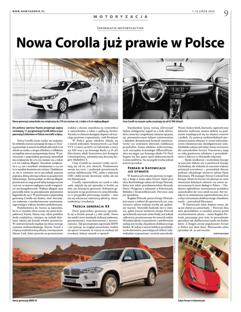 w w w.now ygornik.pl 1–15 L i p c a 2 013 m o t o r y z a c j a 9 Informacje motoryzacyjne materiały prasowe materiały prasowe Nowa Corolla już prawie w Polsce Nowa generacja samochodu ma zwiększony do 270 cm rozstaw osi, a także o 8 cm większą długość Ceny Corolli na naszym rynku zaczynają się od 62 900 złotych Do połowy czerwca Toyota przyjmuje zapisy na kolejną, 11. już generację Corolli, która w ręce pierwszych klientów w Polsce ma trafić w lipcu. Standardem (poza wersją sDrive25d) będzie inteligentny napęd na 4 koła xDrive, który może być uzupełniany różnymi opcjami, np. pneumatycznym tylnym zawieszeniem i układem dynamicznej kontroli amortyzatorów czy systemem aktywnej stabilizacji przechyłów. Gama silników wykorzystujących oszczędne technologie EfficientDynamics ma sięgać 450-konnego silnika V8. Dość bogata ma być gama opcji elektronicznych ConnectedDrive. Na szczegóły trzeba jednak jeszcze poczekać. Dwie poprzednie generacje sprzedały się w liczbie ponad 1,3 mln sztuk. Nowa ma ustalić nowe standardy stylizacji nadwozia, przestronności, wszechstronności i innowacyjności. Tak przynajmniej zapowiada BMW i już patrząc na wygląd samochodu, trudno się oprzeć wrażeniu, że więcej tu ewolucji niż rewolucji. Jedyny ratunek w opcjach. F errari w K atowicach już otwarte W Katowicach otwarto pierwszy w regionie, a drugi w kraju salon Ferrari. Salon przy ulicy Bocheńskiego należy do Grupy Pietrzak, która jest także przedstawicielem Renault, Dacii i Peugeota z salonami w Katowicach, Rybniku i Świętochłowicach. Pierwsze auta już sprzedano. Bogdan Pietrzak, prezes Grupy Pietrzak, jest znany z miłości do sportowych aut, więc otwarcie salonu traktuje trochę jak spełnienie marzeń. Niewielki budynek stoi w miejscu, gdzie jeszcze niedawno Grupa Pietrzak sprzedawała używane samochody, jest jednak całkowicie przystosowany do nowych zadań. Wysokiej jakości wyposażenie i umeblowanie nadają mu trochę charakteru ekskluzywnego butiku. W jednej z sal jest kolekcja przykładowych elementów, pozwalających dobrać indywidualnie wyposażenie i wystrój samochodu. piotr Myszor Nowa generacja BMW X5 materiały prasowe T rzecia generacja X5 Wzory i kolory foteli, kierownic, tapicerek oraz lakierów nadwozia można dobrać na podstawie znajdujących się na miejscu wzorów i próbek. Za pomocą multimedialnych prezentacji można obejrzeć w wersji trójwymiarowej własnoręcznie skonfigurowane auto. Niedaleko salonu jest także stacja serwisowa dla samochodów Ferrari. Pracownicy mają za sobą gruntowne szkolenie, z przeszkoleniem w fabryce w Maranello włącznie. – Rynki środkowej i wschodniej Europy są znacznie słabsze niż w państwach Europy Zachodniej, ale widzimy tu znacznie większy potencjał wzrostowy – powiedział obecny podczas oficjalnego otwarcia salonu Hans Kleymann, PR manager Ferrari Central/East Europe. Mimo to Ferrari nie planuje na razie otwierania kolejnych salonów czy nawet autoryzowanych stacji obsługi w Polsce. – Niedawno ogłosiliśmy zmniejszenie produkcji samochodów do 7000 sztuk rocznie. Nie wynika to ze zmniejszenia zapotrzebowania, lecz z chęci utrzymania ekskluzywnego charakteru marki – powiedział Kleymann. W Katowicach salon dopiero rusza, ale są już chętni na samochody. – Pierwsze dwa auta sprzedaliśmy w zasadzie jeszcze przed uruchomieniem salonu – mówi Bogdan Pietrzak, przyznając przy tym, że prowadzenie sprzedaży tak ekskluzywnej marki nie będzie łatwe. Z drugiej strony popularność Ferrari w Polsce jest dość duża. Warszawski salon sprzedaje ok. 30 aut rocznie. materiały prasowe Nowa Corolla może wydać się znajoma, bo stylistyka mocno nawiązuje do tego, co Toyota prezentuje w innych modelach obecnych w tej chwili na rynku, a atrapa chłodnicy i reflektory szczególnie mocno przypominają Aurisa. W porównaniu z poprzednią generacją samochód ma zwiększony do 270 cm rozstaw osi, a także o 8 cm większą długość. Szerokość zwiększona o 1,5 cm i wysokość zmniejszona o 0,5 cm to w zasadzie kosmetyczne różnice. Dodatkowe 10 cm w rozstawie osi to już jednak znaczna poprawa, którą odczują zwłaszcza pasażerowie tylnej kanapy. Toyota podaje, że obecna długość przestrzeni na nogi przed tylną kanapą wynosi 70,6 cm, co stanowi najlepszy wynik w segmencie aut kompaktowych. Większa długość auta pozwoliła także na powiększenie pojemności bagażnika do 452 l. W porównaniu z poprzednią generacją Corolla ma lżejsze, choć mocniejsze nadwozie i zmodernizowane zawieszenie, zapewniające większy komfort podróżowania. Podobieństwa do Aurisa są naturalne, bo to w zasadzie dwie wersje tej samej kompaktowej Toyoty. Mamy więc także podobne deski rozdzielcze, różniące się jednak detalami, takimi jak kształt wlotów powietrza. W centrum konsoli znajduje się ekran nowego systemu multimedialnego Toyota Touch 2 z lepszą rozdzielczością ekranu, rozwiązaniem Mirror Link, które pozwala na przeniesienie widoku z ekranu smartfona na wyświetlacz w samochodzie, a także z aplikacją Twitter. Niestety to element dostępny dopiero od trzeciego poziomu wyposażenia, czyli Premium. W Polsce gama silników składa się z trzech jednostek: benzynowych 1,33 Dual VVT-i o mocy 99 KM i 1,6 Valvematic o mocy 132 KM oraz z 90-konnego diesla 1,4 D-4D. Mocniejszy silnik benzynowy jest dostępny z bezstopniową, automatyczną skrzynią biegów Multidrive S. Ceny Corolli na naszym rynku zaczynają się od 62 900 złotych. Podstawowa wersja ma m.in. 7 poduszek powietrznych, system stabilizacyjny VSC, radio z wejściem USB i elektrycznie sterowane szyby, ale nie ma klimatyzacji. Corolla, wprowadzona na rynek w roku 1966, zdążyła się już sprzedać w liczbie 40 mln aut dziesięciu generacji. Kolejnym generacjom wciąż przyświeca ta sama filozofia, co w przypadku pierwszego modelu – auto ma się odznaczać najwyższą jakością, niezawodnością i t