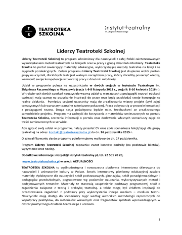Liderzy Teatroteki Szkolnej Liderzy Teatroteki Szkolnej to program szkoleniowy dla nauczycieli z całej Polski zainteresowanych wykorzystaniem metod teatralnych na lekcjach oraz w pracy z grupą dzieci lub młodzieży. Teatroteka Szkolna to portal zawierający materiały edukacyjne, wykorzystujące metody teatralne na lekcji i na zajęciach pozalekcyjnych. Celem programu Liderzy Teatroteki Szkolnej jest skupienie wokół portalu grupy nauczycieli, dla których teatr jest ważnym narzędziem pracy, którzy chcieliby poszerzyć wiedzę, wzmocnić swoje kompetencje w twórczej pracy z dziećmi i młodzieży. Udział w programie polega na uczestnictwie w dwóch sesjach w Instytucie Teatralnym im. Zbigniewa Raszewskiego w Warszawie (sesja I: 6-8 listopada 2015 r., sesja II: 8-10 kwietnia 2016 r.). W trakcie tych dwóch spotkań nauczyciele wezmą udział w warsztatach z pedagogiki teatru i edukacji twórczej mają szansę na pozyskanie inspiracji do pracy oraz będą przekładać swoje koncepcje na realne działania. Pomiędzy sesjami uczestnicy mają do zrealizowania własny projekt (cykl zajęć tematycznych lub warsztaty teatralne zakończone pokazem). Praca odbywa się w procesie konsultacji z pedagogami teatru. Druga sesja poświęcona będzie m.in. feedbackowi ze zrealizowanego samodzielnie projektu. Program ma zachęcić do korzystania z materiałów umieszczonych na portalu Teatroteka Szkolna, szerzenia informacji o portalu oraz dodawania własnych scenariuszy zajęć do treści zamieszczonych w serwisie. Aby zgłosić swój udział w programie, należy przesłać CV oraz szkic scenariusza lekcji/zajęć dla grupy teatralnej na adres: [email protected] do dn. 26 października 2015 r. O zakwalifikowaniu się do programu poinformujemy mailowo do dn. 27 października. Program Liderzy Teatroteki Szkolnej zapewnia: zwrot kosztów podróży (na podstawie biletów), wyżywienie oraz nocleg. Dodatkowe informacje: mszpak@ instytut-teatralny.pl, tel. 22 501 70 20, www.teatrotekaszkolna.pl w sekcji: AKTUALNOŚCI TEATROTEKA SZKOLNA to ogólnodostępna i nowoczesna platforma internetowa skierowana do nauczycieli i animatorów kultury w Polsce. Serwis internetowy platformy edukacyjnej zawiera materiały dydaktyczne dla nauczycieli szkół podstawowych, gimnazjów, szkół ponadgimnazjalnych i pedagogów przedszkolnych, pogrupowane wg poziomów nauczania, wykorzystywanych metod i podejmowanych tematów. Materiały te stanowią uzupełnienie podstawy programowej szkół o zagadnienia związane z teorią i praktyką teatralną, a także mogą być źródłem inspiracji do przedstawiania zagadnień z podstawy przy wykorzystaniu innego medium – medium teatru. Nauczyciele mają dostęp do scenariuszy zajęć według autorskich metodologii zaproszonych do współpracy praktyków, do materiałów wizualnych oraz fragmentów spektakli wprowadzających w obszar praktycznego działania teatralnego z uczniami. 1 SESJA I – PROGRAM: 6 listopada 2015 r (piątek) 15.30-16.00 Wprowadzenie do programu LIDERZY TEATROTEKI SZKOLNEJ (Magdalena Szpak, Instytut Teatralny) Przedstawienie i omówienie programu. 16.00-20.00 Słowa i gesty – warsztat inspiracji (Maria Parczewska, Laboratorium Edukacji Twórczej, Centrum Sztuki Współczesnej) Żeby nie zdradzać zbyt wielu szczegółów użyję tylko kilku słów-kluczy ważnych w praktyce Laboratorium Edukacji Twórczej, które współtworzę od ponad 25 lat. Są to między innymi: doświadczanie i doświadczenie, relacje, indywidualność, uważność, refleksja, ekspresja, no i oczywiście radość z działania. Może ważne, by powiedzieć w tym miejscu, że aby brać udział w tych działaniach nie trzeba być uzdolnionym plastycznie. Niczego też nie oceniamy, bo to, co proponuję, wymyka się zewnętrznej ocenie. Będzie aktywnie, dynamicznie, ale i kameralnie. Mam nadzieję, że i miło, i ciekawie. Do zobaczenia wiec, Maria Parczewska. 20.00 -21.00 Kolacja 7 listopada 2015 r (sobota) 9.00 –12.00 Od inspiracji do realizacji – warsztat z elementami coachingu (Anna Szapert) Jak przekuwać ciekawe pomysły i inspiracje w działania? Jak skutecznie wprowadzać innowacje w naszym otoczeniu? Co nas motywuje i wspiera w osiąganiu celów? Ten wzbogacony elementami coachingu warsztat pozwoli uczestnikom wybrać i przygotować do realizacji najciekawsze innowacje edukacyjne. Zajrzymy w głąb mózgu żeby lepiej zrozumieć proces zmiany, nabywania i podtrzymywania nowych umiejętności. Przyjrzymy się naszym myślom i przekonaniom, zastanowimy się nad tym jak skonstruowana jest motywacja. Nauczymy się projektowania celów i określania zasobów. 13.00-14.00 Spektakl: Księga Niewidzialna w reż. Roberta Jarosza, Teatr Guliwer 14.30-15.30 Obiad 16.30-18.30 Warsztaty do spektaklu „Krzyczcie, Chiny” (Dominika Szulc, Teatr Powszechny im. Z. Hübnera, Magdalena Szpak, Instytut Teatralny) Warsztaty wprowadzające do spektaklu w reż. Pawła Łysaka. Próba wejścia w język i tematykę przedstawienia poprzez projektowanie sytuacji twórczych. 19.00-21.30 Spektakl Krzyczcie, Chiny! w reż. Pawła Łysaka (Teatr Powszechny) 8 listopada 2015 r. 9.00 – 13.00 Od pomysłu do spektaklu – o budowaniu procesu teatralnego bez scenariusza (Justyna Czarnota, Magdalena Szpak – Instytut Teatralny) 2 W pracy teatralnej z amatorami, czyli także z naszymi uczniami, najważniejsze jest umożliwienie im twórczej pracy, czerpanie z tego, co ich interesuje, co wydaje im się istotne. Podczas warsztatu poznamy jedną z metod budowania spektaklu bez wykorzystania gotowego scenariusza. 13.30-14.30 Obiad Wyjazd PROWADZĄCY WARSZTATY: Justyna Czarnota – pedagog teatru, pasjonatka teatru dla dzieci i młodzieży. Absolwentka filologii polskiej ze specjalnością nauczycielską i teatrologiczną Uniwersytetu Marii Curie-Skłodowskiej w Lublinie i podyplomowych studiów „Literatura i książka dla dzieci i młodzieży wobec wyzwań nowoczesności” na Uniwersytecie Warszawskim. Od 