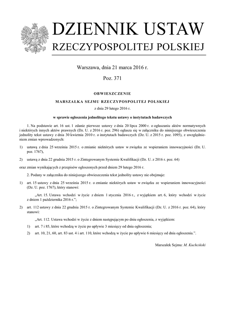 DZIENNIK USTAW RZECZYPOSPOLITEJ POLSKIEJ Warszawa, dnia 21 marca 2016 r. Poz. 371 O B W IE S ZC ZE N I E M ARS ZA ŁK A S EJ M U R ZE C ZY P O S PO LI T EJ PO L SK I EJ z dnia 29 lutego 2016 r. w sprawie ogłoszenia jednolitego tekstu ustawy o instytutach badawczych 1. Na podstawie art. 16 ust. 1 zdanie pierwsze ustawy z dnia 20 lipca 2000 r. o ogłaszaniu aktów normatywnych i niektórych innych aktów prawnych (Dz. U. z 2016 r. poz. 296) ogłasza się w załączniku do niniejszego obwieszczenia jednolity tekst ustawy z dnia 30 kwietnia 2010 r. o instytutach badawczych (Dz. U. z 2015 r. poz. 1095), z uwzględnieniem zmian wprowadzonych: 1) ustawą z dnia 25 września 2015 r. o zmianie niektórych ustaw w związku ze wspieraniem innowacyjności (Dz. U. poz. 1767), 2) ustawą z dnia 22 grudnia 2015 r. o Zintegrowanym Systemie Kwalifikacji (Dz. U. z 2016 r. poz. 64) oraz zmian wynikających z przepisów ogłoszonych przed dniem 29 lutego 2016 r. 2. Podany w załączniku do niniejszego obwieszczenia tekst jednolity ustawy nie obejmuje: 1) art. 15 ustawy z dnia 25 września 2015 r. o zmianie niektórych ustaw w związku ze wspieraniem innowacyjności (Dz. U. poz. 1767), który stanowi: „Art. 15. Ustawa wchodzi w życie z dniem 1 stycznia 2016 r., z wyjątkiem art. 6, który wchodzi w życie z dniem 1 października 2016 r.”; 2) art. 112 ustawy z dnia 22 grudnia 2015 r. o Zintegrowanym Systemie Kwalifikacji (Dz. U. z 2016 r. poz. 64), który stanowi: „Art. 112. Ustawa wchodzi w życie z dniem następującym po dniu ogłoszenia, z wyjątkiem: 1) art. 7 i 85, które wchodzą w życie po upływie 3 miesięcy od dnia ogłoszenia; 2) art. 10, 21, 60, art. 83 ust. 4 i art. 110, które wchodzą w życie po upływie 6 miesięcy od dnia ogłoszenia.”. Marszałek Sejmu: M. Kuchciński Dziennik Ustaw –2– Poz. 371 Załącznik do obwieszczenia Marszałka Sejmu Rzeczypospolitej Polskiej z dnia 29 lutego 2016 r. (poz. 371) US T AW A z dnia 30 kwietnia 2010 r. o instytutach badawczych Rozdział 1 Przepisy ogólne Art. 1. 1. Instytutem badawczym w rozumieniu ustawy jest państwowa jednostka organizacyjna, wyodrębniona pod względem prawnym, organizacyjnym i ekonomiczno-finansowym, która prowadzi badania naukowe i prace rozwojowe ukierunkowane na ich wdrożenie i zastosowanie w praktyce, zwana dalej „instytutem”. 2. Instytut nabywa osobowość prawną z chwilą wpisania do Krajowego Rejestru Sądowego. 3. Instytut ma prawo używania okrągłej pieczęci z wizerunkiem godła Rzeczypospolitej Polskiej pośrodku i nazwą instytutu w otoku. Art. 2. 1. Do podstawowej działalności instytutu należy: 1) prowadzenie badań naukowych i prac rozwojowych; 2) przystosowywanie wyników badań naukowych i prac rozwojowych do potrzeb praktyki; 3) wdrażanie wyników badań naukowych i prac rozwojowych. 2. W związku z prowadzoną działalnością podstawową instytut może: 1) upowszechniać wyniki badań naukowych i prac rozwojowych; 2) wykonywać badania i analizy oraz opracowywać opinie i ekspertyzy w zakresie prowadzonych badań naukowych i prac rozwojowych; 3) opracowywać oceny dotyczące stanu i rozwoju poszczególnych dziedzin nauki i techniki oraz sektorów gospodarki, które wykorzystują wyniki badań naukowych i prac rozwojowych oraz w zakresie wykorzystywania w kraju osiągnięć światowej nauki i techniki; 4) prowadzić działalność normalizacyjną, certyfikacyjną i aprobacyjną; 5) prowadzić i rozwijać bazy danych związane z przedmiotem działania instytutu; 6) prowadzić działalność w zakresie informacji naukowej, technicznej i ekonomicznej, wynalazczości oraz ochrony własności przemysłowej i intelektualnej, a także wspierającej innowacyjność przedsiębiorstw; 7) wytwarzać w związku z prowadzonymi badaniami naukowymi i pracami rozwojowymi aparaturę, urządzenia, materiały i inne wyroby oraz prowadzić walidację metod badawczych, pomiarowych oraz kalibrację aparatury; 8) prowadzić działalność wydawniczą związaną z prowadzonymi badaniami naukowymi i pracami rozwojowymi. 3. Instytut, poza zadaniami, o których mowa w ust. 1 i 2, może prowadzić: 1) studia podyplomowe i doktoranckie, związane z prowadzonymi przez instytut badaniami naukowymi i pracami rozwojowymi, jeżeli posiada uprawnienia do nadawania stopni naukowych oraz odpowiednie zaplecze i warunki materialno-techniczne; 2) inne formy kształcenia, w tym szkolenia i kursy dokształcające. 4. Instytut może prowadzić działalność inną niż wymieniona w ust. 1–3. Działalność ta jest wyodrębniona pod względem finansowym i rachunkowym z działalności, o której mowa w ust. 1–3. Art. 3. Instytut prowadzący badania naukowe i prace rozwojowe w dziedzinie nauk medycznych uczestniczy w systemie ochrony zdrowia. Dziennik Ustaw –3– Poz. 371 Rozdział 2 Tworzenie, łączenie, podział, reorganizacja, przekształcanie i likwidacja instytutów Art. 4. Instytut może być utworzony, jeżeli zaistnieje potrzeba prowadzenia w danej dziedzinie działalności, o której mowa w art. 2 ust. 1 i 2, oraz zostanie zapewniona niezbędna kadra o odpowiednich kwalifikacjach oraz aparatura badawcza, laboratoryjna, potencjał informatyczny i inne niezbędne warunki materialno-techniczne. Art. 5. 1. Rada Ministrów tworzy instytut, w drodze rozporządzenia, na wniosek ministra właściwego ze względu na planowaną działalność instytutu, złożony po zasięgnięciu opinii ministra właściwego do spraw nauki. 2. Rozporządzenie o utworzeniu instytutu określa przedmiot i zakres działania instytutu, jego nazwę i siedzibę oraz składniki majątkowe, w tym tytuł prawny do gruntów oraz budynków i urządzeń trwale z nimi związanych. 3. Ministrem nadzorującym instytut jest minister wskazany w rozporządzeniu Rady Ministrów, o którym mowa w ust. 1, zwany dalej „ministrem nadzorującym”. 4. W akcie o utworzeniu instytutu wskazuje się mienie, w które wyposaża się instytut. Akt ten wskazuje także for