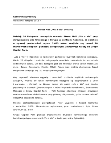 Komunikat prasowy Warszawa, listopad 2011 r. Street Mall „Vis a Vis” otwarty Dzisiaj, 30 listopada, uroczyście otwarto Street Mall „Vis a Vis” przy skrzyżowaniu ulic Chrobrego i Struga w centrum Radomia. W obiekcie o łącznej powierzchni najmu 3 663 mkw. znajdzie się ponad 20 markowych sklepów i punktów usługowych. Inwestycja należy do Grupy Capital Park. „Vis a Vis” w Radomiu to kameralny parterowy budynek handlowo-usługowy. Około 20 sklepów i punktów usługowych umożliwia załatwienie tu wszystkich codziennych spraw. Od dziś dostępna jest dla klientów oferta takich marek jak m.in.: Tesco, Rossmann, Empik, SMYK, Pepco oraz pralnia chemiczna. Przed budynkiem znajduje się 100 miejsc parkingowych. Aby zapewnić klientom wygodę i umożliwić zrobienie szybkich codziennych zakupów, wejścia do lokali handlowych dostępne są bezpośrednio z ulicy i parkingu. – Format, na którym opiera się nasze „Vis a Vis” jest bardzo popularny w Stanach Zjednoczonych – mówi Wojciech Nowakowski, Investment Manager z Grupy Capital Park. – Taki koncept obejmuje nieduże, przyjazne centrum handlowe zlokalizowane przy głównej ulicy miasta, gdzie można załatwić wszystkie codzienne sprawy. Projekt architektoniczny przygotowali Piotr Wypchło i Robert Kornatka z Archi-Rad 2000. Generalnym wykonawcą prac budowlanych była firma IDS–BUD Sp. z o.o. Grupa Capital Park planuje zrealizowanie drugiego kameralnego handlowego typu street mall „Vis a Vis” w Łodzi przy ulicy Zgierskiej. centrum Informacje dodatkowe Inwestor Grupa Capital Park aktywnie działa na polskim rynku nieruchomości od 2003 roku, inwestując wspólnie z międzynarodowym funduszem private equity Patron Capital Partners, zarządzającym kapitałem w kwocie ponad 1,7 mld EUR. Od początku działalności Grupa Capital Park stworzyła portfel inwestycyjny obejmujący 72 aktywa o łącznej ukończonej oraz planowanej powierzchni około 308 830 mkw. brutto, z czego ponad 80% zlokalizowanych jest w Warszawie, czyli na jednym z najbardziej perspektywicznych rynków w Polsce. Grupa Capital Park jest jedną z czołowych i najbardziej dynamicznie rozwijających się firm inwestycyjnych działających na rynku nieruchomości w Polsce. Grupa jest jednym z największych deweloperów na polskim rynku nieruchomości biurowych oraz liderem rynku high-street w Polsce. Capital Park buduje i zarządza również nieruchomościami typu street mall, w ramach programu Vis à Vis oraz innymi powierzchniami handlowymi. Portfel nieruchomości Grupy obejmuje również kilka projektów mieszkaniowych. Grupa koncentruje się na nabywaniu nieruchomości ze znacznym potencjałem budowy wartości poprzez m.in. zmianę warunków zagospodarowania przestrzennego, uzyskanie pozwoleń na budowę, budowę nowych obiektów, przebudowę istniejących, lub też poprawę zarządzania istniejącymi budynkami. Więcej informacji na www.capitalpark.pl Klasyfikacja centrów handlowych Centrum handlowe Nieruchomość handlowa, która została zaplanowana, zbudowana oraz jest zarządzana jako jeden podmiot handlowy, składający się ze wspólnych części, o minimalnej powierzchni najmu (GLA) 5 000 mkw oraz składający się z minimum 10 sklepów. Retail park Obiekt handlowy zlokalizowany na obrzeżach miasta, posiadający kompleksową ofertę sklepów i usług. Wejścia do lokali dostępne są bezpośrednio z dużego parkingu, który zlokalizowany jest na zewnątrz obiektu. Oferta sklepów obejmuje produkty spożywcze, meble, wyposażenie wnętrz, produkty RTV/AGD. Hipermarket z galerią handlową Obiekt jednokondygnacyjny z dużym parkingiem oparty na głównym wielkopowierzchniowym operatorze spożywczym. Otoczony jest galerią kilku sklepów, bądź punktów usługowych. Oferuje szeroki asortyment produktów wszystkich branż. Street mall Jednokondygnacyjny kameralny obiekt (od 3 000 do 8 000 mkw.) zlokalizowany przy głównych ulicach miast. Formuła oparta na idei dostępności umożliwiająca szybkie codzienne zakupy. Wejście do sklepów i punktów usługowych jest bezpośrednio z ulicy bądź parkingu. Dzięki braku powierzchni wspólnych koszty eksploatacyjne dla najemców są znacząco niższe. High street Prestiżowa ulica handlowa w centrach miast, przy której gromadzą się sklepy z ofertą odzieży, butów i kosmetyków. Kontakt: Biuro prasowe Capital Park Joanna Cybulska [email protected] 609 716 113, 22 642 24 16