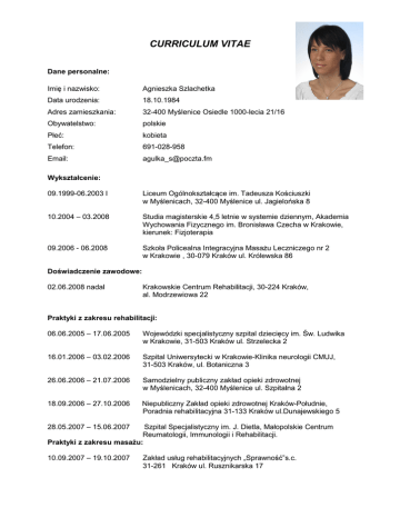CURRICULUM VITAE Dane personalne: Imię i nazwisko: Agnieszka Szlachetka Data urodzenia: 18.10.1984 Adres zamieszkania: 32-400 Myślenice Osiedle 1000-lecia 21/16 Obywatelstwo: polskie Płeć: kobieta Telefon: 691-028-958 Email: [email protected] Wykształcenie: 09.1999-06.2003 I Liceum Ogólnokształcące im. Tadeusza Kościuszki w Myślenicach, 32-400 Myślenice ul. Jagielońska 8 10.2004 – 03.2008 Studia magisterskie 4,5 letnie w systemie dziennym, Akademia Wychowania Fizycznego im. Bronisława Czecha w Krakowie, kierunek: Fizjoterapia 09.2006 - 06.2008 Szkoła Policealna Integracyjna Masażu Leczniczego nr 2 w Krakowie , 30-079 Kraków ul. Królewska 86 Doświadczenie zawodowe: 02.06.2008 nadal Krakowskie Centrum Rehabilitacji, 30-224 Kraków, al. Modrzewiowa 22 Praktyki z zakresu rehabilitacji: 06.06.2005 – 17.06.2005 Wojewódzki specjalistyczny szpital dziecięcy im. Św. Ludwika w Krakowie, 31-503 Kraków ul. Strzelecka 2 16.01.2006 – 03.02.2006 Szpital Uniwersytecki w Krakowie-Klinika neurologii CMUJ, 31-503 Kraków, ul. Botaniczna 3 26.06.2006 – 21.07.2006 Samodzielny publiczny zakład opieki zdrowotnej w Myślenicach, 32-400 Myślenice ul. Szpitalna 2 18.09.2006 – 27.10.2006 Niepubliczny Zakład opieki zdrowotnej Kraków-Południe, Poradnia rehabilitacyjna 31-133 Kraków ul.Dunajewskiego 5 28.05.2007 – 15.06.2007 Szpital Specjalistyczny im. J. Dietla, Małopolskie Centrum Reumatologii, Immunologii i Rehabilitacji. Praktyki z zakresu masażu: 10.09.2007 – 19.10.2007 Zakład usług rehabilitacyjnych „Sprawność”s.c. 31-261 Kraków ul. Rusznikarska 17 22.10.2007 – 07.12.2007 Szpital Specjalistyczny im. Józefa Dietla, 31-121 Kraków ul. Skarbowa 1, oddział chorób wewnętrznych 10.12.2007 – 25.01.2008 Szpital Specjalistyczny im. J. Dietla, 31-121 Kraków ul. Skarbowa 1, oddział reumatologii 11.02.2008 – 20.03.2008 Specjalny ośrodek szkolno-wychowawczy dla dzieci niewidomych i słabowidzących, 30-319 Kraków ul. Tyniecka 6, gabinet rehabilitacji ruchowej 26.03.2008 - 25.04.2008 Krakowskie Centrum Rehabilitacji, 30-224 Kraków ul. Modrzewiowa 22, gabinety masażu Wolontariat: 07.05.2007 04.05.2008 Maraton Cracovia, Kraków 2007 (praca w roli masażysty) Maraton Cracovia, Kraków 2008 (praca w roli masażysty) Osiągnięcia naukowe: 07.12.2007 - 08.12.2007 Udział w IV Ogólnopolskiej konferencji studenckich kół naukowych Fizjoterapii oraz zajęcie III miejsca za wygłoszenie prezentacji na temat „Wczesne rezultaty leczenia zachowawczego skoliozy idiopatycznej metodą gorsetowania dynamicznego SpineCor”. Języki obce: język angielski- dobra znajomość język niemiecki- na poziomie podstawowym Dodatkowe umiejętności: prawo jazdy kat. B, biegła znajomość komputera (Microsoft Office) Kursy: Kurs PNF- podstawowy prowadzony przez Renate Horst Kurs PNF- zaawansowany prowadzony przez Martine Schindler Kurs Tapingu Medycznego- Rene Clasen Kurs terapii manualnej N.A.P. –podstawowy (I i II) (Nerwowo mięśniowa i stawowo szkieletowa plastyczność) –Renata Horst Kurs terapii manualnej N.A.P. III w neurologii Kurs terapii manualnej N.A.P. IV w ortopedii Kurs Funkcjonalnej Osteopatii i Integracji wg Friedhelma Beckera Hansa de Jonga Kurs terapii manualnej Mulligana Kurs Mc Kenziego- moduł A ,B,C Zainteresowania: sporty (siatkówka, lekka atletyka, pływanie, fitness, narciarstwo), turystyka, taniec, muzyka